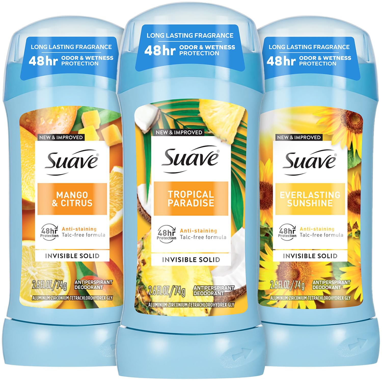 Suave Antiperspirant Deodorant for Women Variety 3-Pack – Tropical Paradise, Mango & Citrus + Everlasting Sunshine, Anti-Staining Invisible Solid, Talc-Free, 2.7 Oz Ea