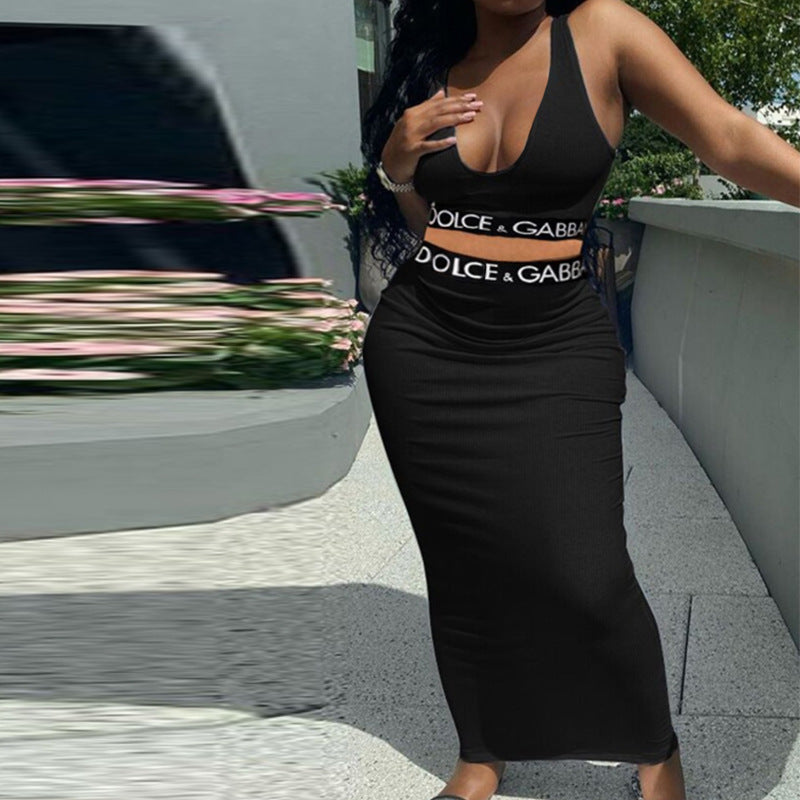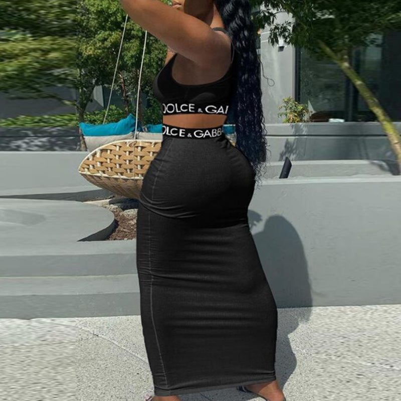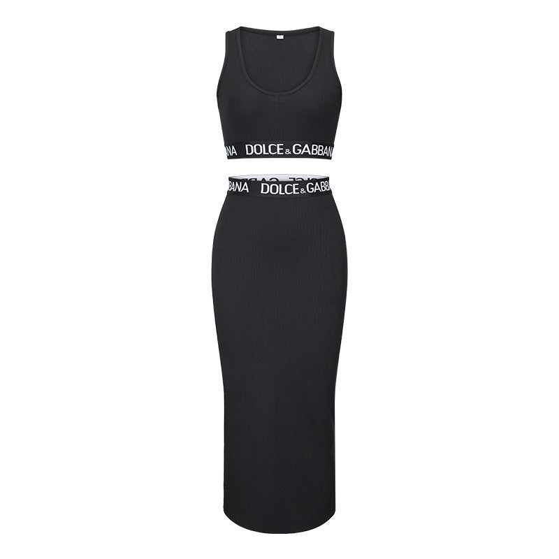 Summer Casual Vest High Waist Sheath Dress Letter Graphic Ribbon Casual Two Piece Set Women