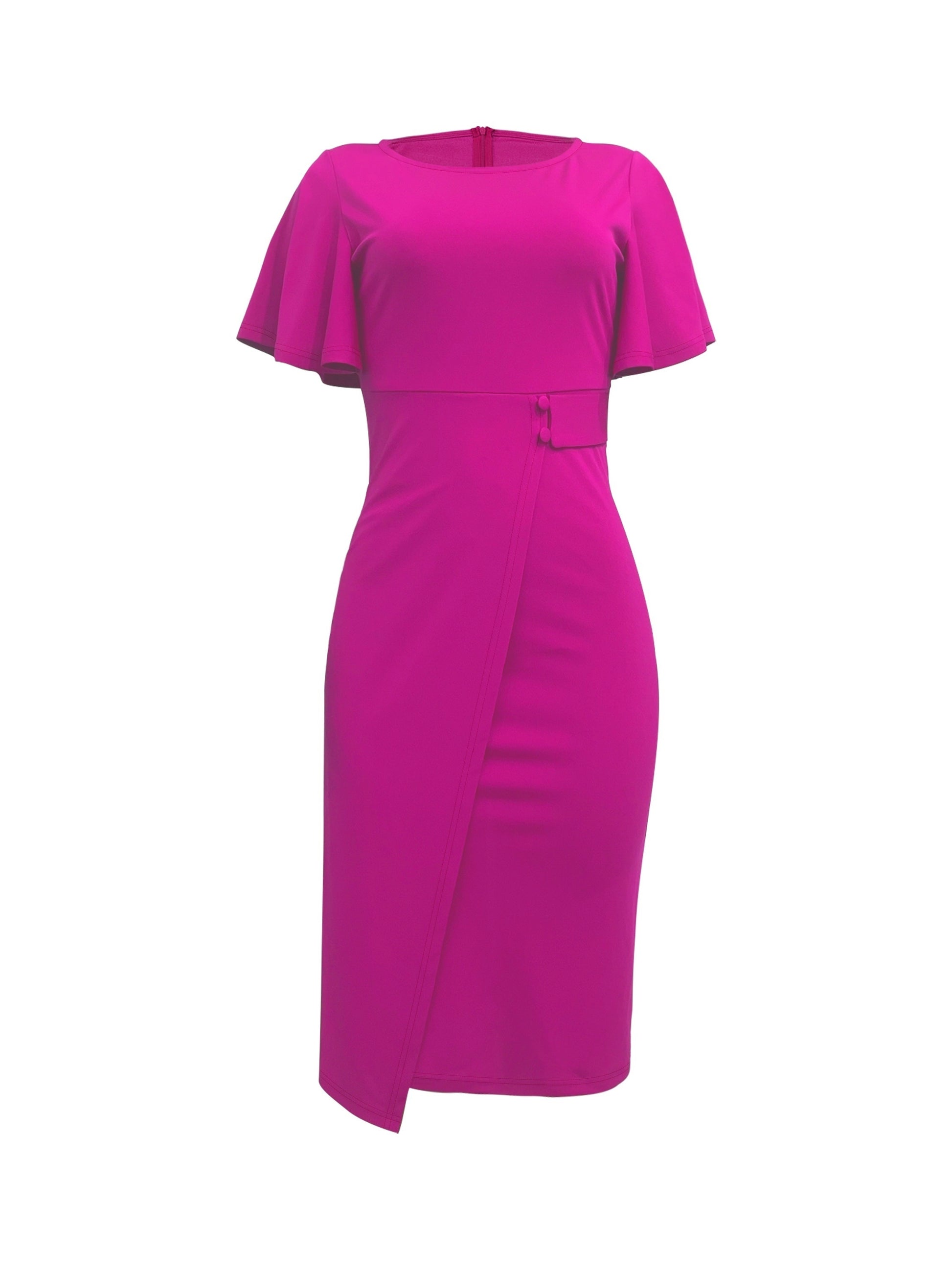 Summer Essential: Elegant Women's Crew Neck Fitted Midi Dress with Button Detail in Solid Color Polyester Spandex Knit Fabric