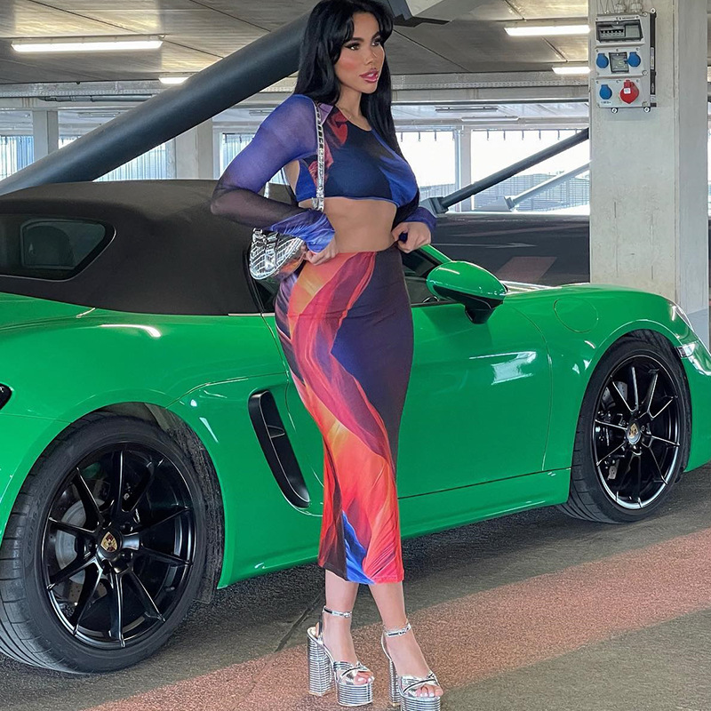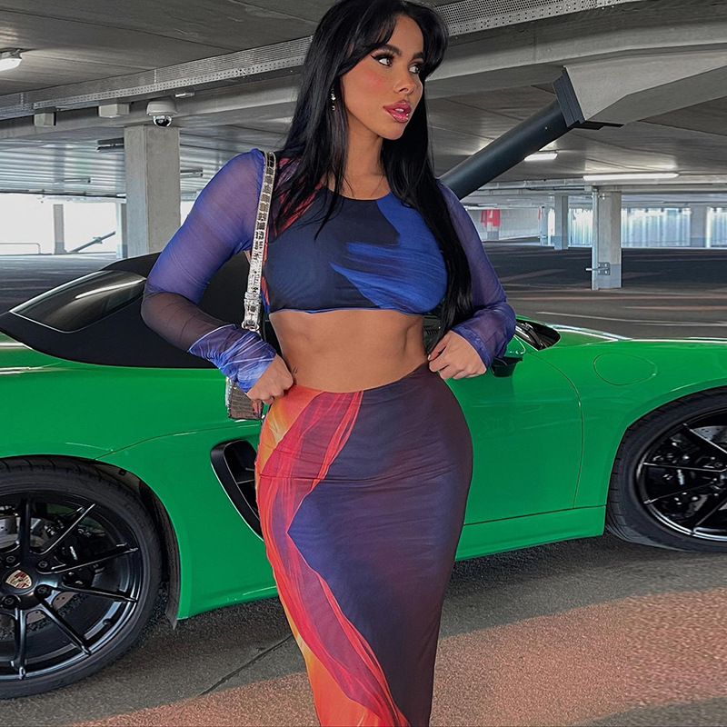 Summer Print Top Long Sleeve Backless Lace up Sheath Skirt Set Skirt Two Piece Suit Women