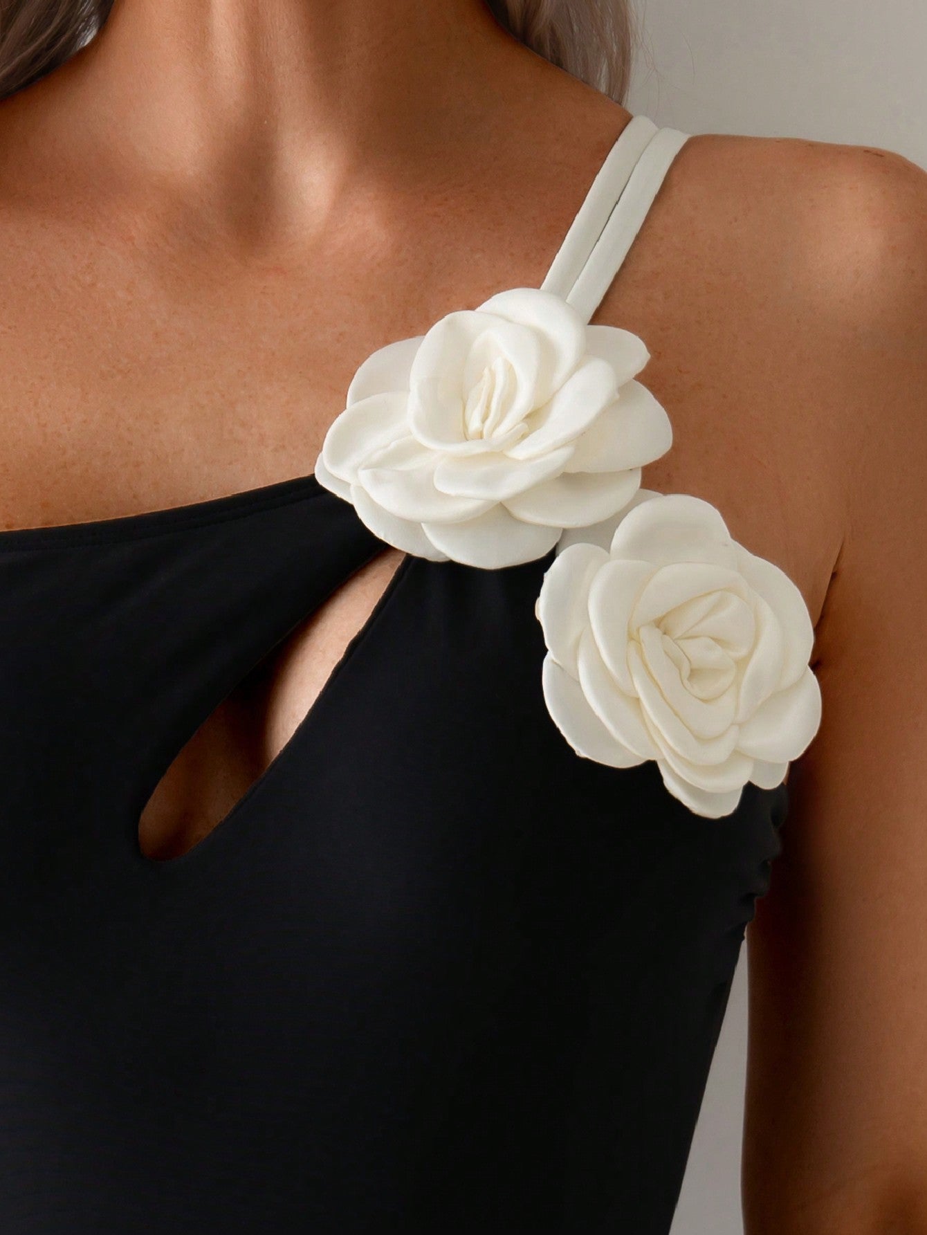 Swim Chiccia Women's Sexy Beach Outfit One-Piece Swimsuit, Soft Wireless Contrast Color 3D Floral Strap Jumpsuit For Summer Beach Vacation