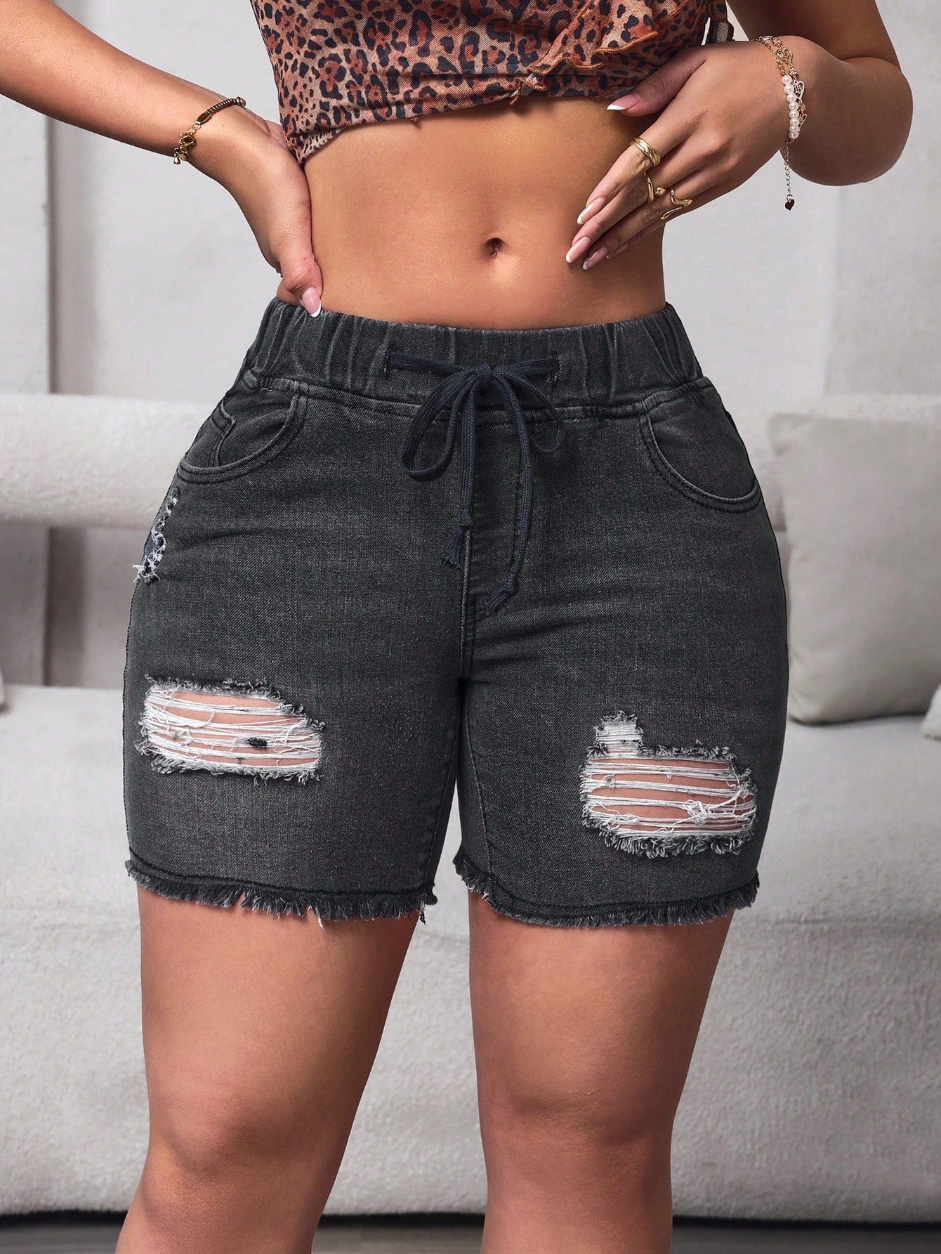 SXY Women Fashionable Solid Color Fleece Ripped Denim Shorts