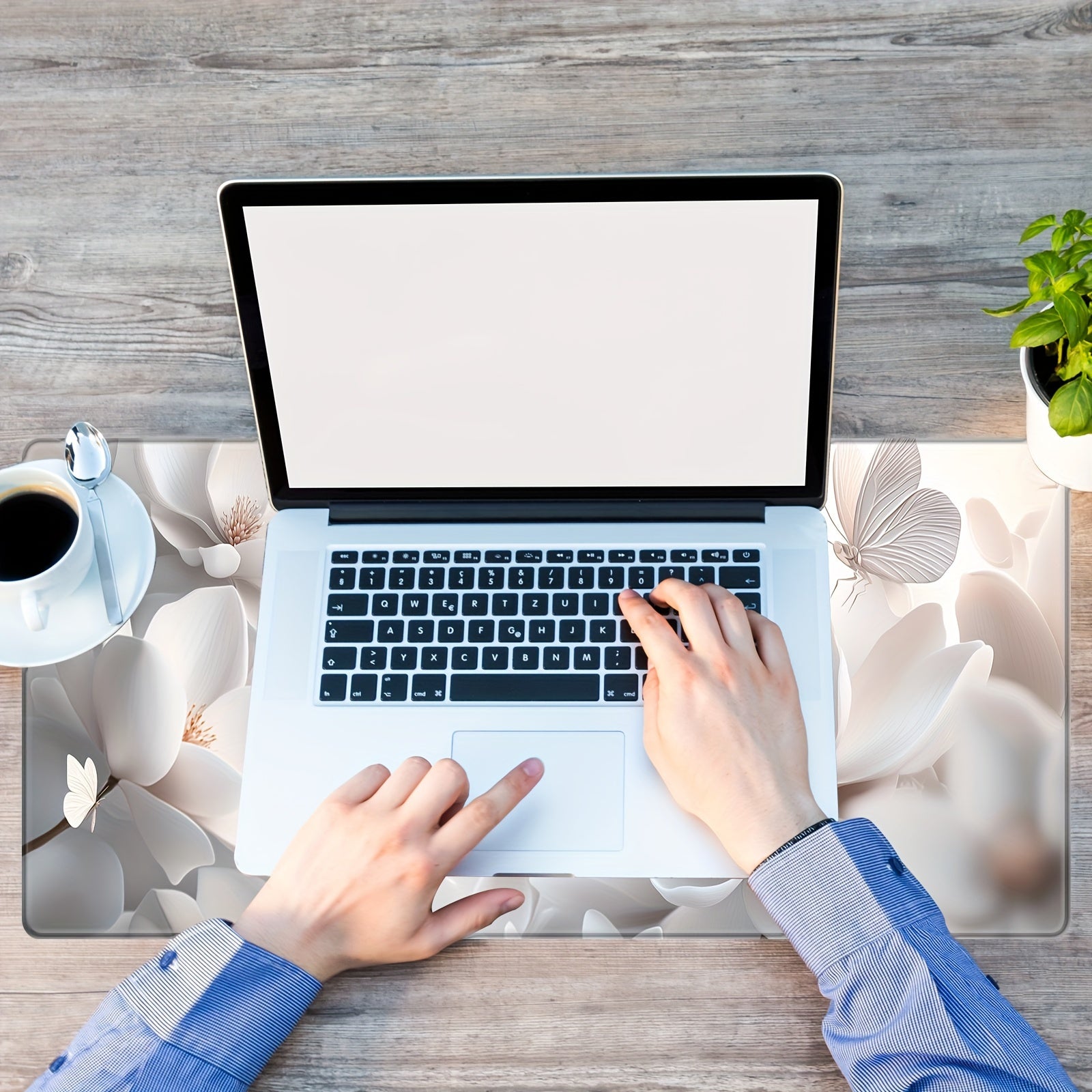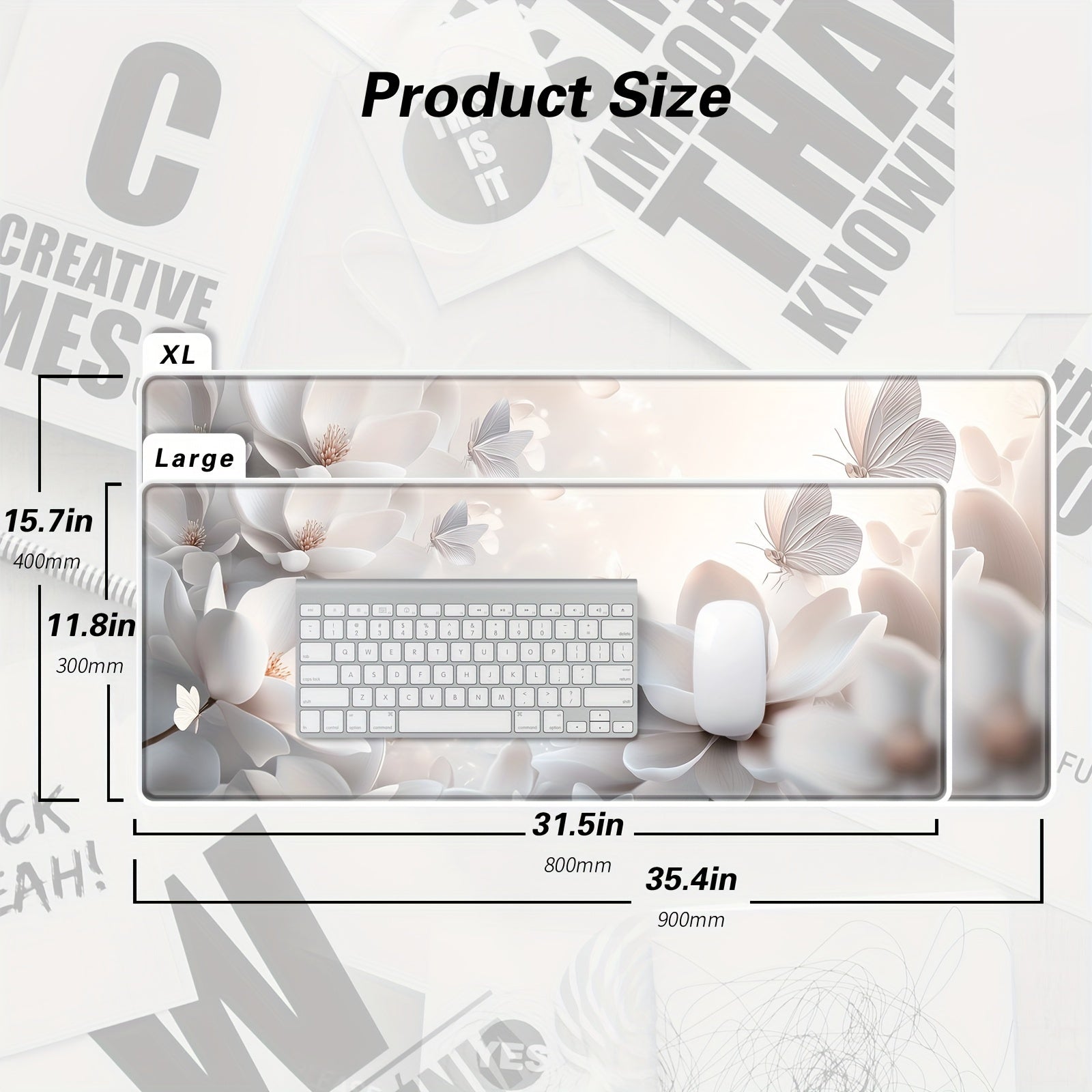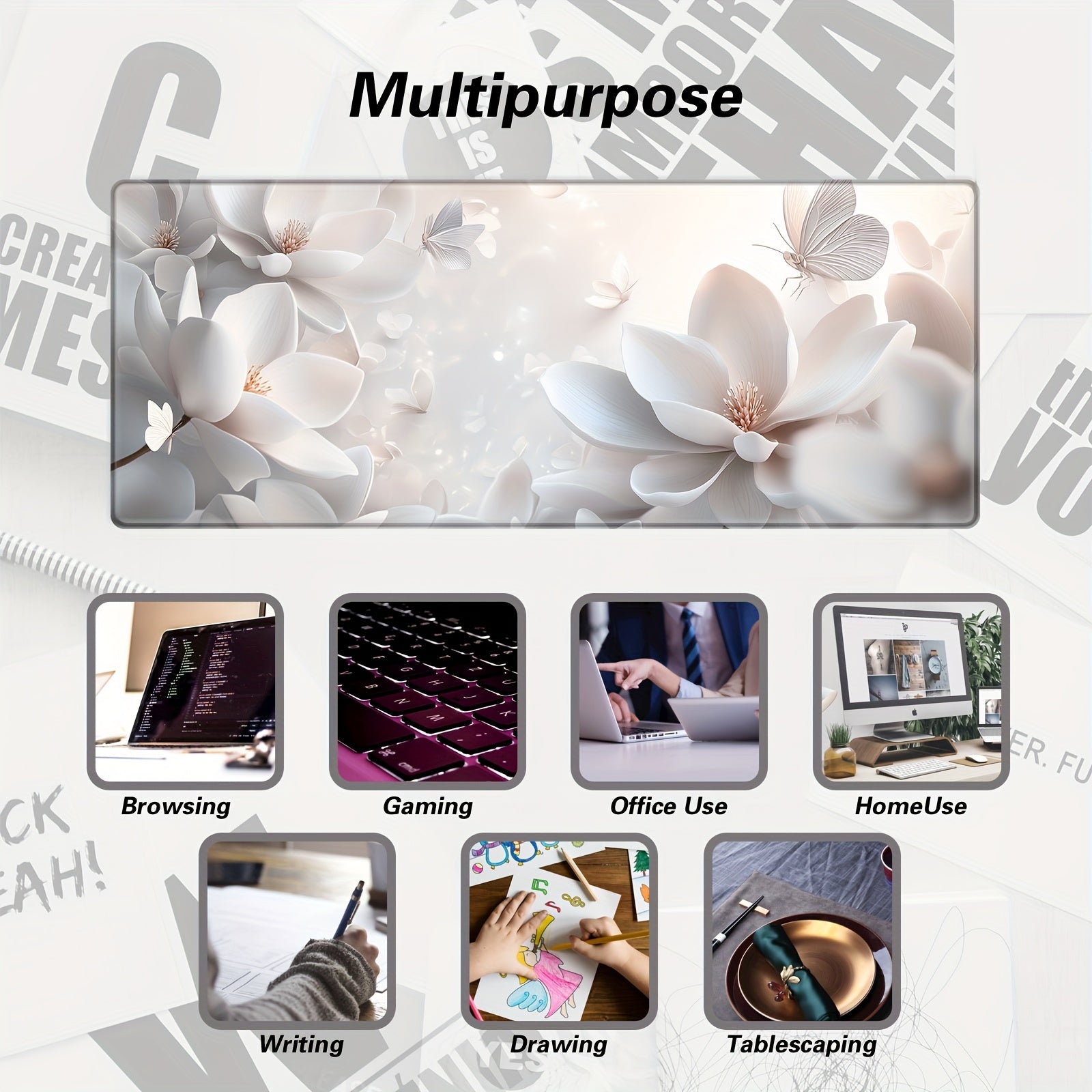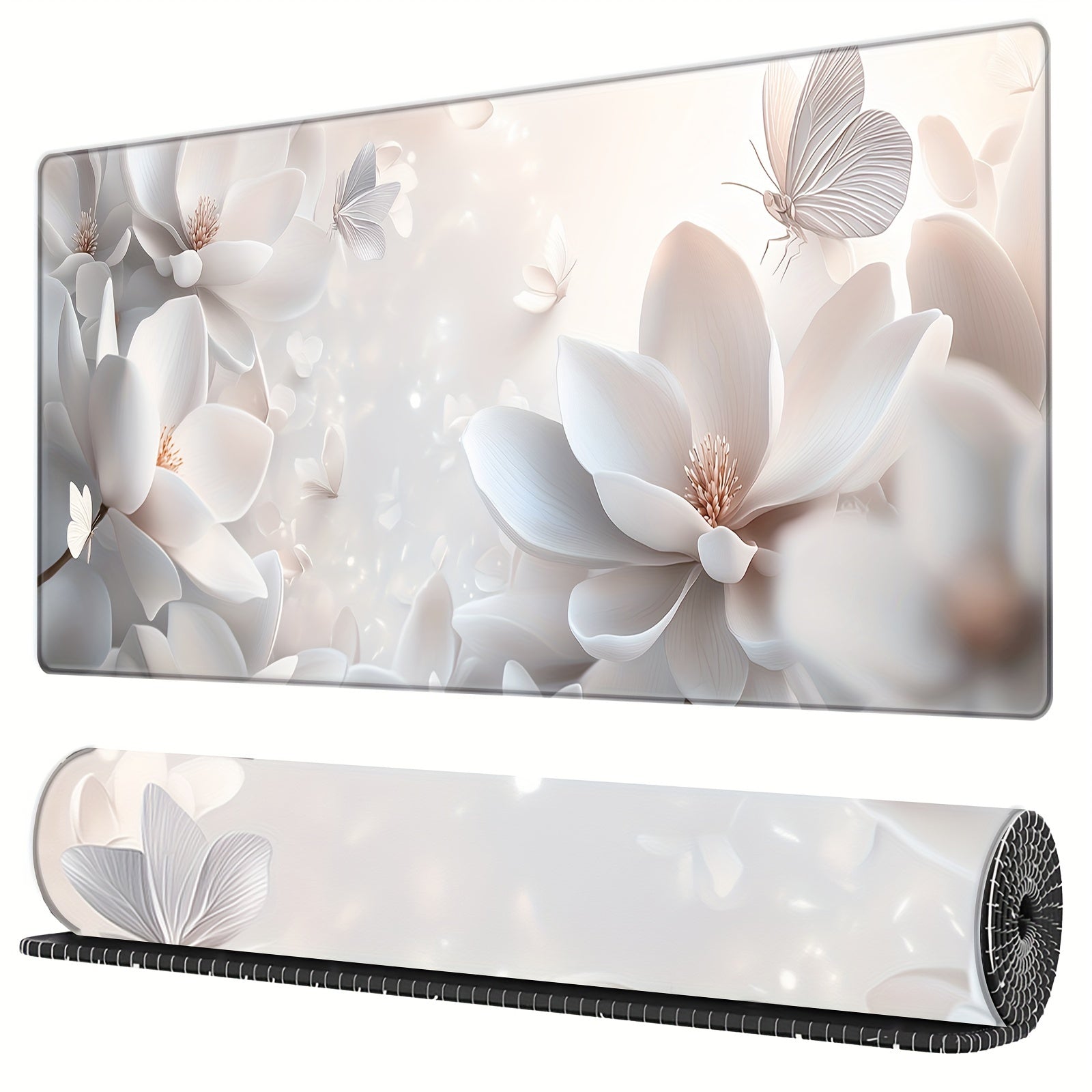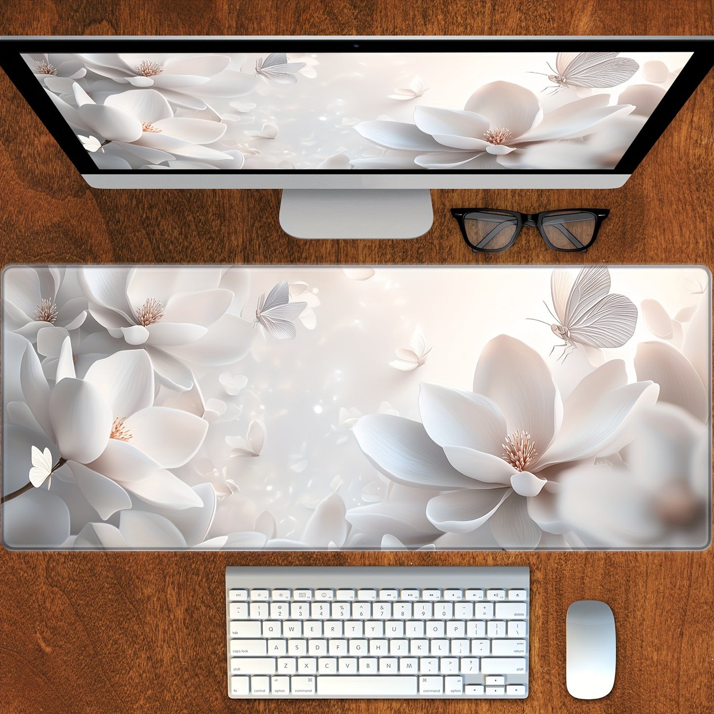 Tapis de bureau BHJLAXR avec motif de fleurs blanches, 35,4"x15,7", grand tapis de souris de jeu durable avec bords cousus, base en caoutchouc antidérapante, lavable, pour le travail à domicile au bureau