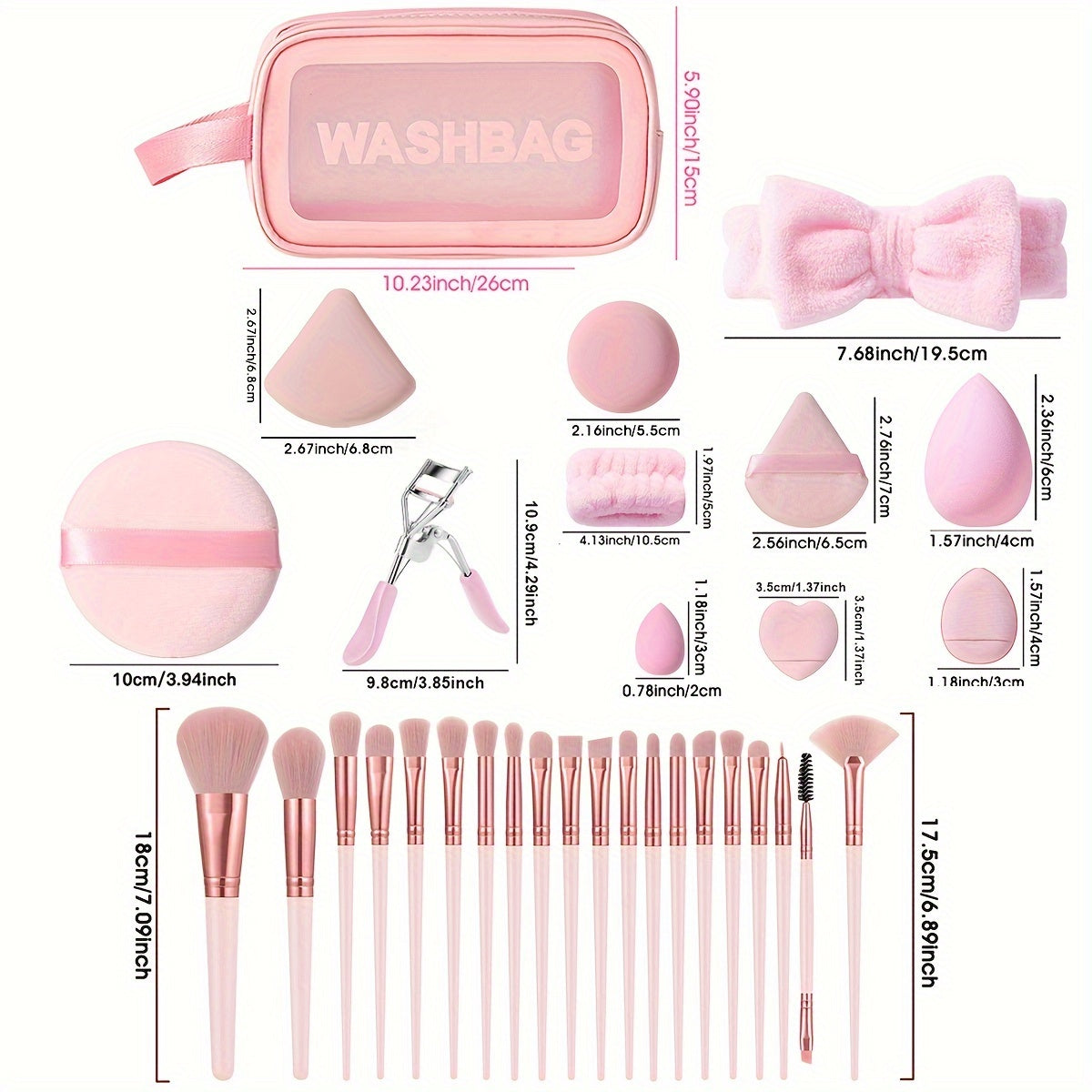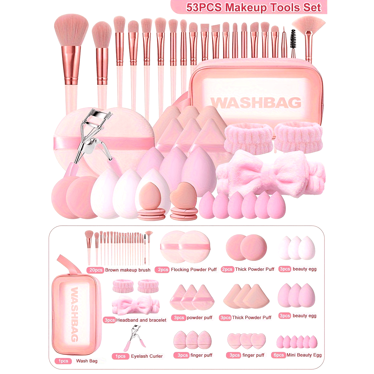 The 53pcs Makeup Tool Set Includes: 1 Multifunctional Waterproof Toiletry Makeup Bag, 20 Makeup Brushes, 6 Beauty Sponges, 6 Mini Beauty Sponges, 6 Triangular Powder Puffs, 6 Mini Cushion Puffs, 4 Round Powder Puffs, 1 Eyelash Curler, 1 Headband, And 2 Wr