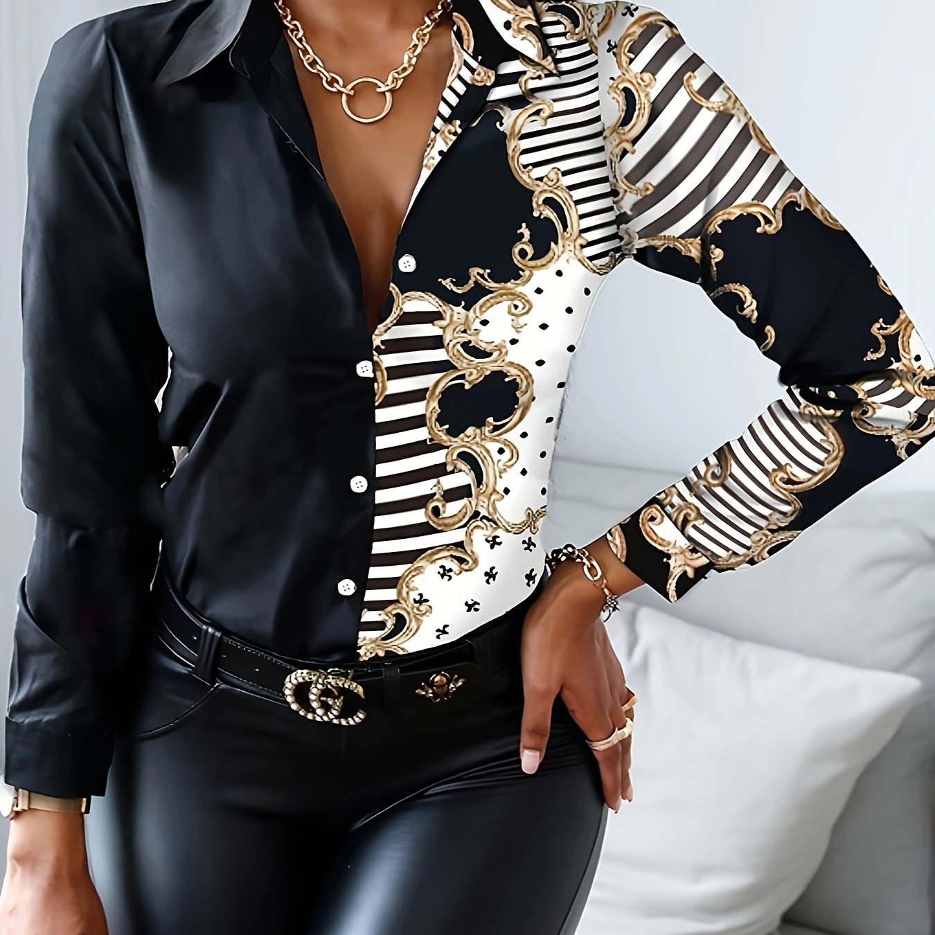 Tribal Print Button Up Shirt, Elegant Long Sleeve Collared Shirt For Spring & Fall, Women's Clothing