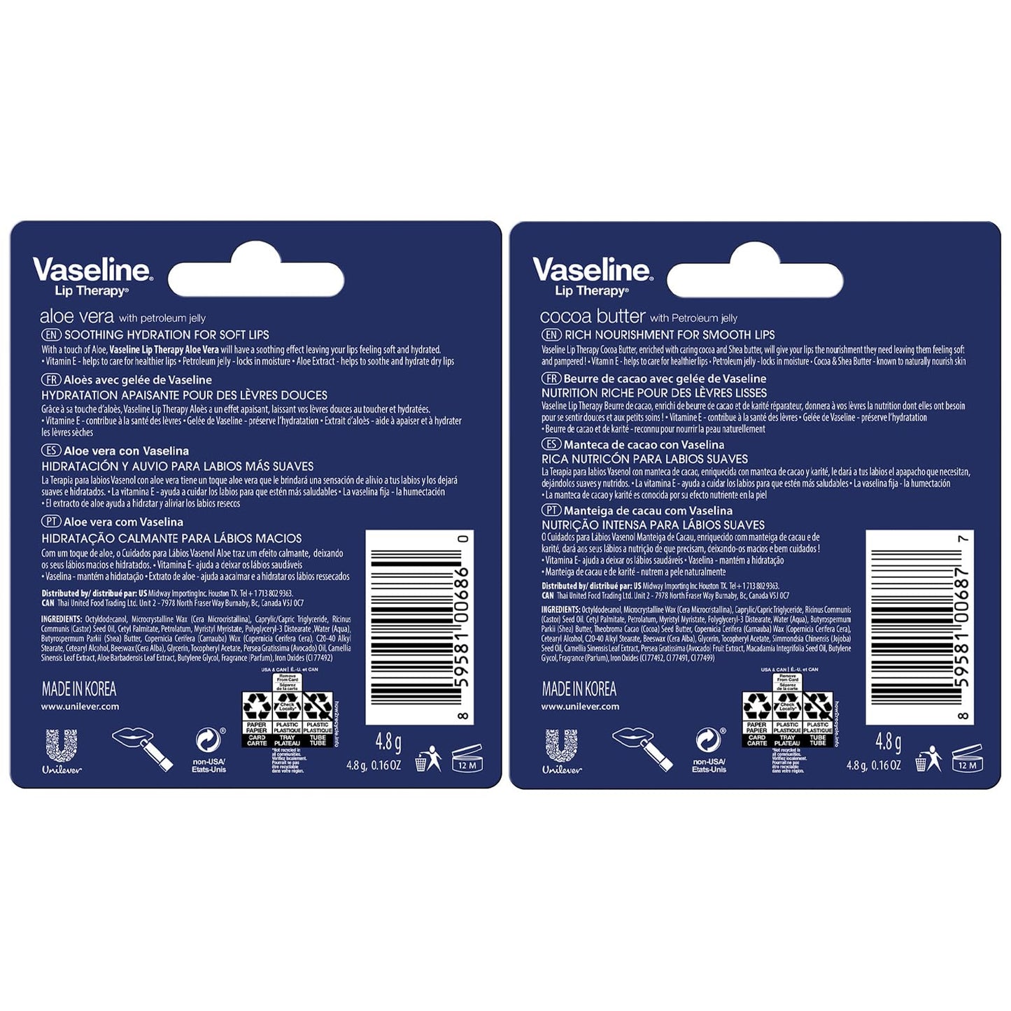 VASELINE LIP BALM: Enjoy two Original and two Aloe Vera lip balm sticks crafted with Vaseline Healing Jelly.