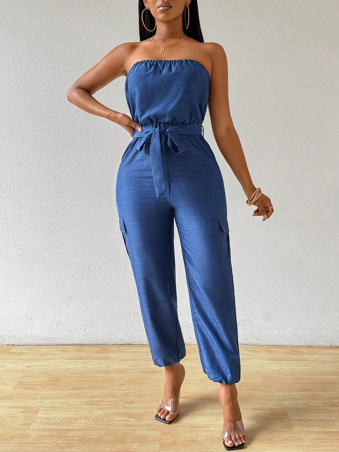 VaVaLuxe Women's Summer Casual Denim Effect Strapless Jumpsuit With Utility Design