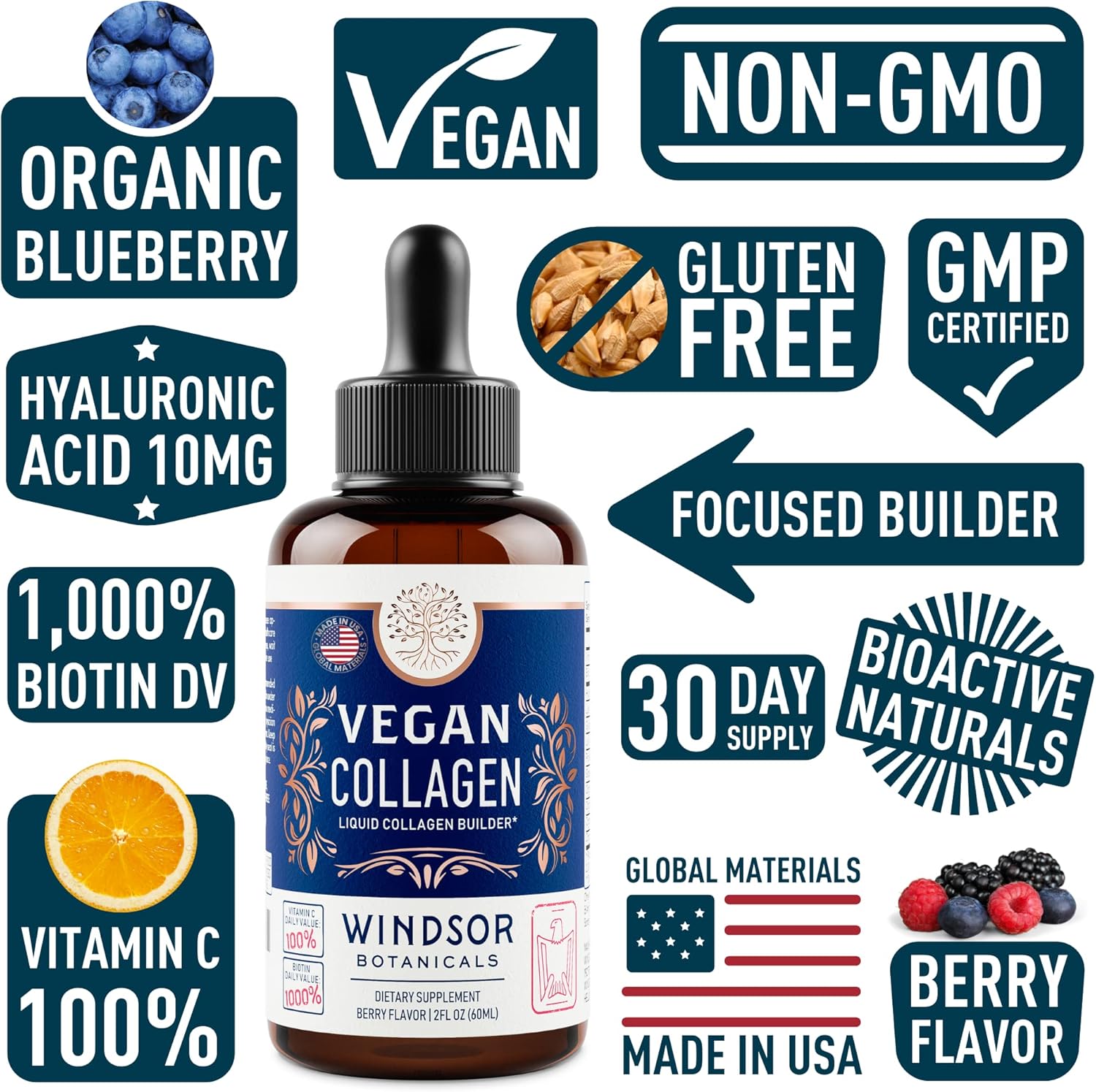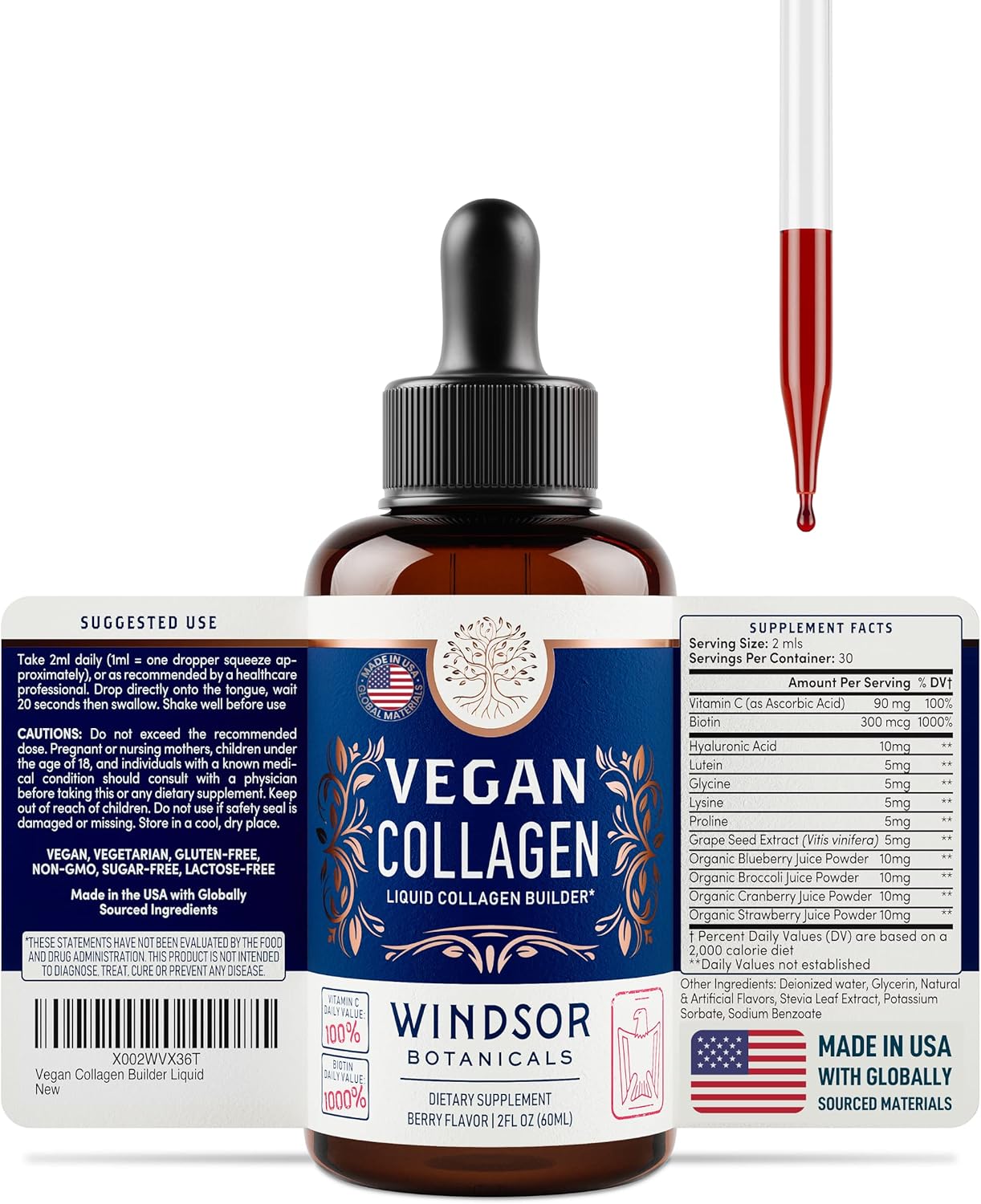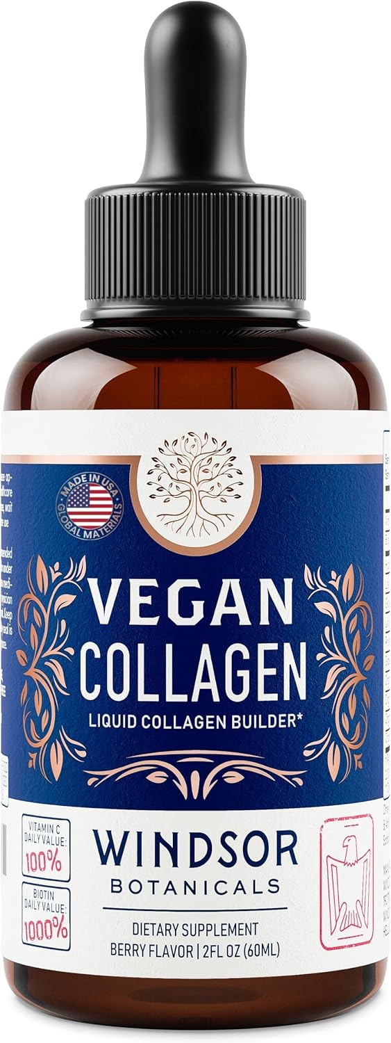 WINDSOR BOTANICALS Vegan Collagen Builder Liquid Supplement - Collagen Booster with Vitamin C, Biotin, Hyaluronic Acid & Amino Acids - Organic Fruit & Vegetable Blend - 60ml, 30 Day