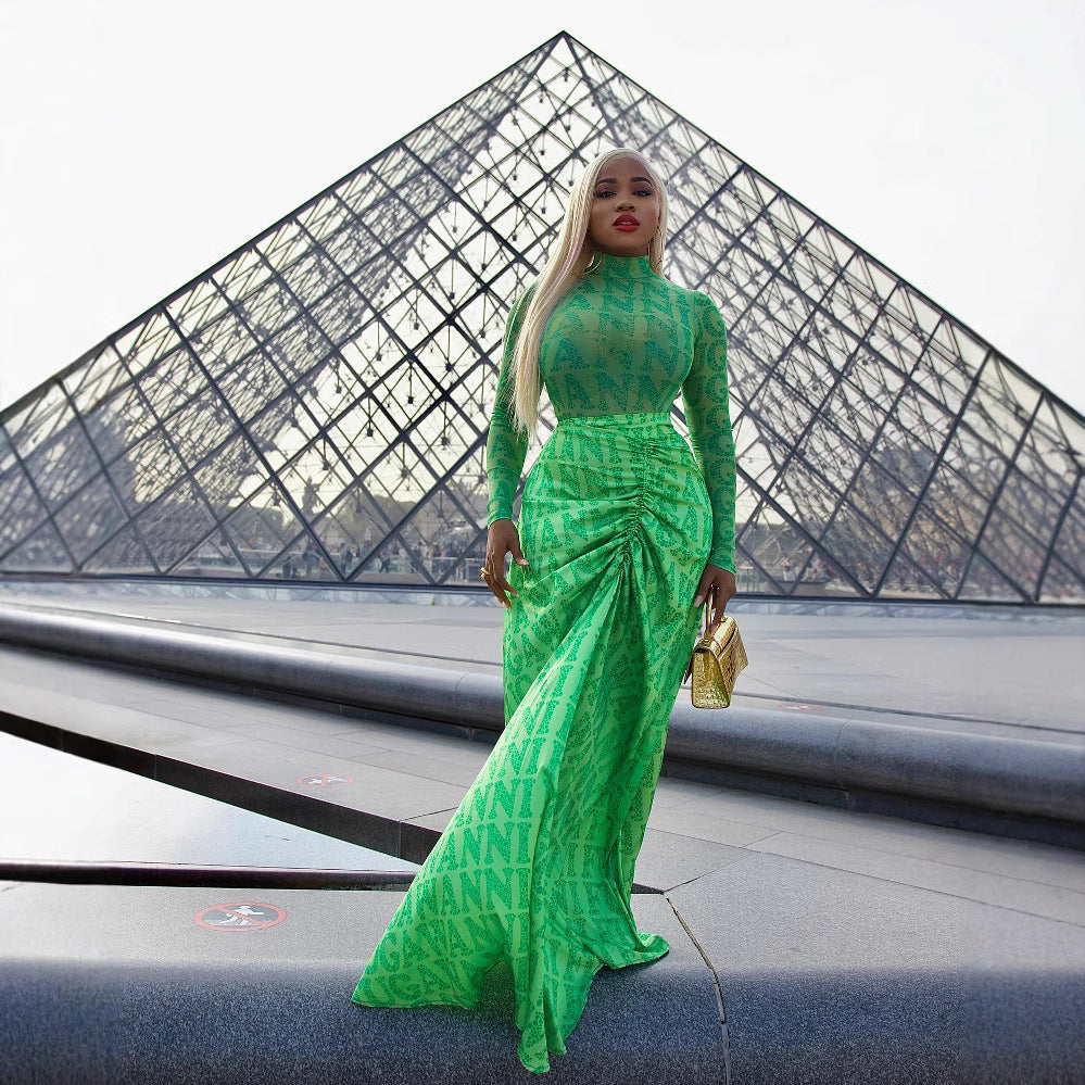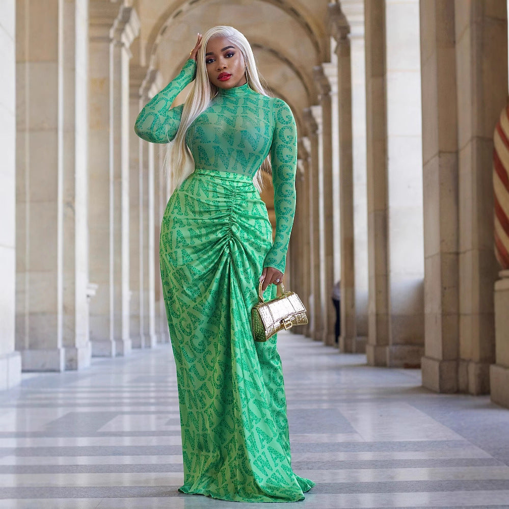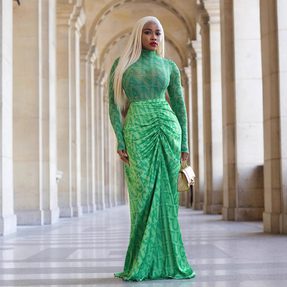 Women Clothing Autumn Winter Mesh Top Pleating Slim Fit Maxi Dress Two Piece Set