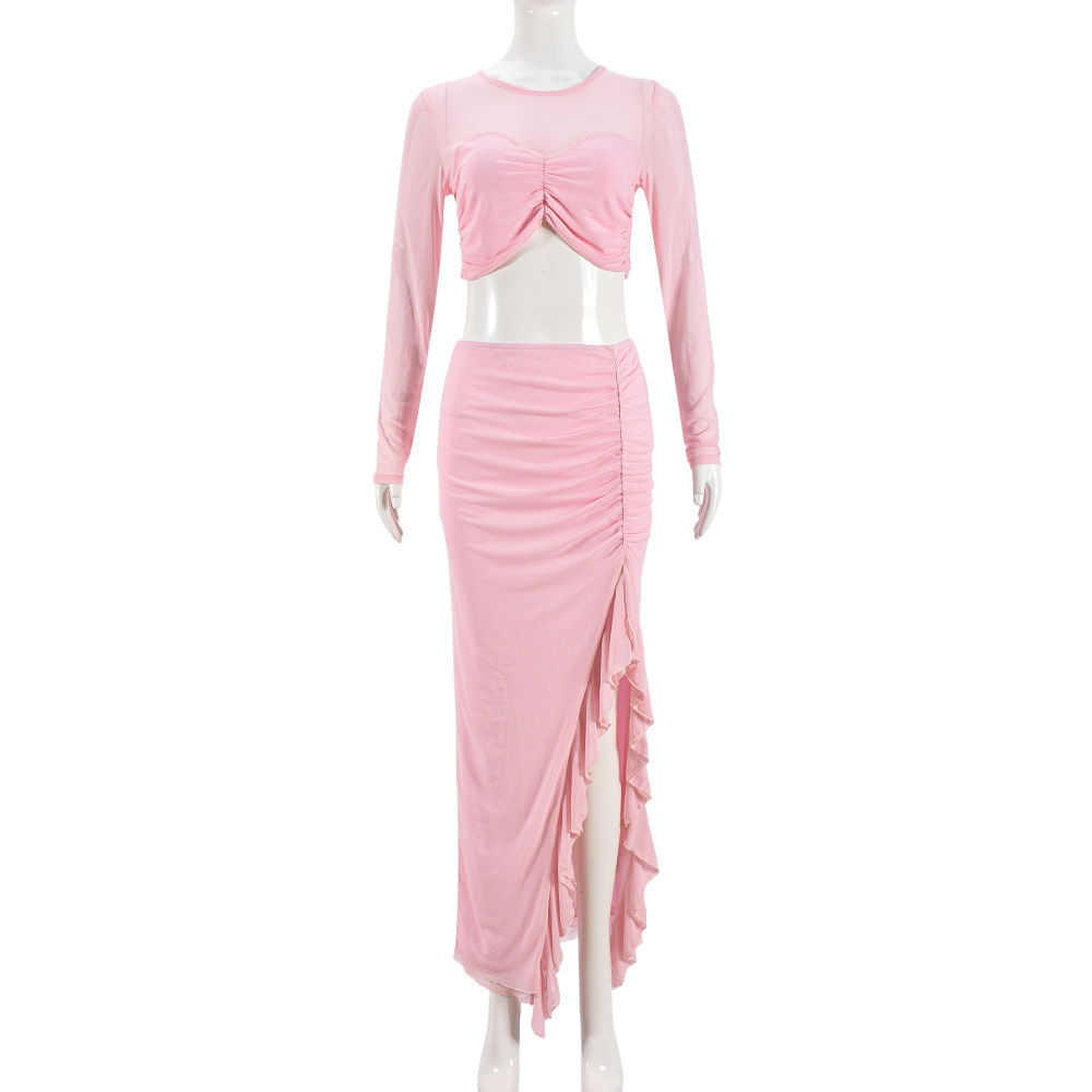 Women Clothing Hollow Out Cutout out Cropped Mesh See through Double Layer Lining Covering Long Sleeve Dress Two Piece Set