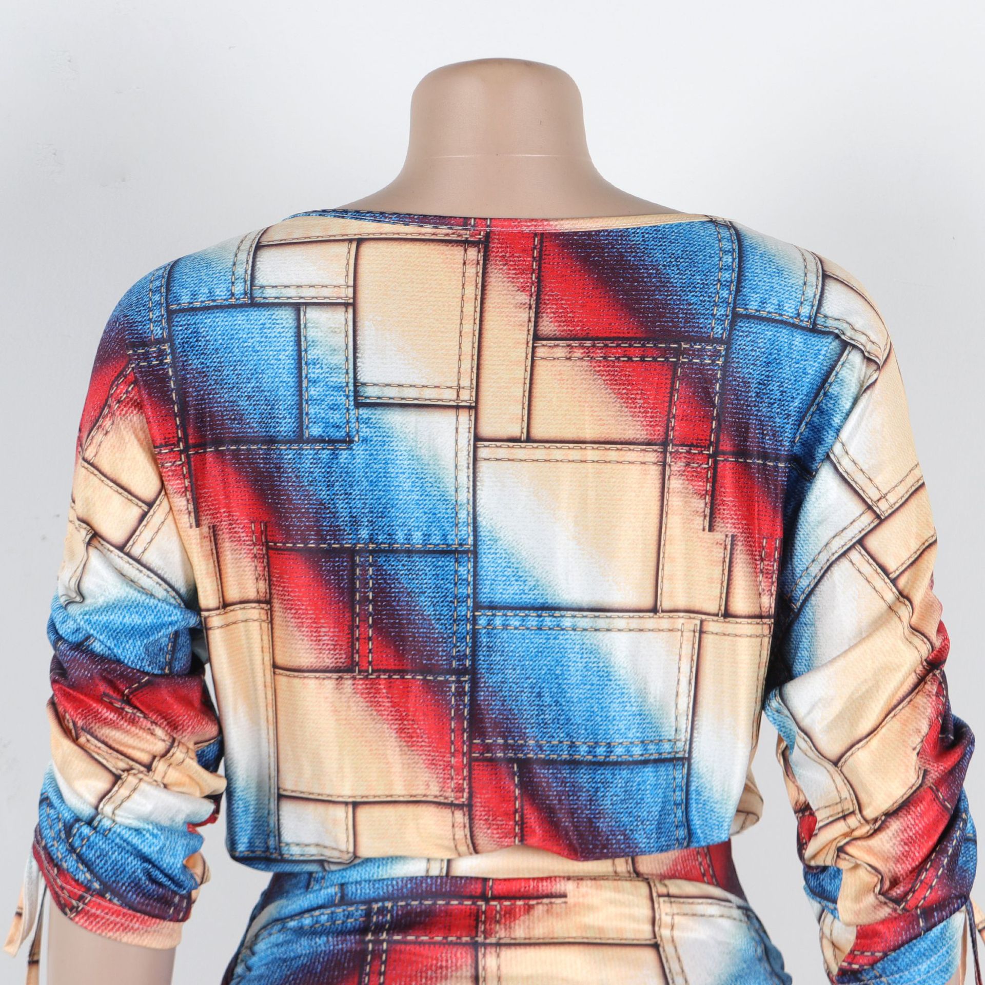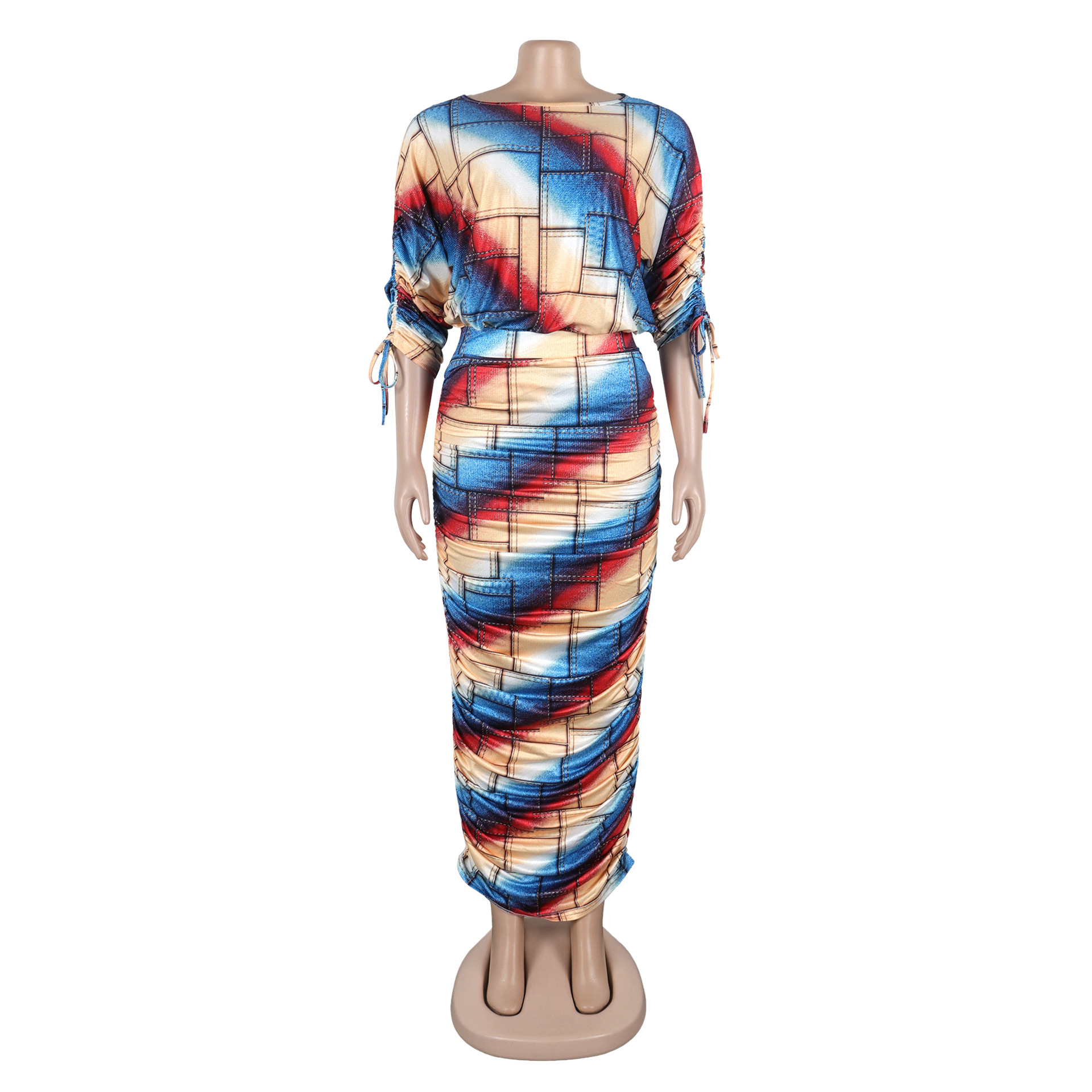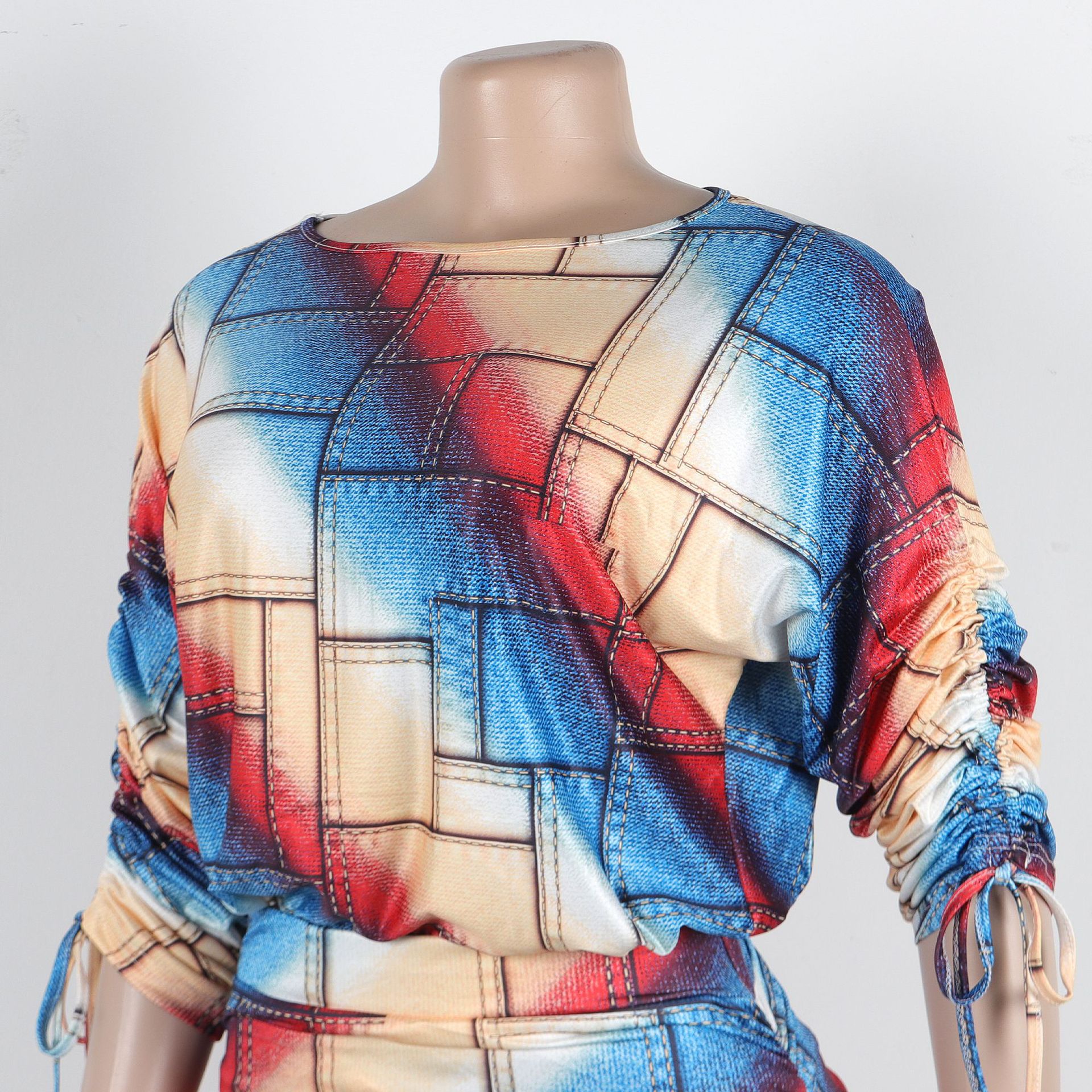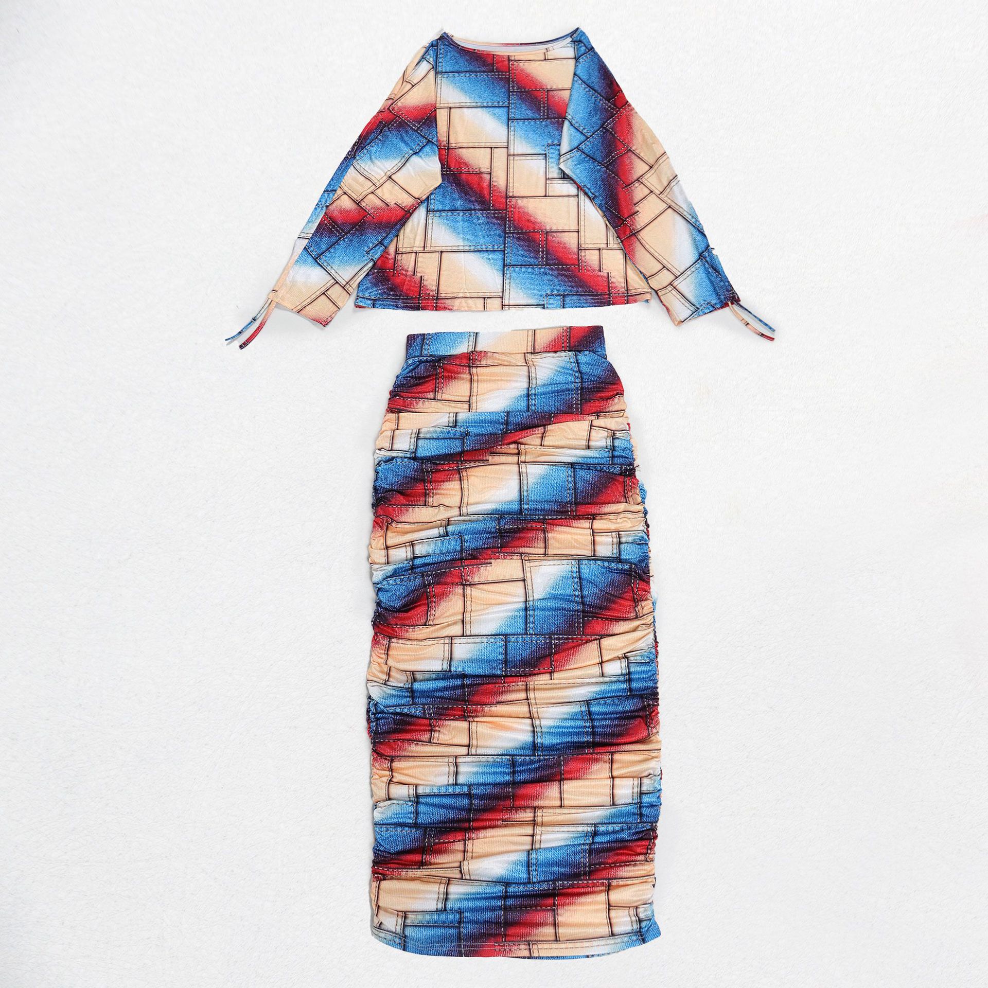 Women Printing Pleating Raglan Long Sleeves Skirt Two Piece Set