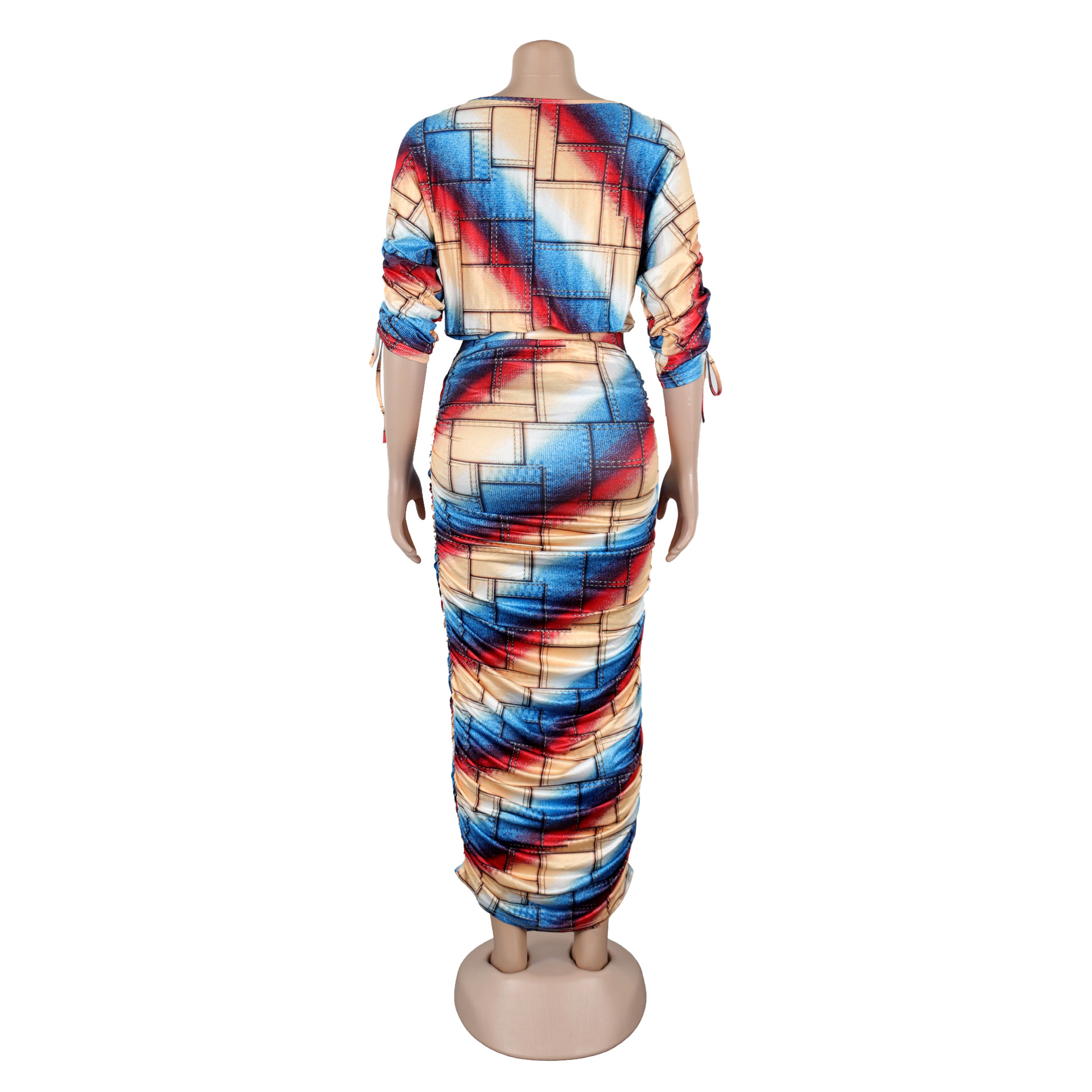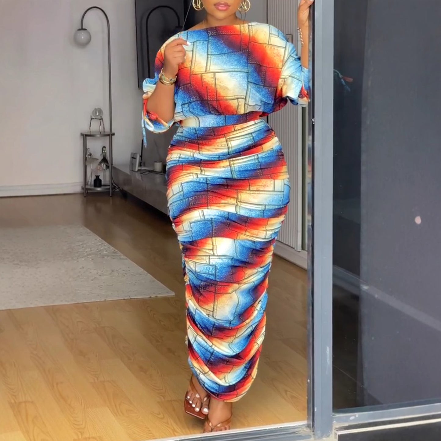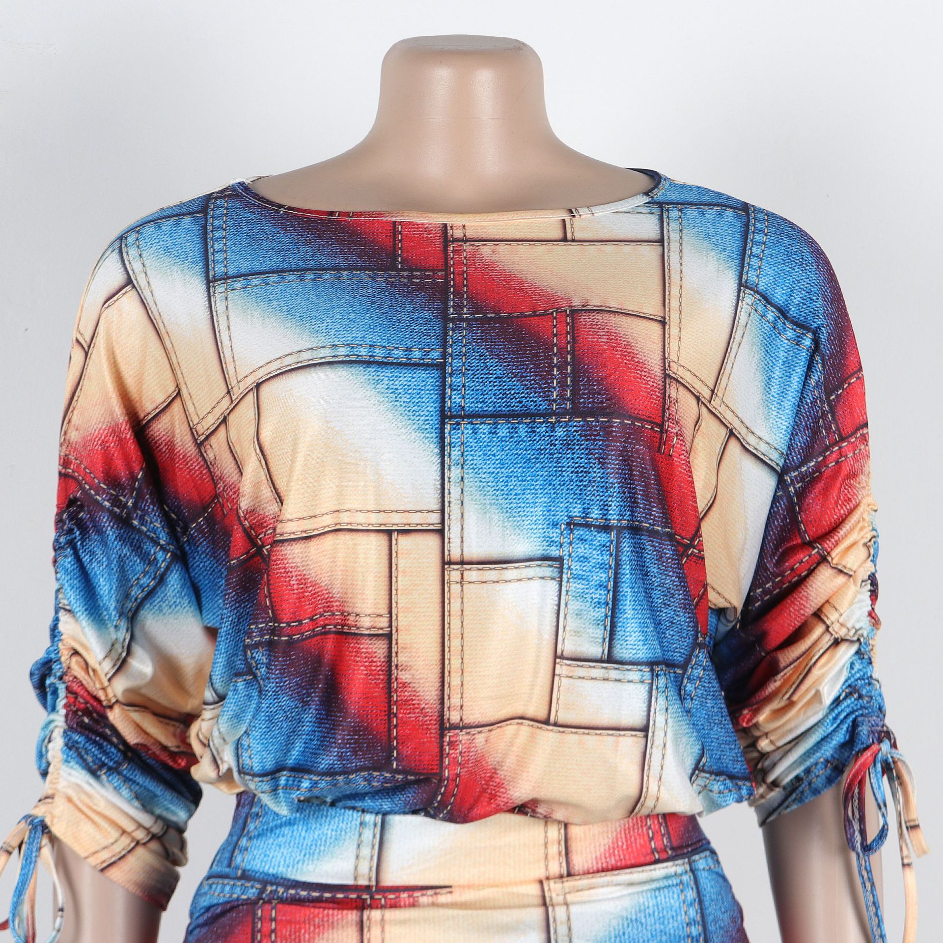 Women Printing Pleating Raglan Long Sleeves Skirt Two Piece Set