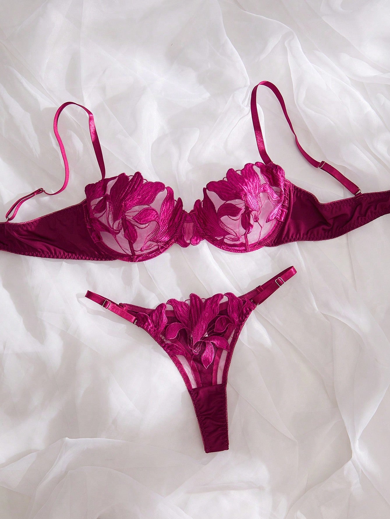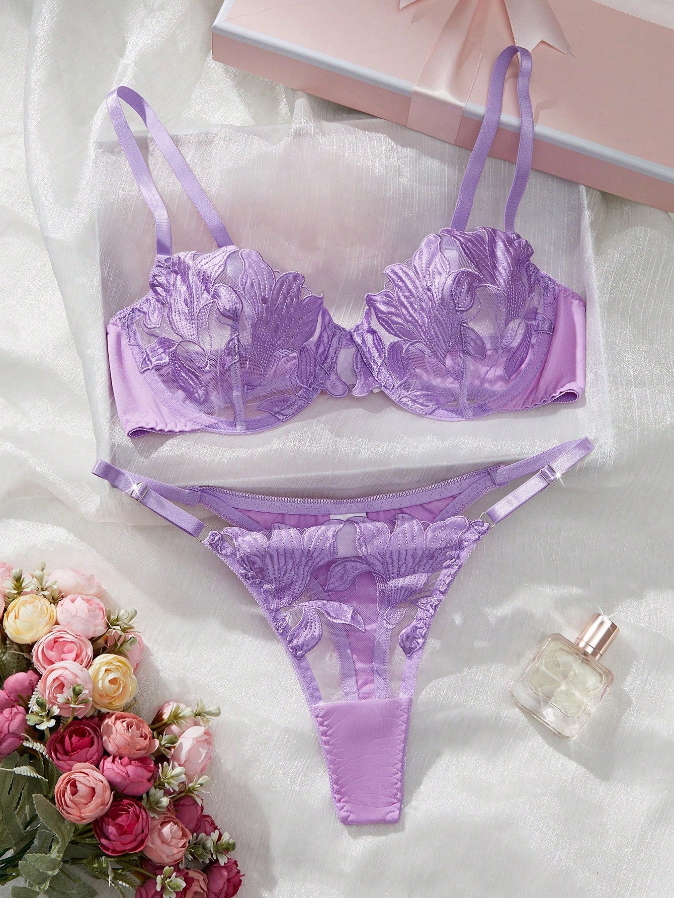 Women Sexy Embroidered Flower Underwear Set, 2 Pieces Underwire Bra & Panty Lingerie Set
