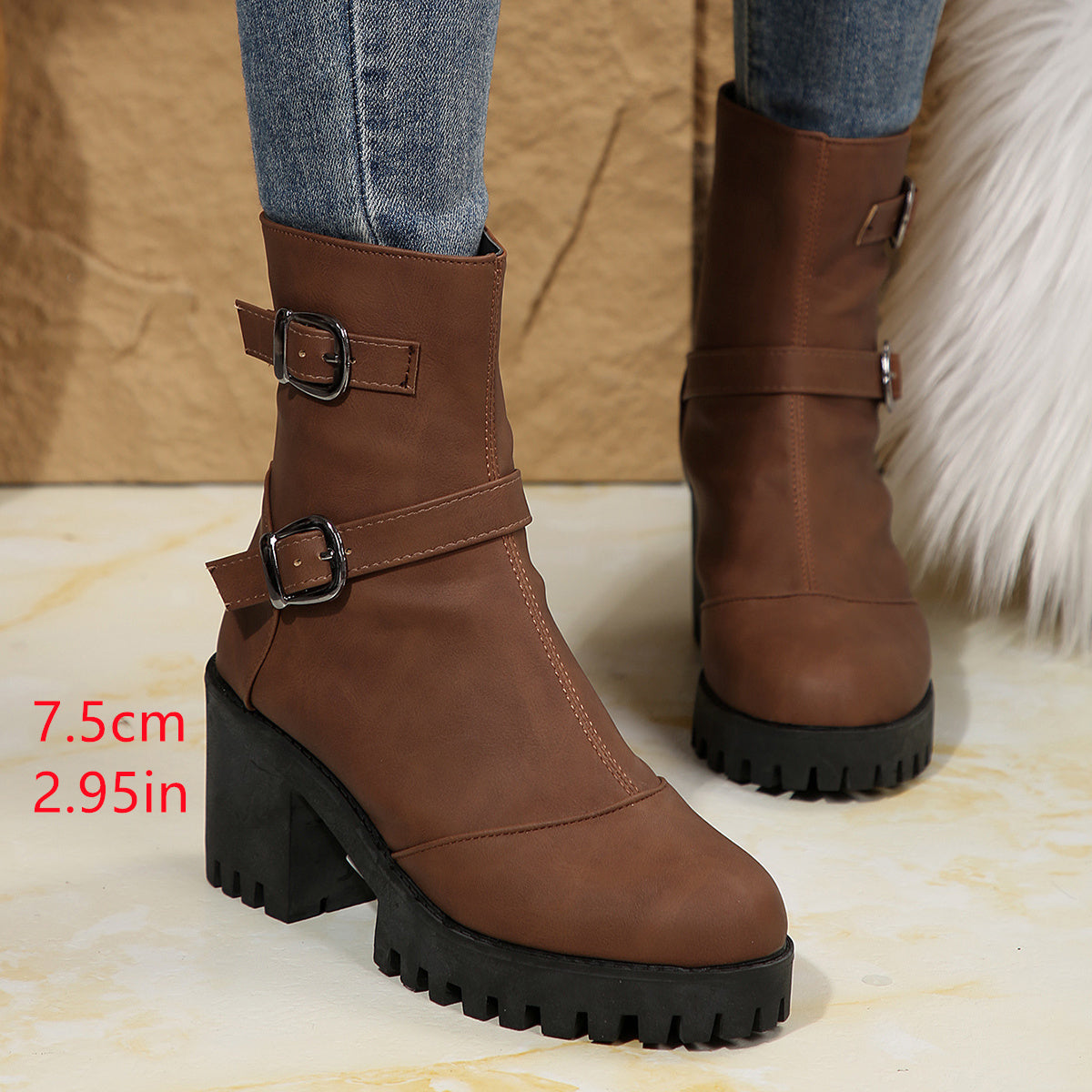 Women's Chunky Platform boots - Slip-Resistant Thick Heel, Zipper Closure, Cushioned Insole - Brown Faux Cover boots for Everyday & Formal Events - Extended Sizes Available, Stylish Walking, Round Toe, Quality Stitching, Office Wear, Slipresistant Shoes,