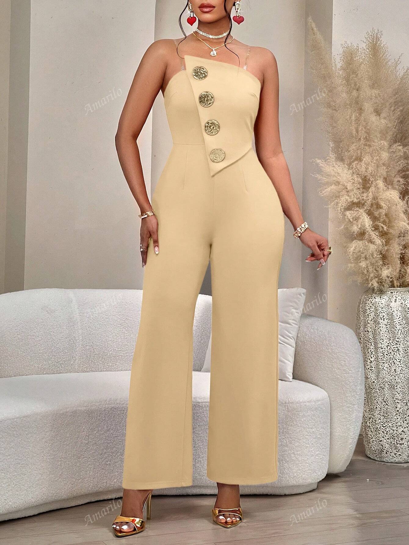 Women's Commuting Gorgeous Red Asymmetrical Chest Wide-Leg Jumpsuit With Texture Exaggerated Metal Buckle Details And Non-Slip Shoulder Straps (Removable) Suitable For Parties, Daily Office, Christmas Parties And Valentine's Day Dates