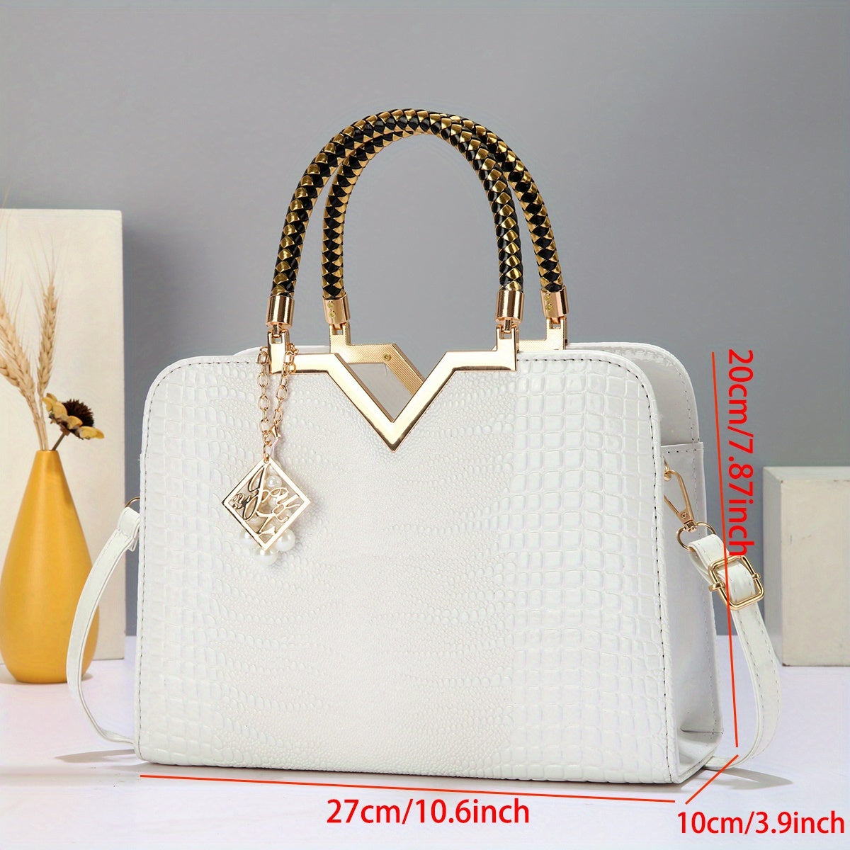 Women's Crocodile-Embossed Synthetic Leather Handbag with Adjustable Shoulder Strap & Golden-Tone V-Hardware - Large Capacity Tote for Work, Travel, Valentine's Day Gifts - Multiple Colors Available, Versatile Tote Bag | Vshaped Detail | Goldtone Hardware