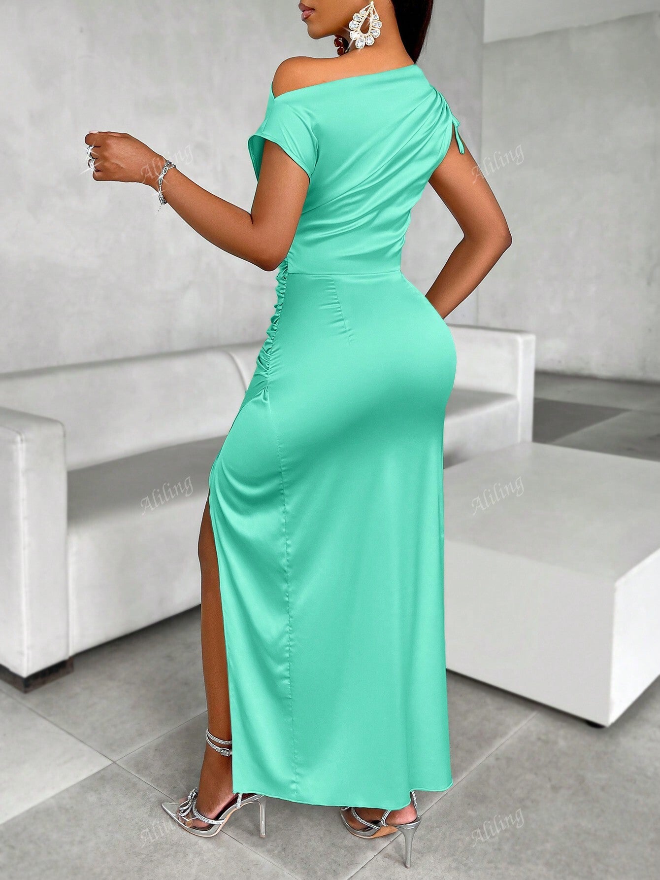 Women's Elegant & Commute Asymmetrical Neck Ruched Shoulders Pleated Split Thigh Dress