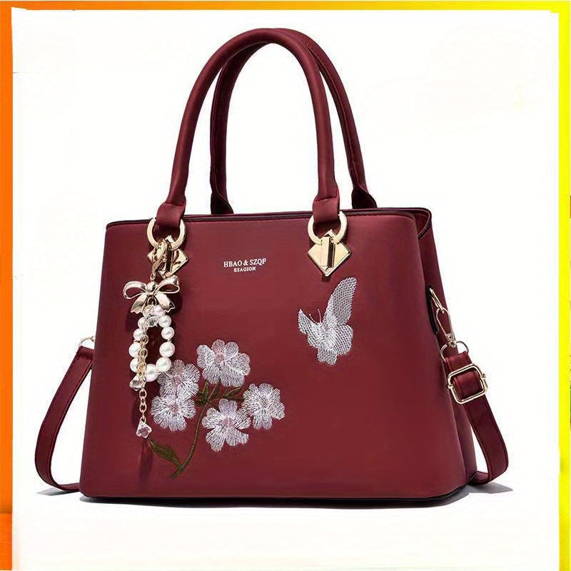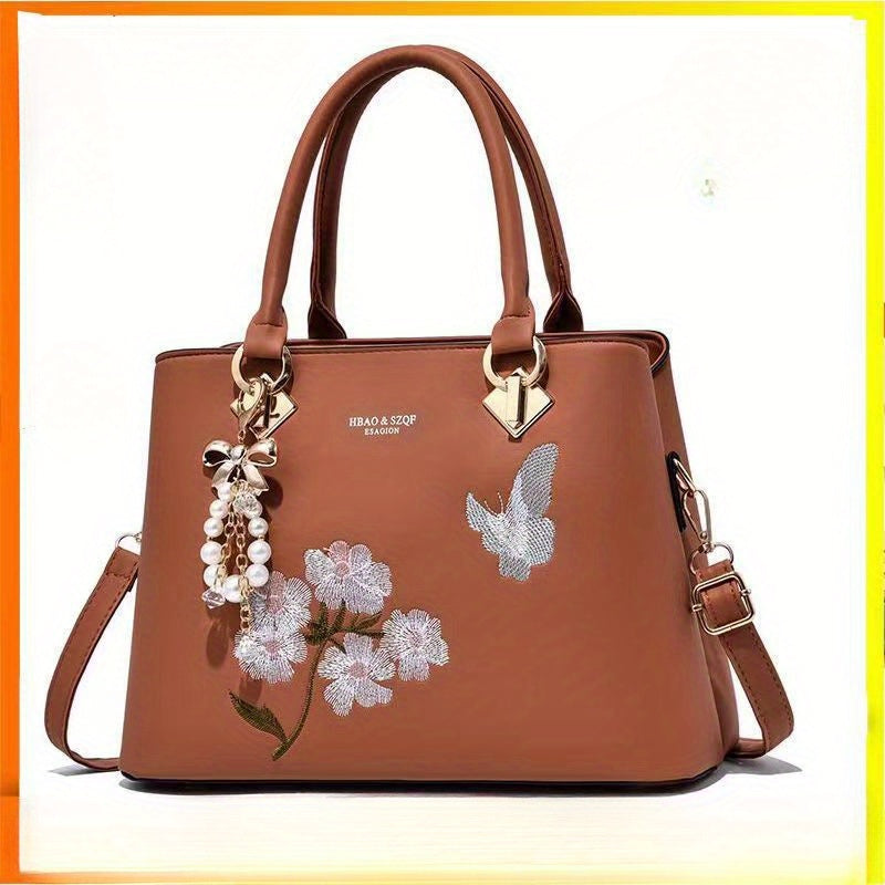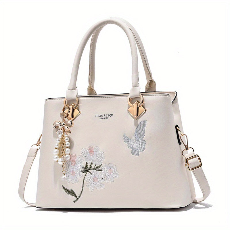 Women's Elegant Floral Purse - Detachable Strap Crossbody/Shoulder Bag, Handbag with Zipper Closure, Chain link Hardware, Everyday & Formal Events - Available in White, Green, Black - European-Inspired Design, Rhinestone Embellishments