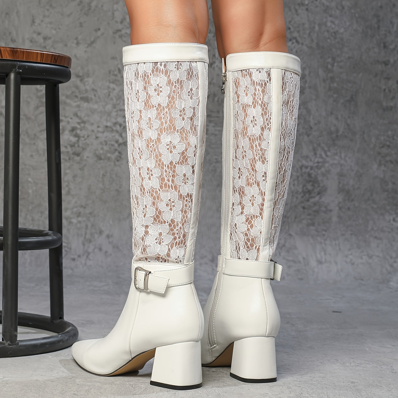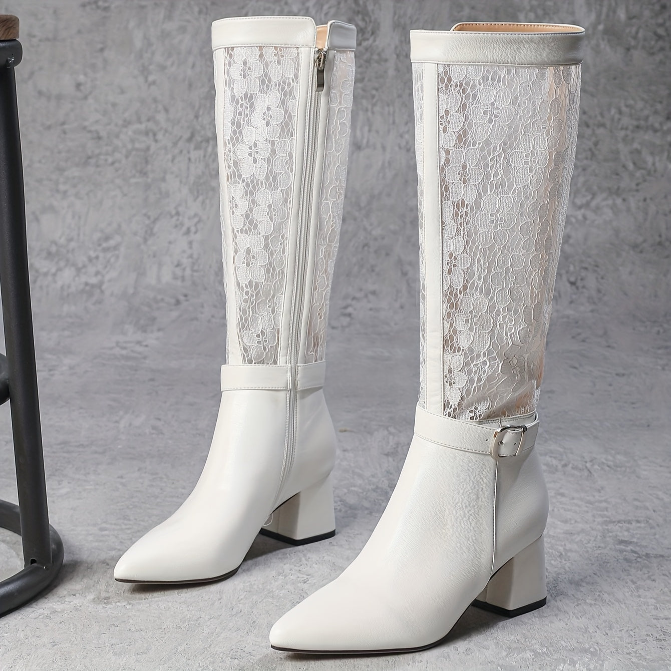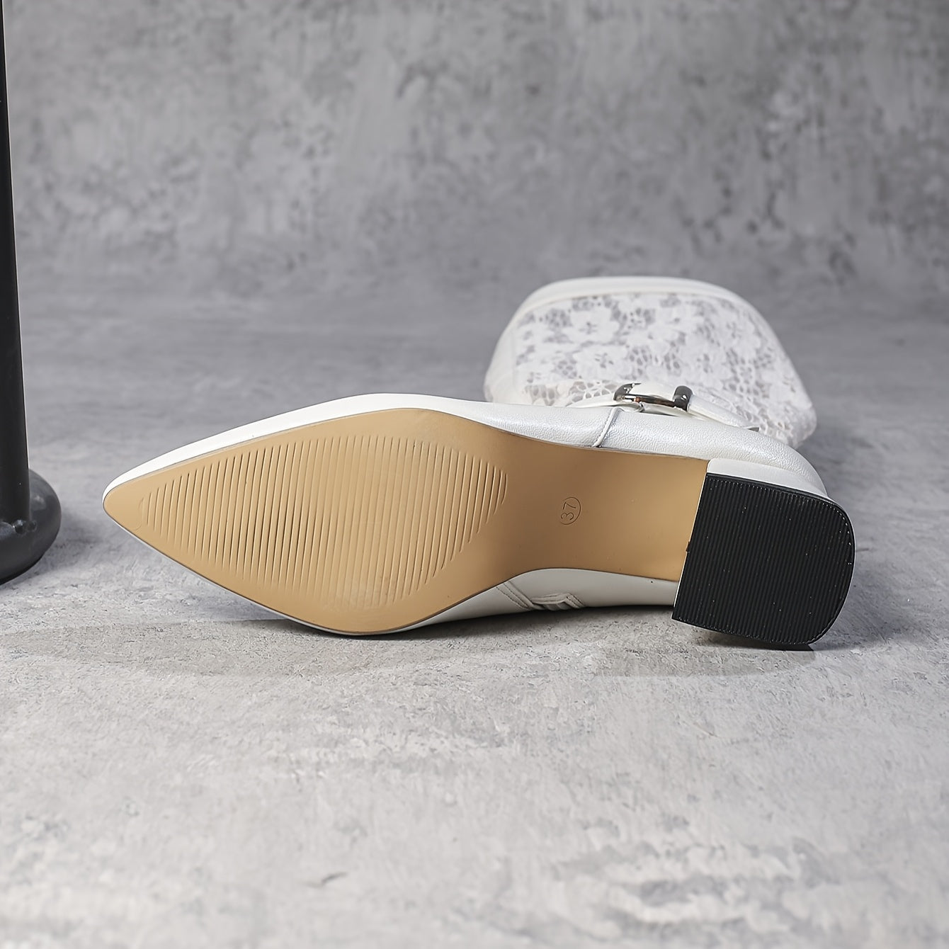 Women's Elegant White High-heeled Boots - Chunky block heel, with Zipper Closure, Non-Slip Rubber Sole - Synthetic Cover/Fabric Upper Formal Party Boots for Wedding, Evening Events, Everyday - All-Day Comfort & Easy On/Off, Wedding Footwear, Pointed Toe,