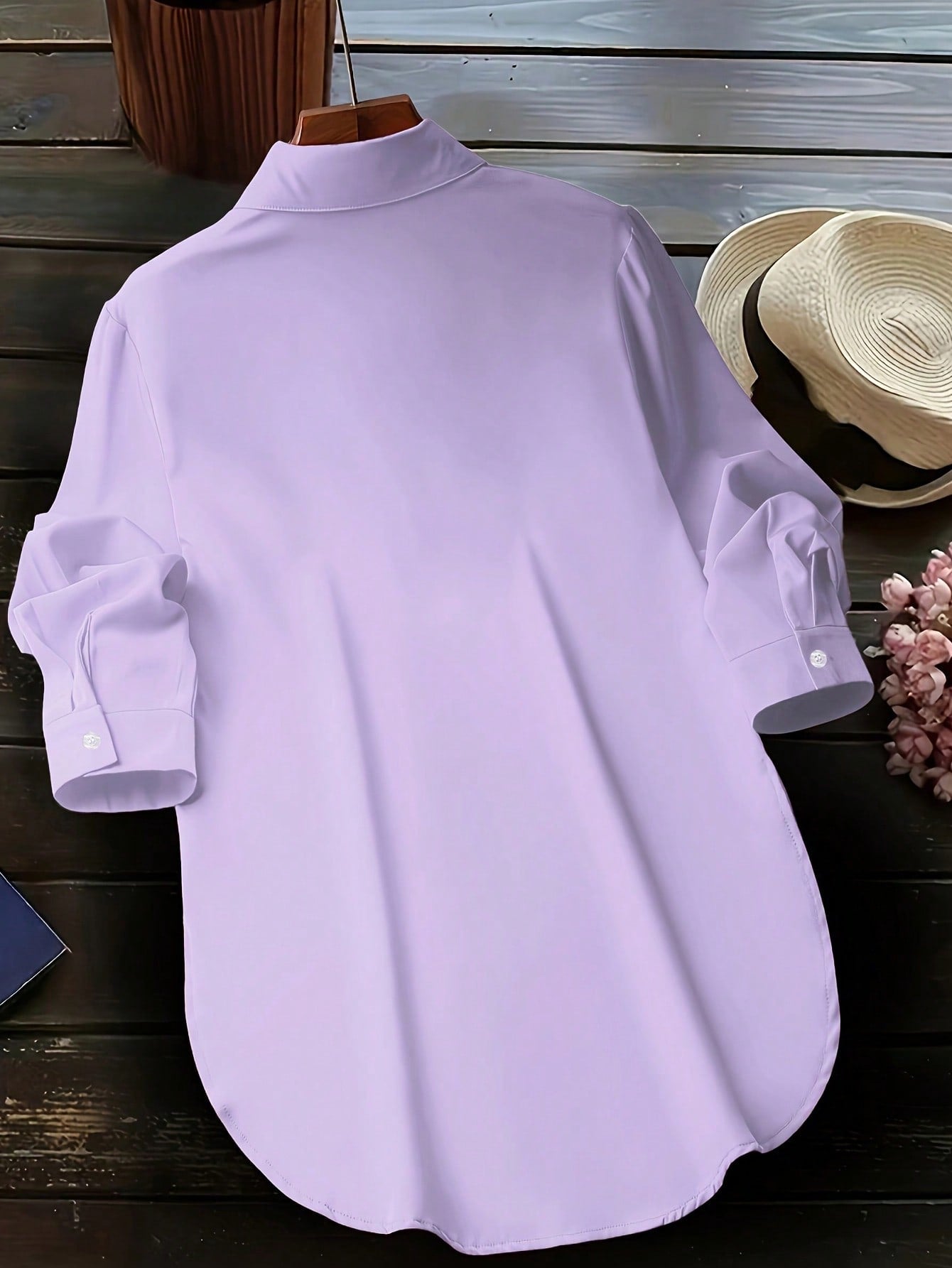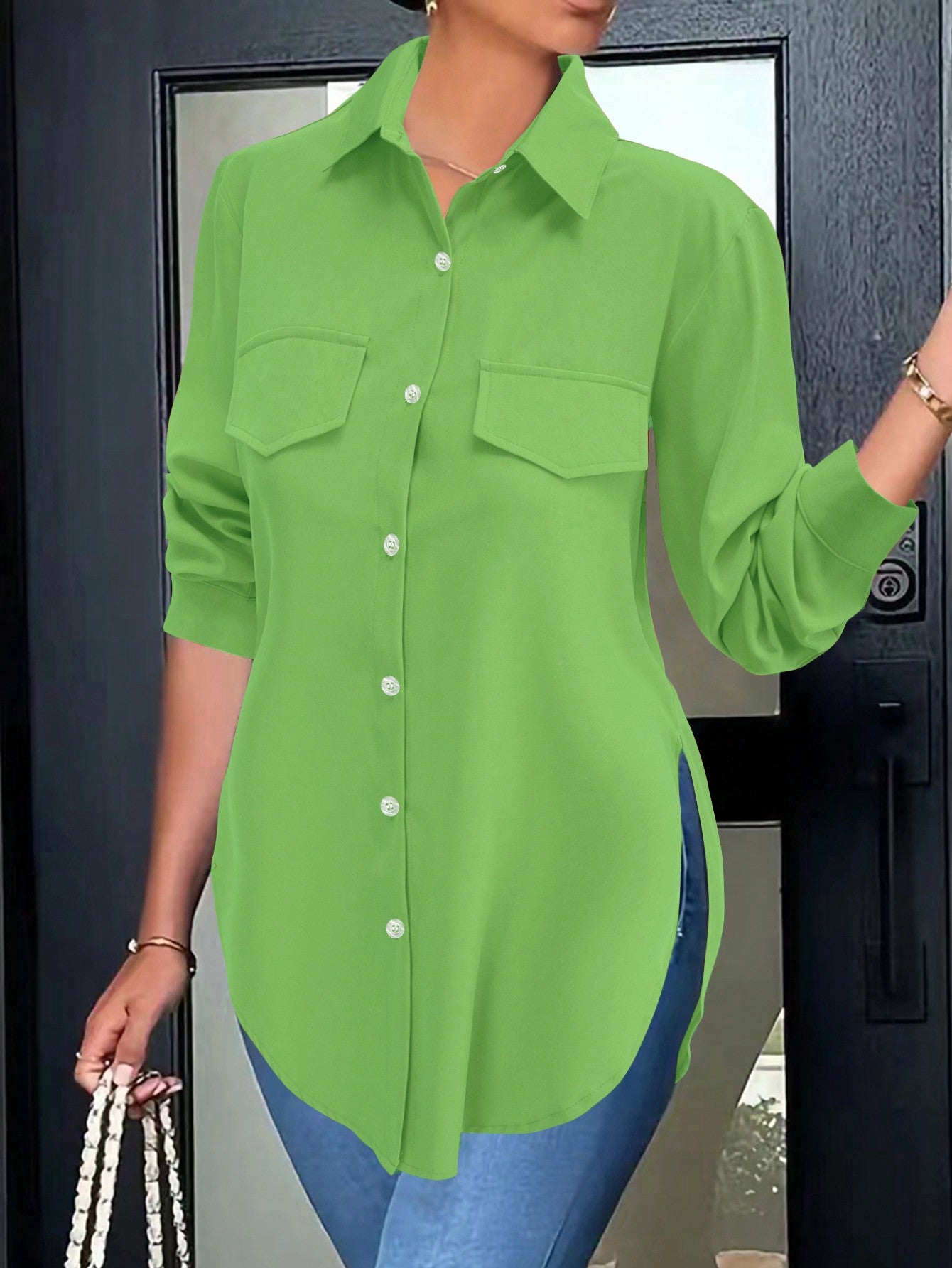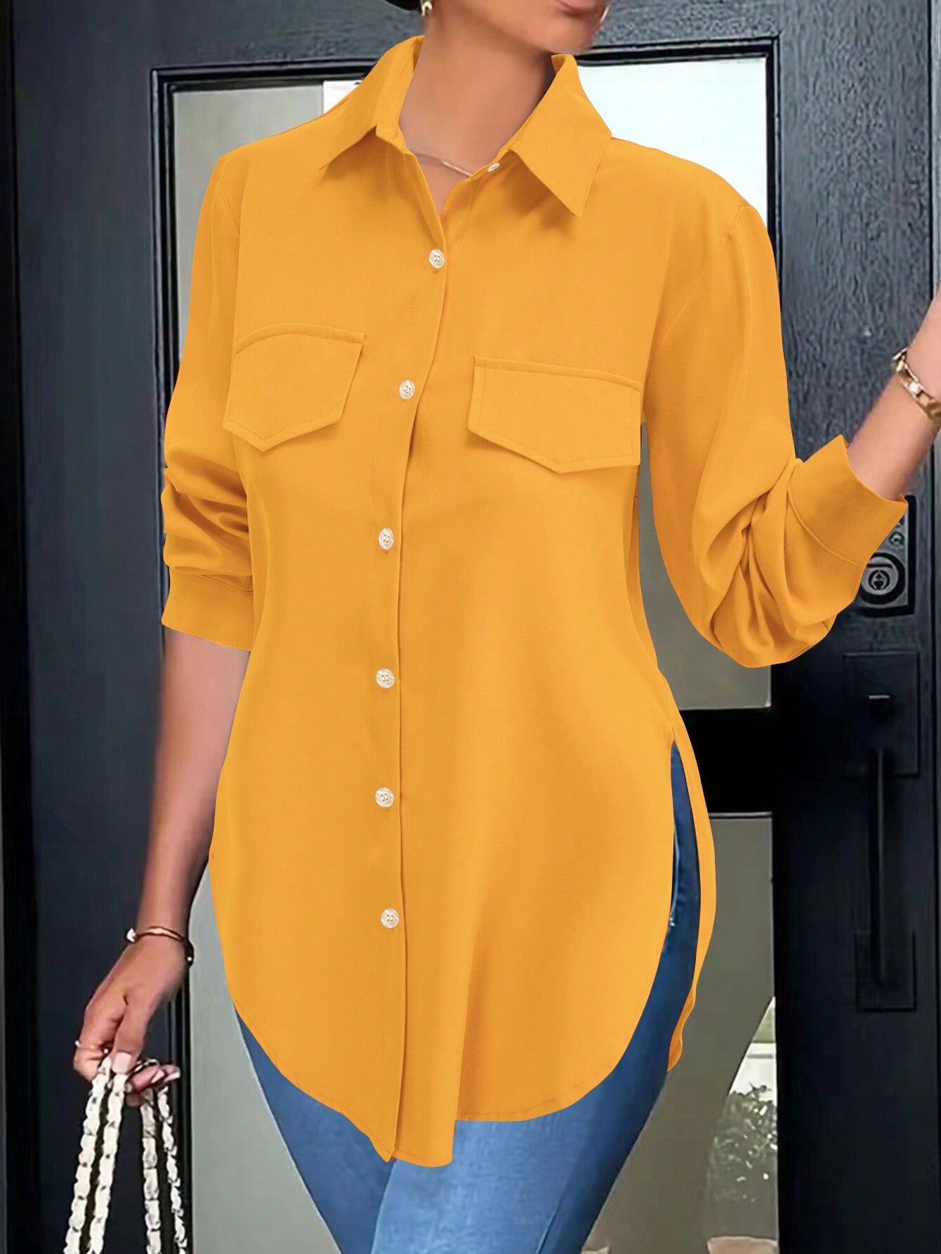 Women's Fashion Side Slit Hem Fake Pocket Casual Shirt