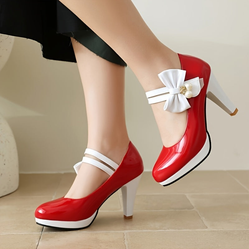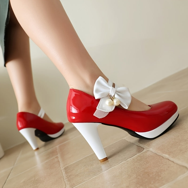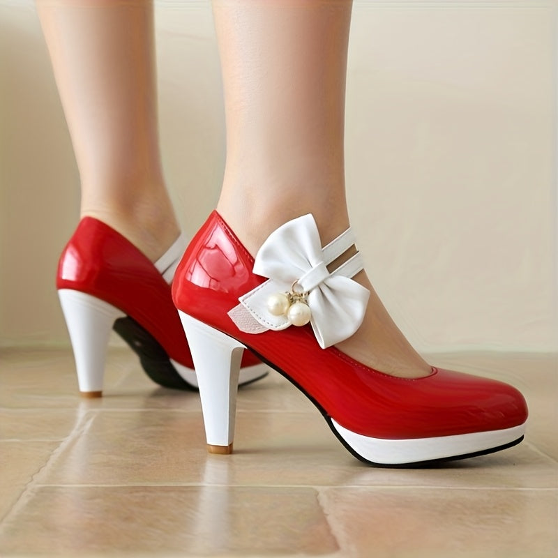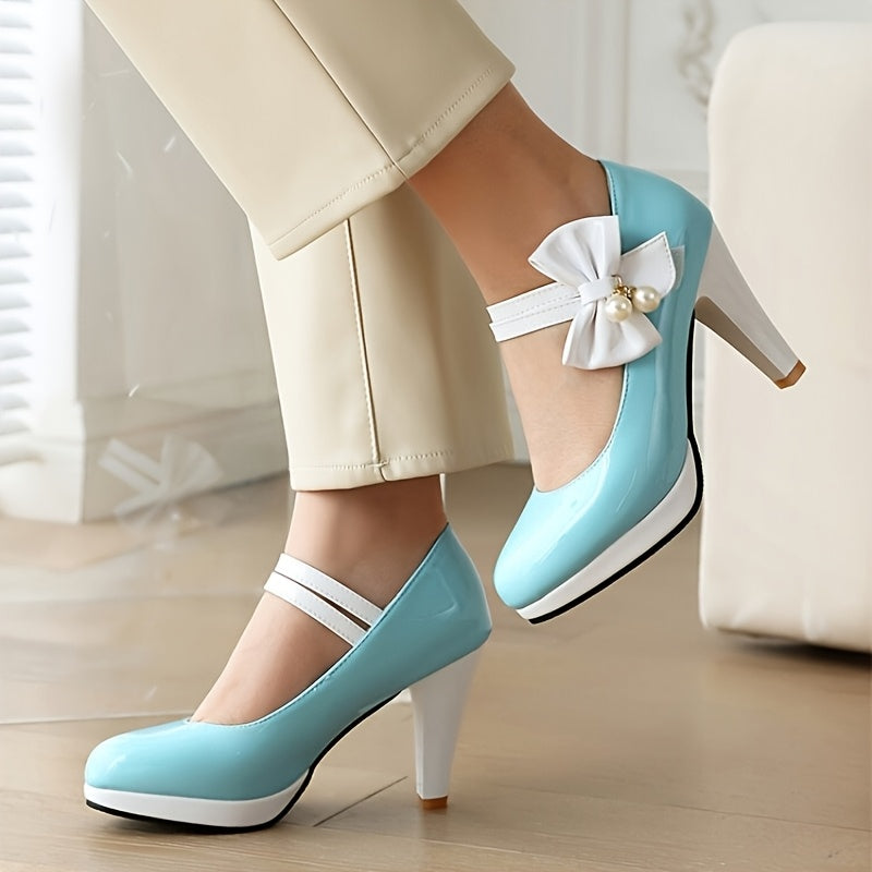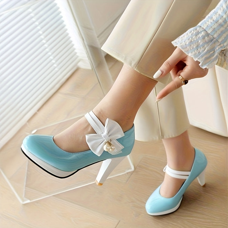 Women'S Light Blue High Heel Pumps with Bow Detail - Anti-Slip Synthetic Cover Dress Shoes, Round Toe, Block Heel, All-Season Comfort for Casual or Formal Occasion