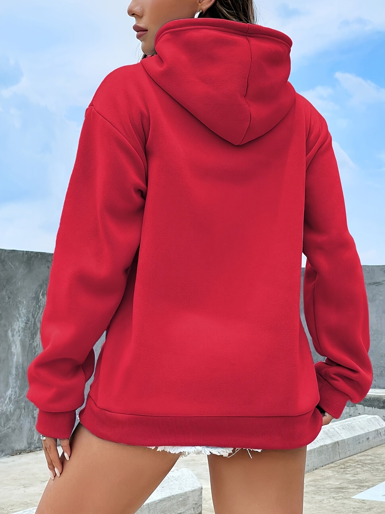 Women's Red Fleece-Lined Hoodie - Casual European Style, Polyester, Machine Washable, Sporty Zip-Up Sweatshirt with Pockets for Fall/Winter, Winter Comfort Clothing|European Style Hoodie|Polyester Hoodie, Essential Hoodie