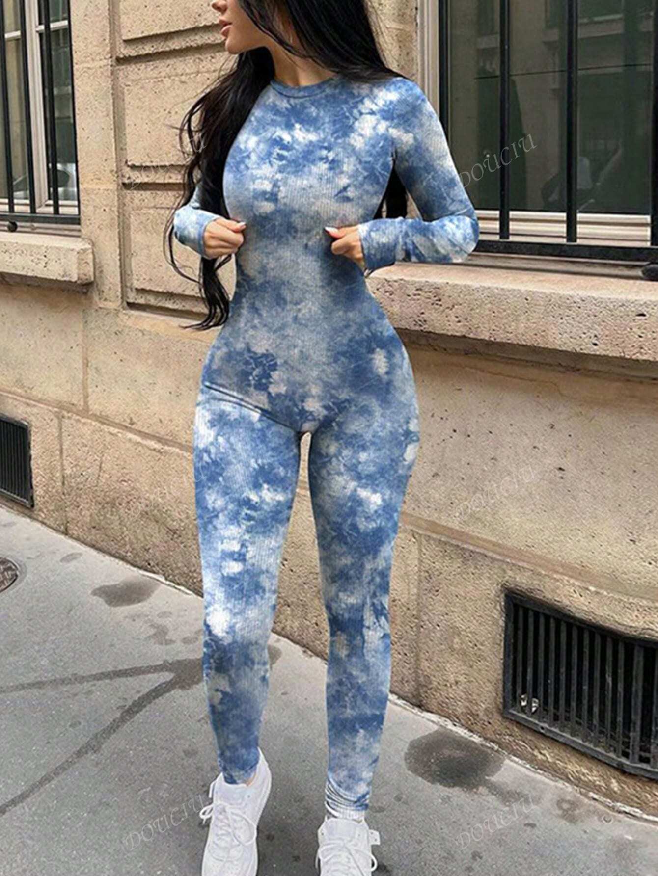 Women's Solid Color Round Neck Long Sleeve Jumpsuit, Ribbed Knit Tight Jumpsuit, Spring/Autumn