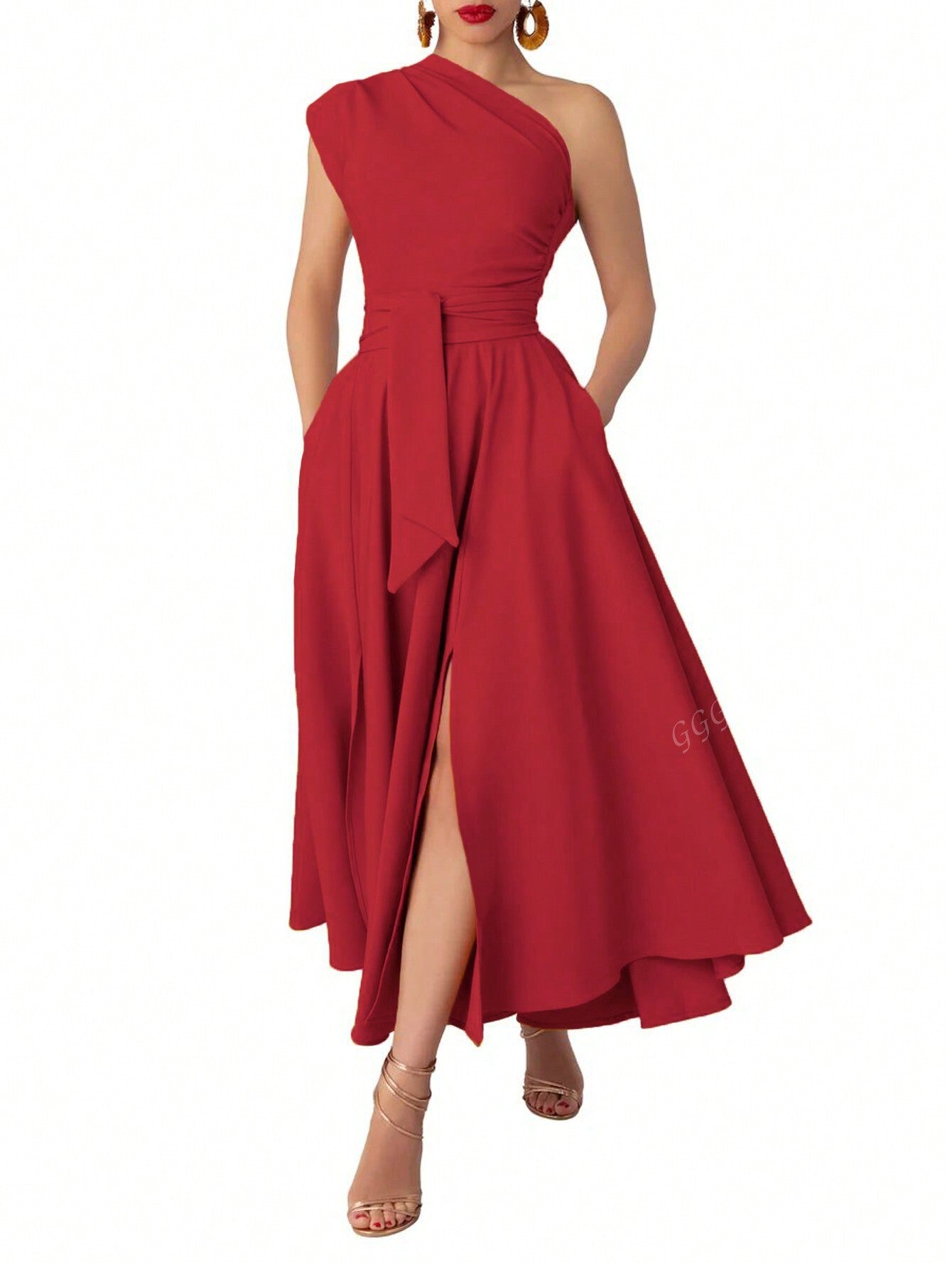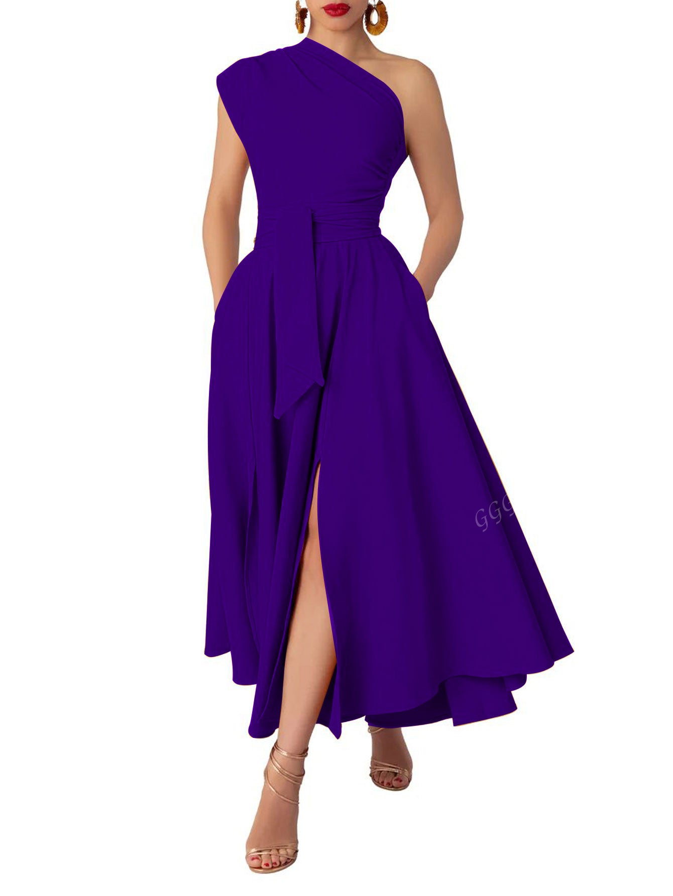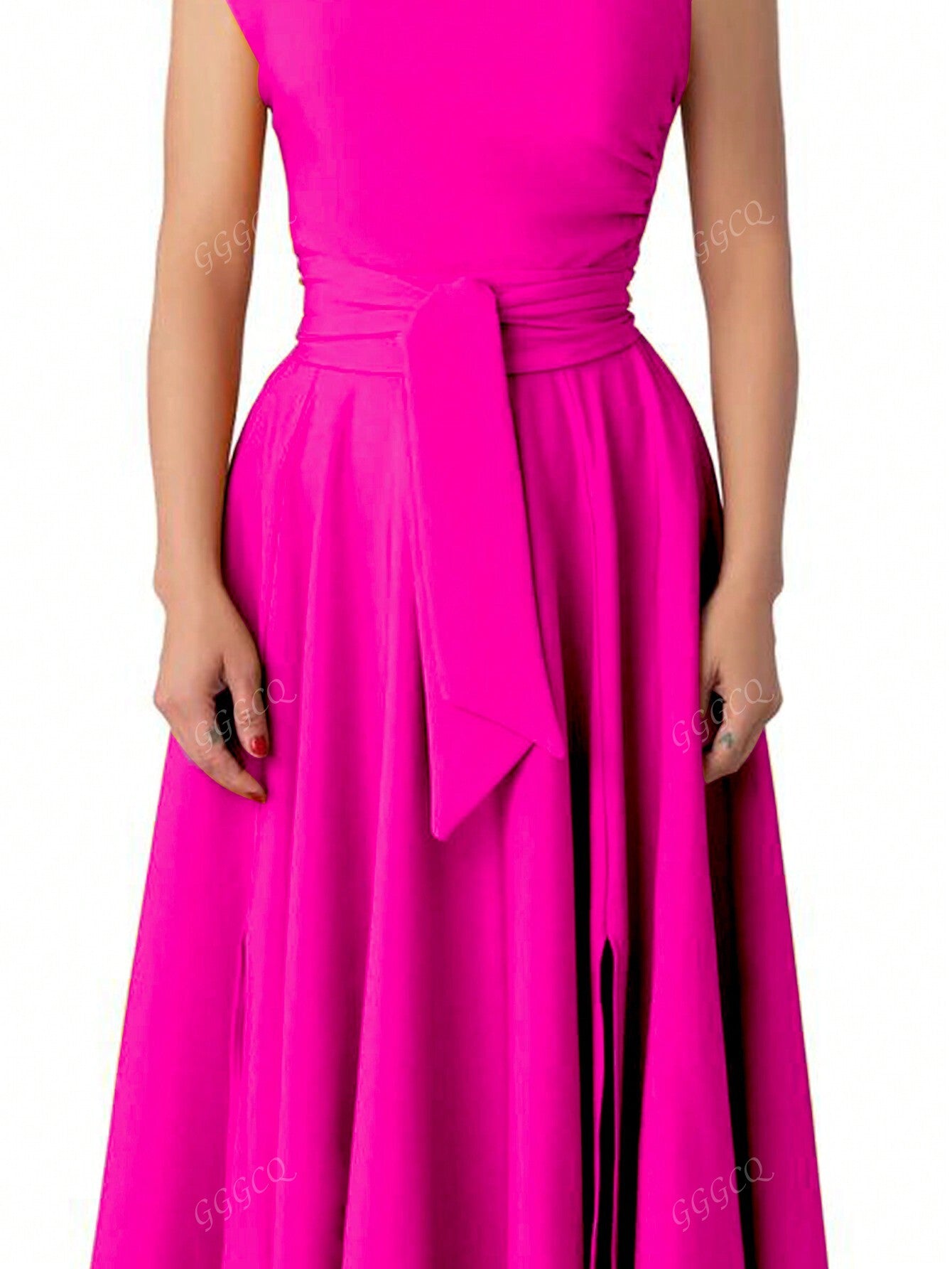 Women's Solid Color Sleeveless Pocket Open Slit Hem Dress, Elegant Summer
