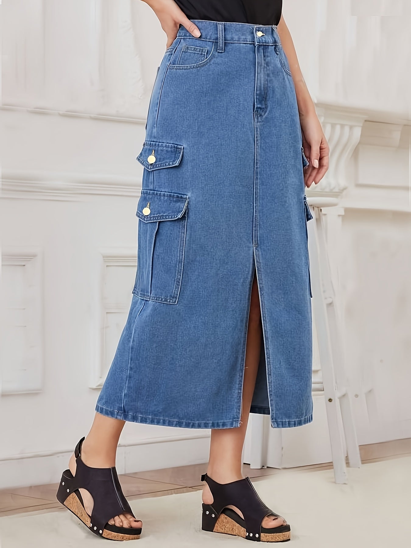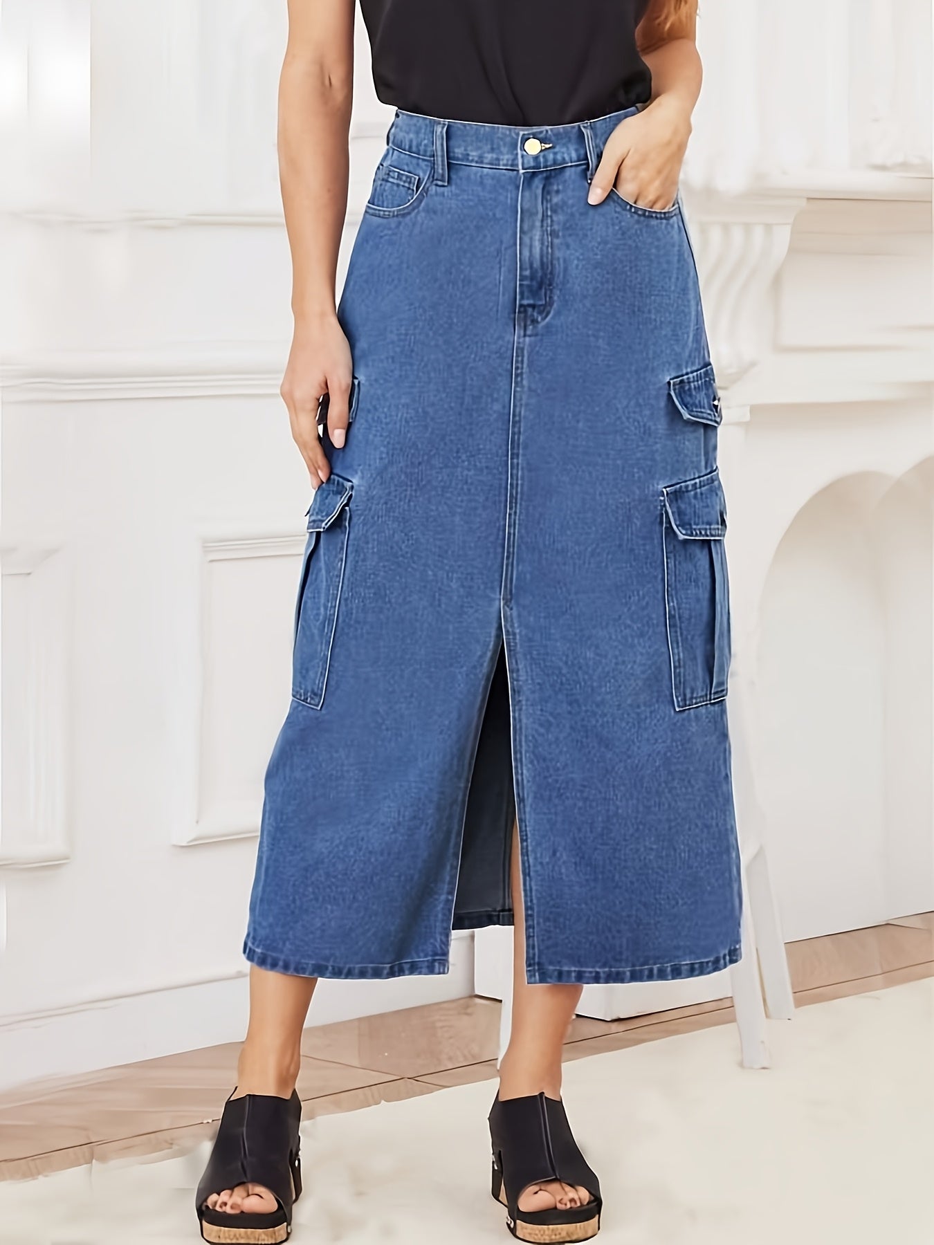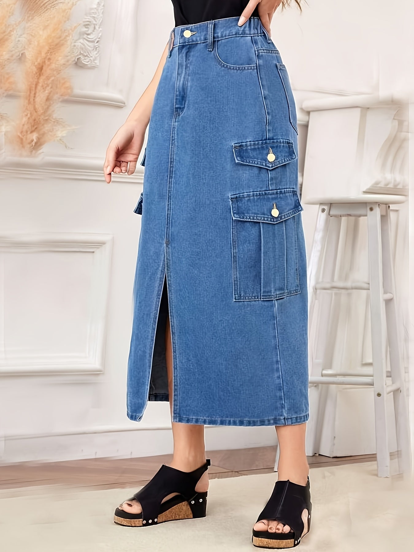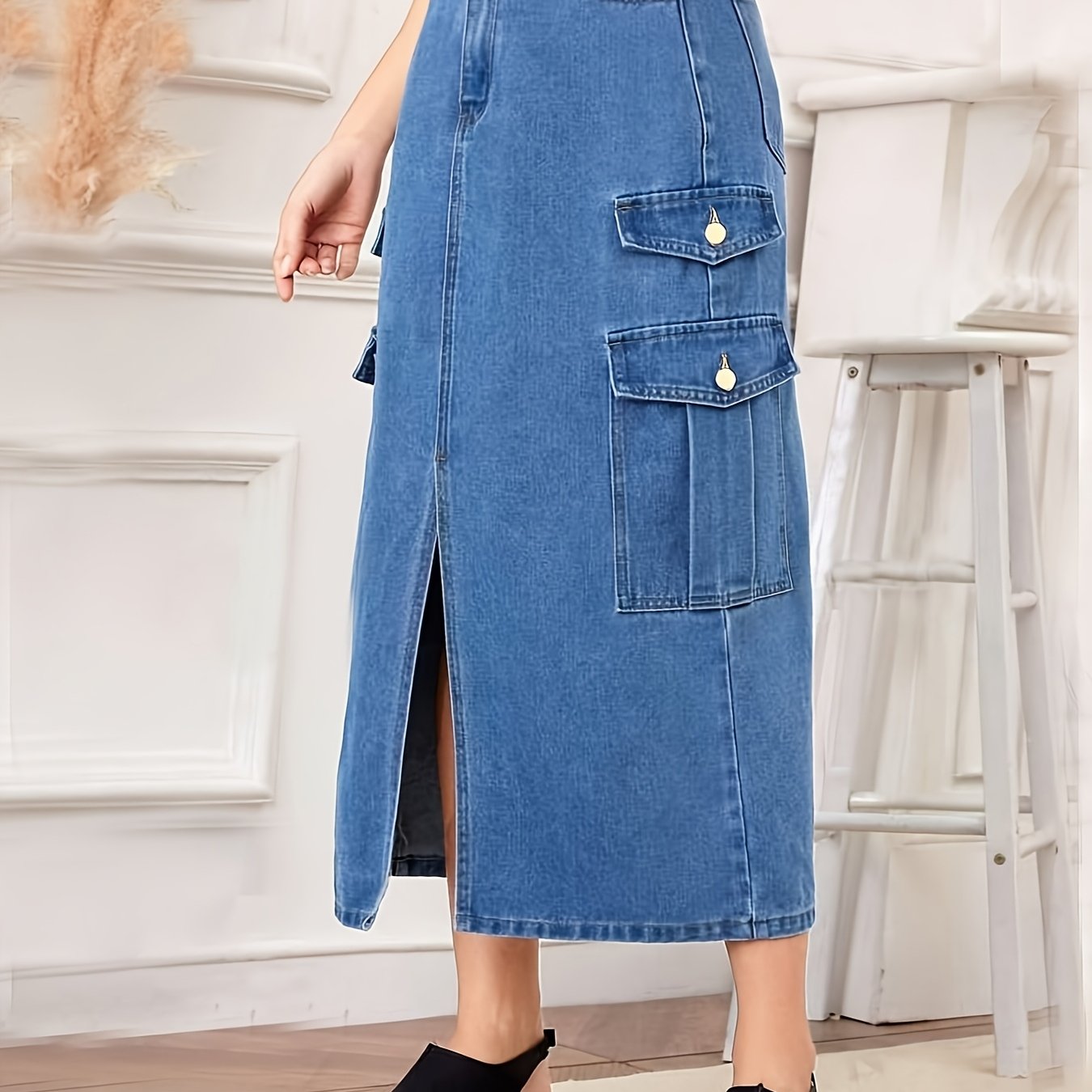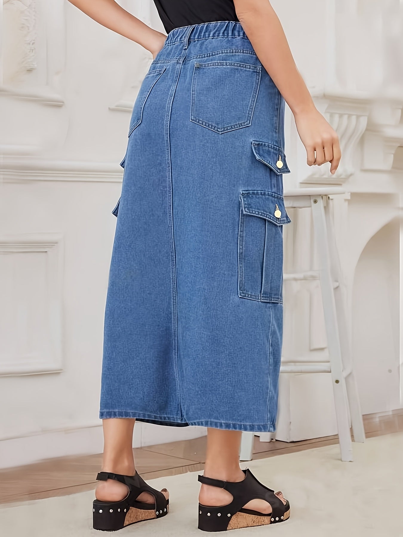 Women's Stretch Denim Midi Skirt with Side Slit, Elastic Waistband & Multiple Pockets - Light Blue Elegant Casual Style for Spring/Summer/Fall, Denim Skirt