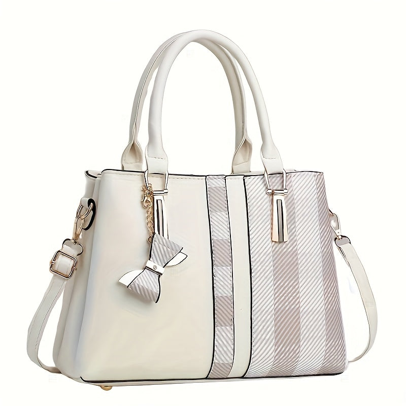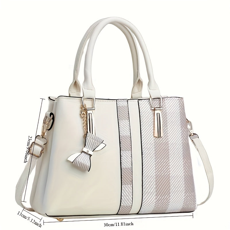 Women's Trendy White & Grey Striped Three-Layer Large Crossbody Bag with Adjustable Shoulder Strap, Zipper Closure & Decorative Bow - Versatile Handbag for Moms, Casual &, Crossbody Purse, Durable Polyester Lining, Oiled Edge Construction, Travel Purse, S