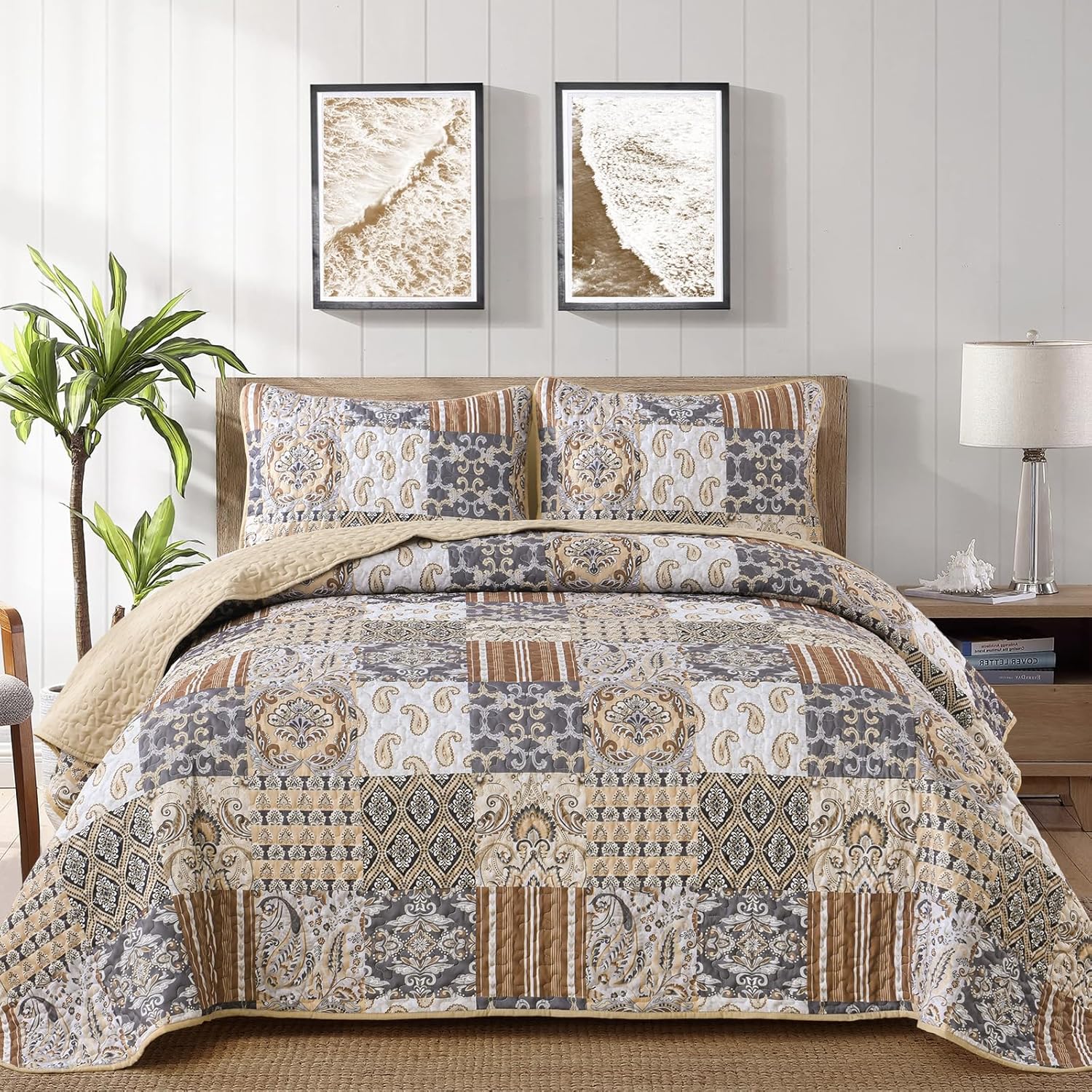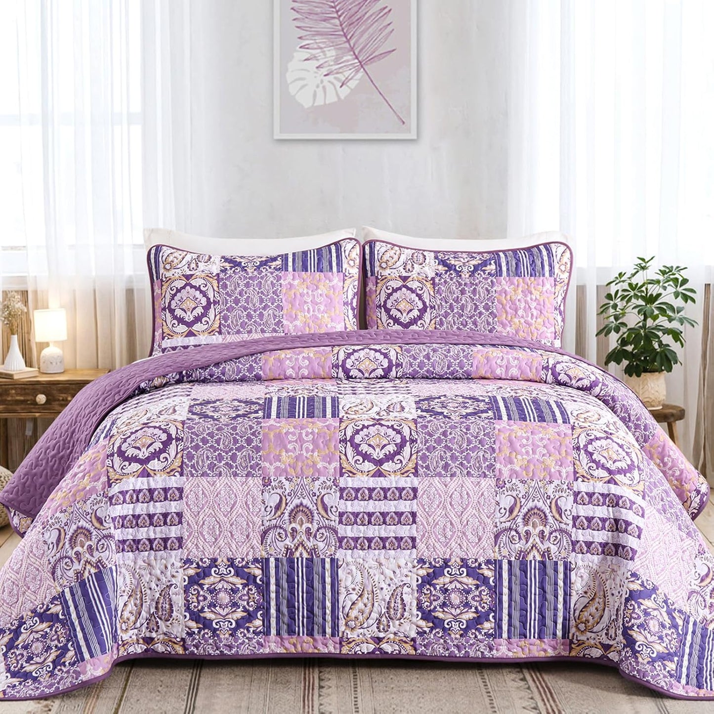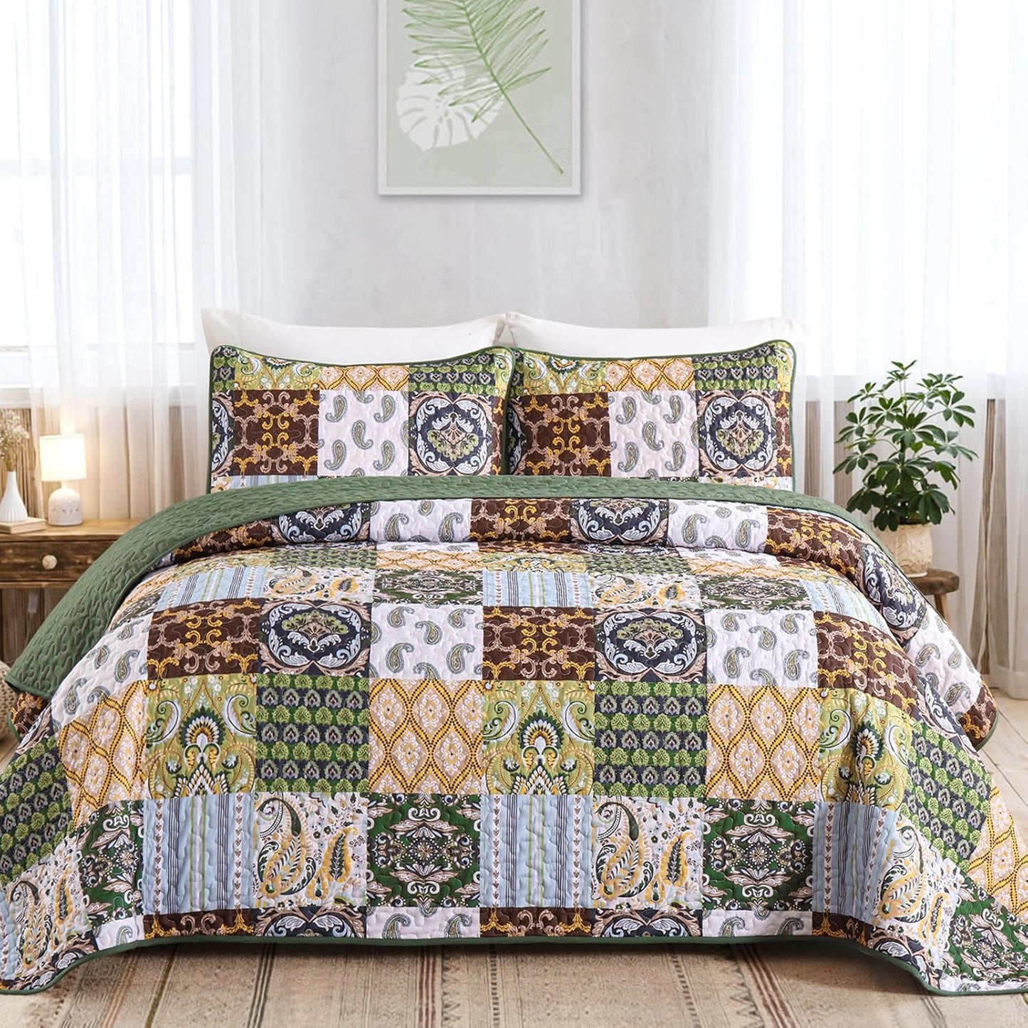 3 PIECES QUILT SET: Patchwork plaid quilt set queen size include: 1 quilt 96"x90", 2 pillowcases 20"x28". The same patterned pillowcase design makes this bohemian damask paisley quilt bedding set for queen bed more harmonious.