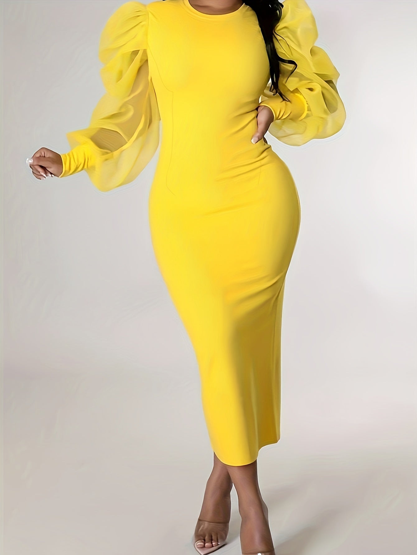 [Yellow Bodycon Dress] Machine Washable Yellow Long Sleeve Bodycon Dress - Solid Color Patchwork, Polyester