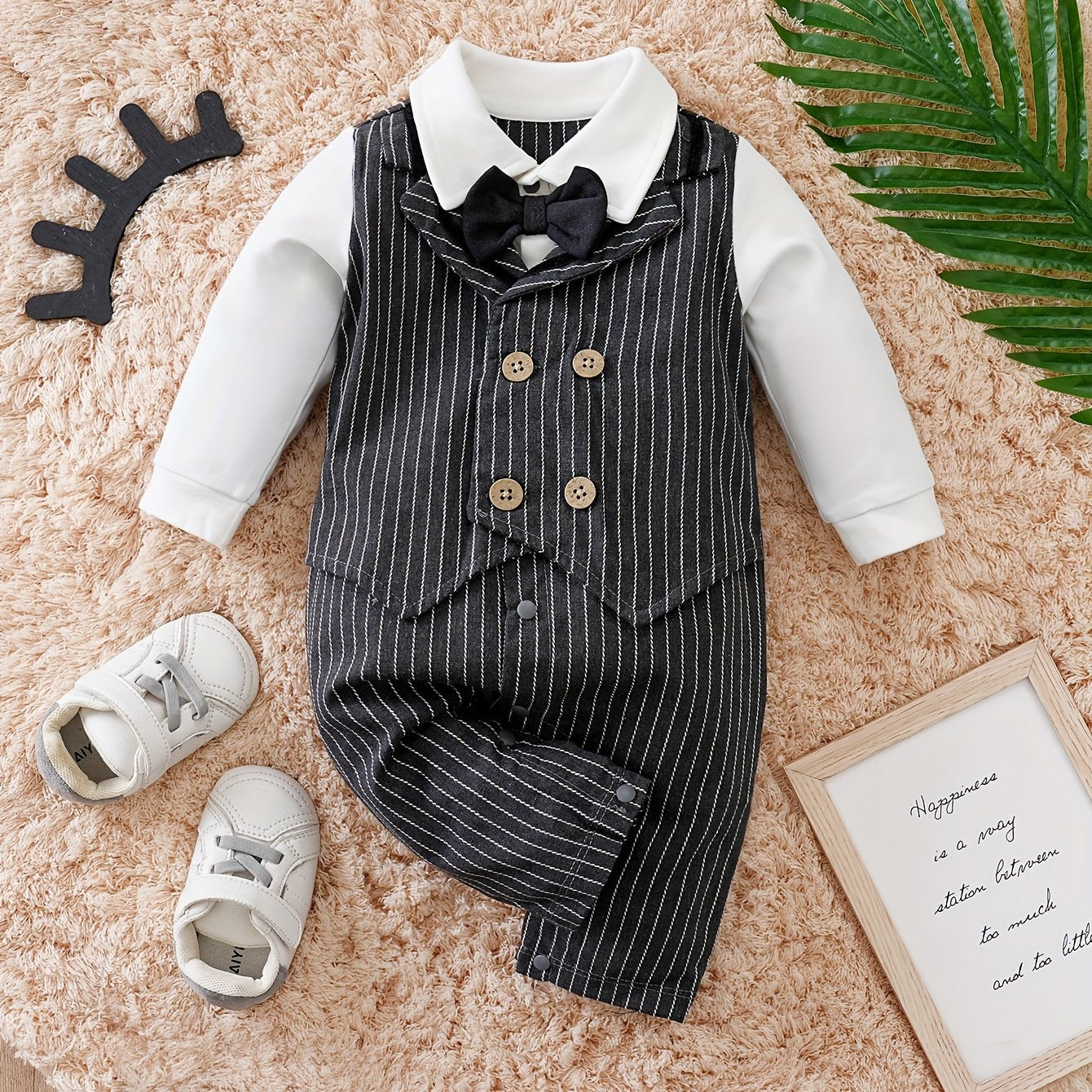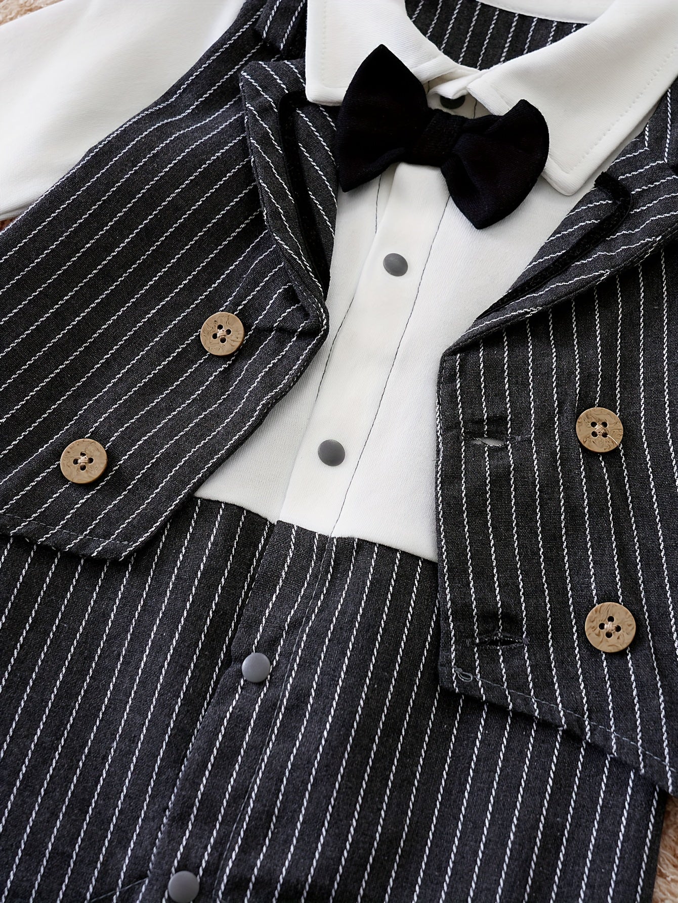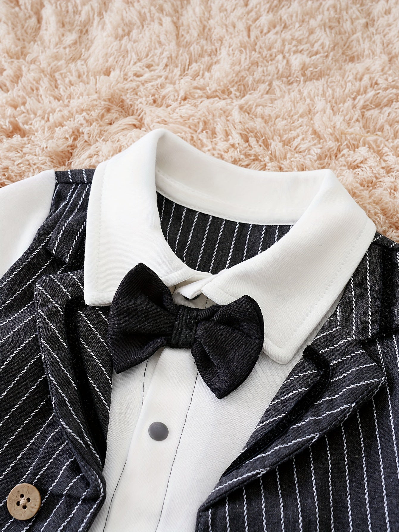 YIERYING Baby Boy Striped Gentleman Jumpsuit - Long Sleeve, Polyester Blend, Perfect for Spring/Fall, Includes Matching Bow Tie and Shoes