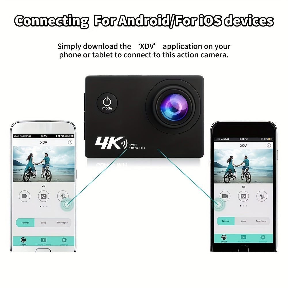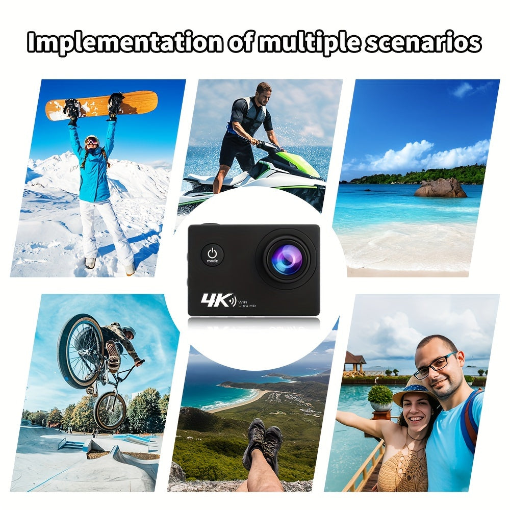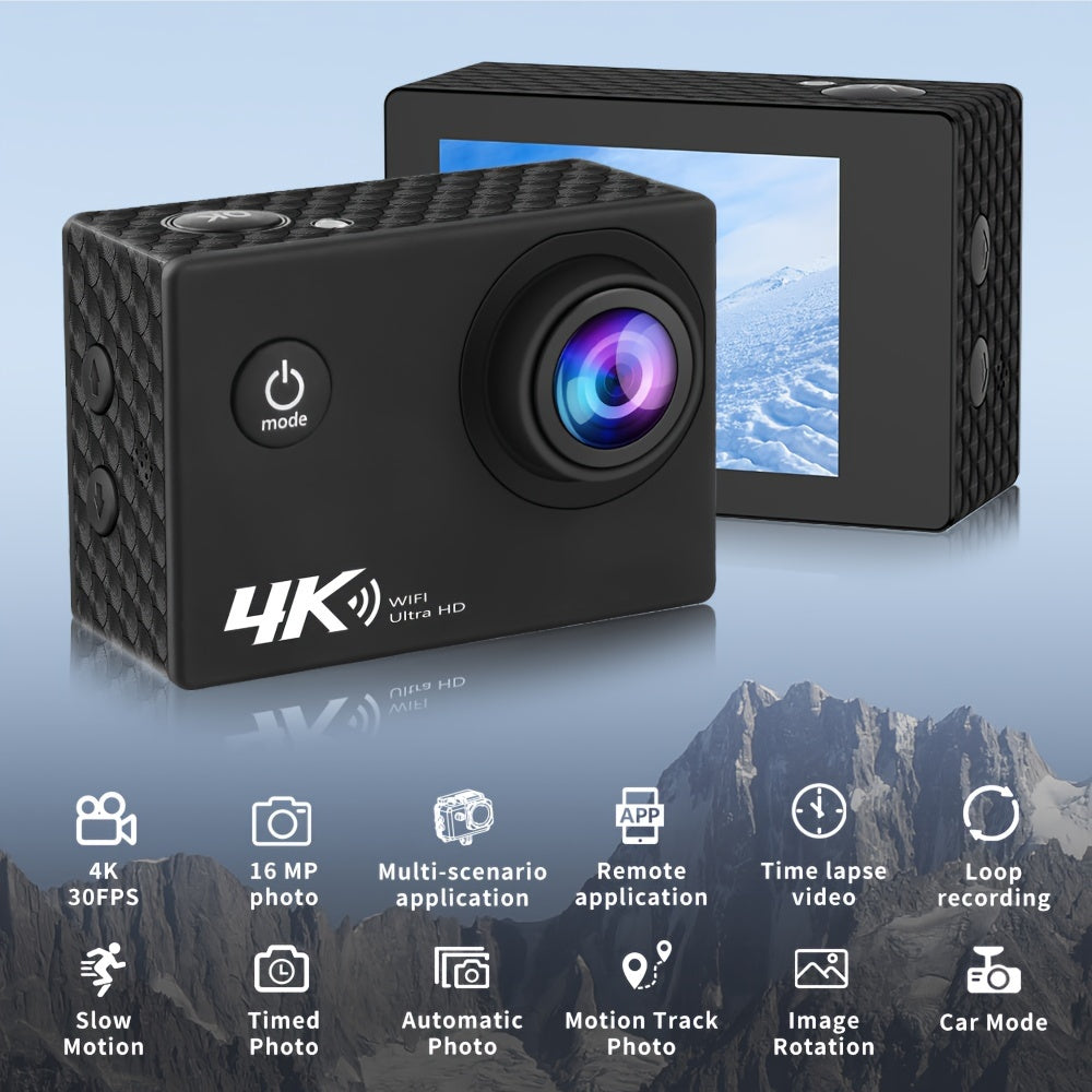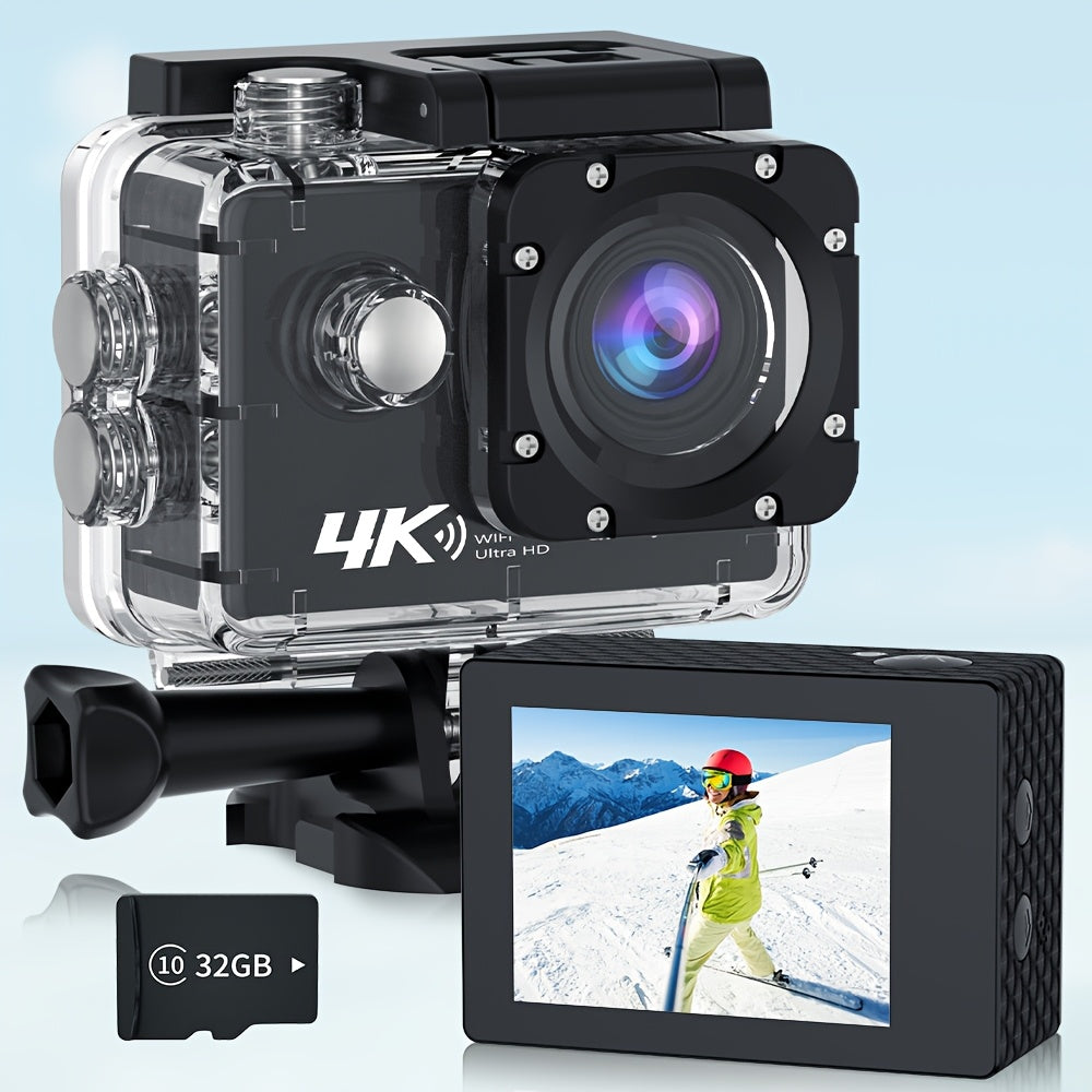 1 caméra d'action 4K Ultra HD avec Wi-Fi, 30FPS, stabilisation d'image numérique, exposition automatique, fente pour carte SD, batterie rechargeable, comprend une carte mémoire de 32 Go, format MP4, idéale pour les sports de plein air et les activités de