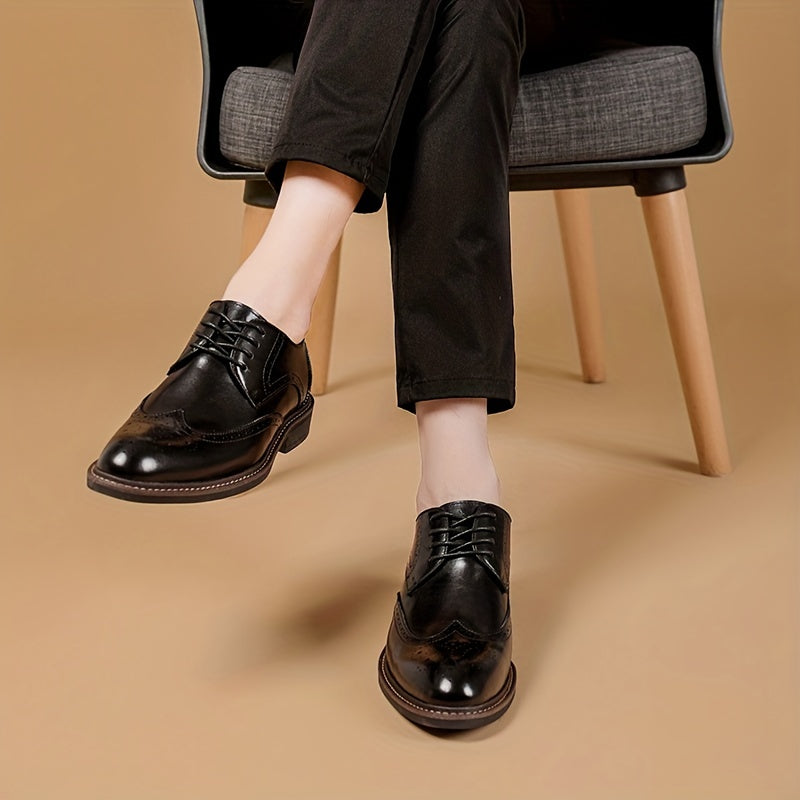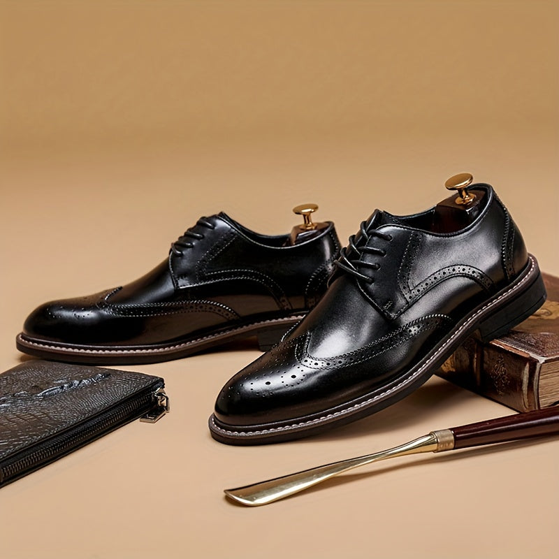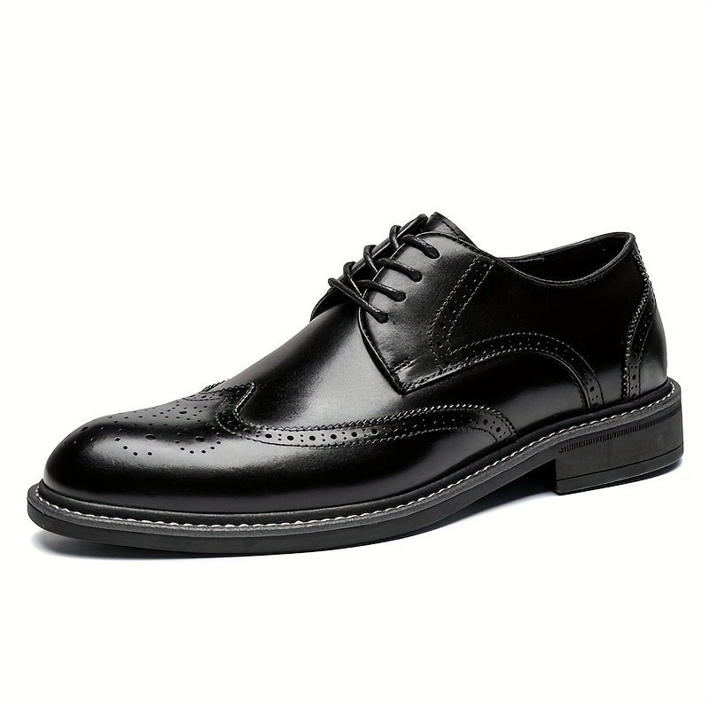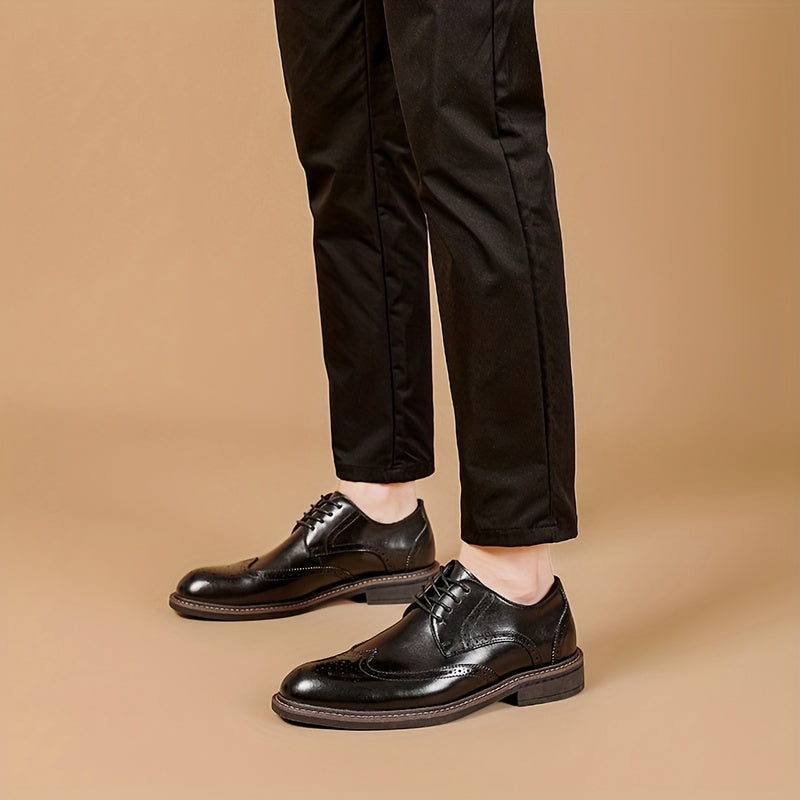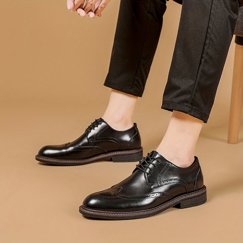 1 Pair Men'S Classic Brogue Wingtip Derby Shoes - Solid Color, Low Top, Round Toe, Lace-Up, Casual Business Formal Dress Shoes for All Seasons, Outdoor, Party, Wedding, Black Tie Events - Cow Leather Upper & Inner, Rubber Sole, Bovine Leather Insole