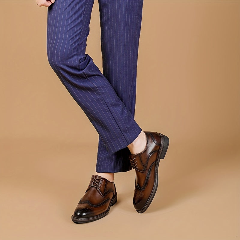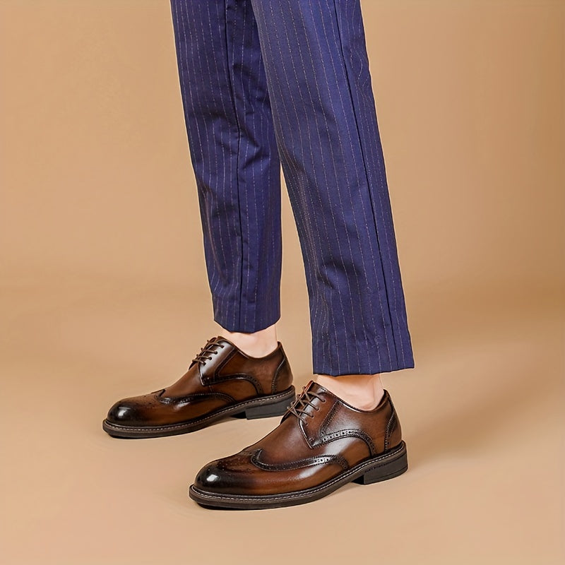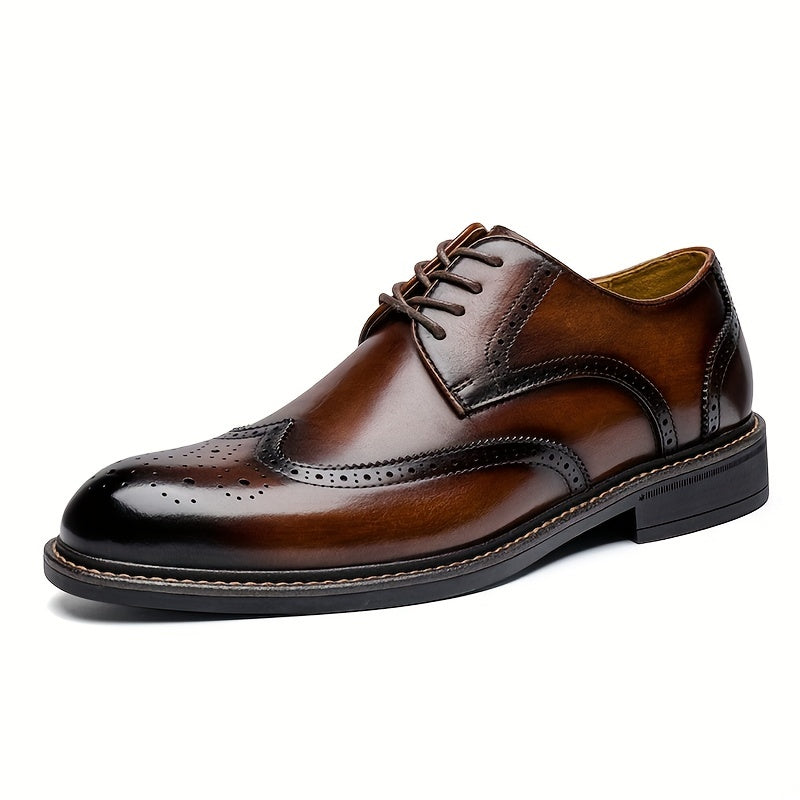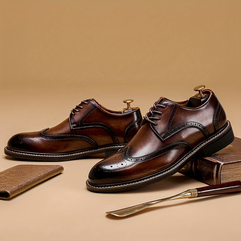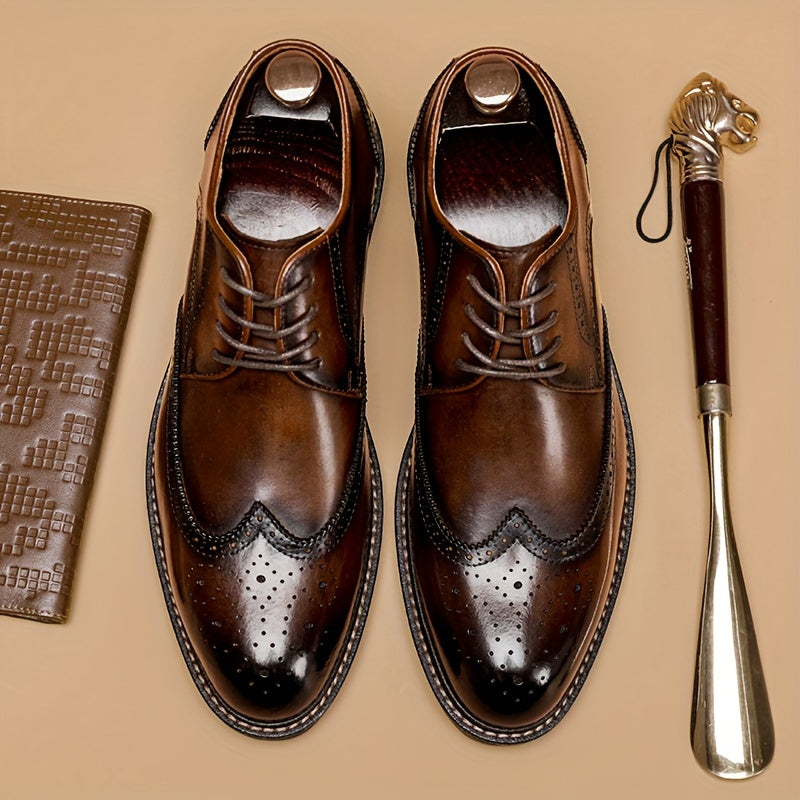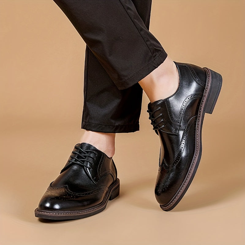 1 Pair Men'S Classic Brogue Wingtip Derby Shoes - Solid Color, Low Top, Round Toe, Lace-Up, Casual Business Formal Dress Shoes for All Seasons, Outdoor, Party, Wedding, Black Tie Events - Cow Leather Upper & Inner, Rubber Sole, Bovine Leather Insole