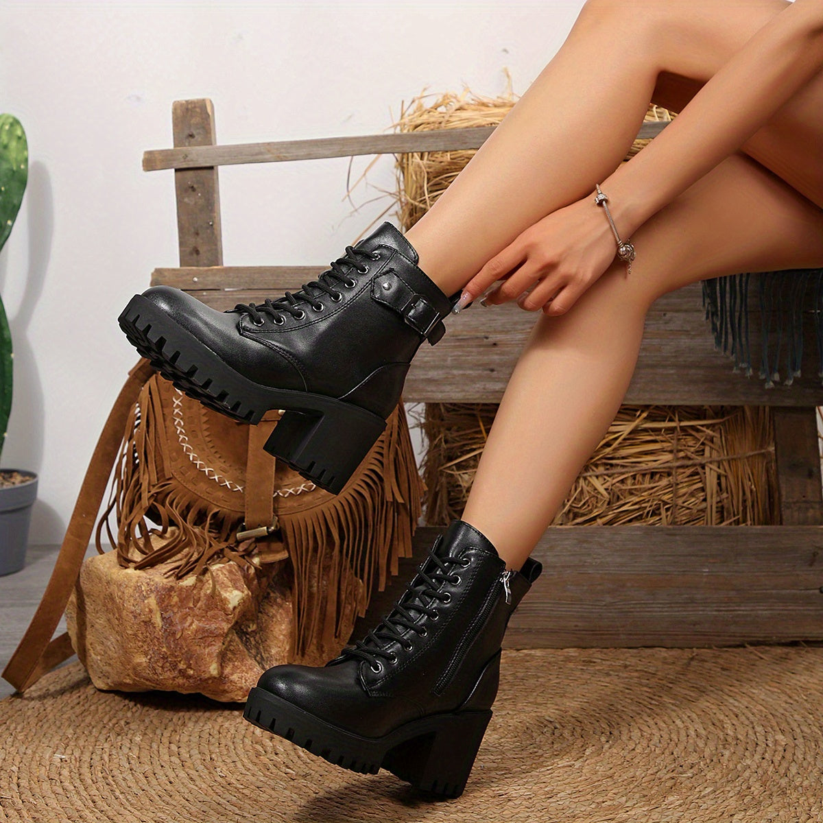 1 Pair of New Women's Fashion High Quality Platform Design Elegant Solid Color Thick-Heel Chunky Booties with Side Zipper and Lace-Up Detail, Stylish Retro Casual Ankle Boots – Essential for Autumn/Winter, Comfortable & Slip-Resistant