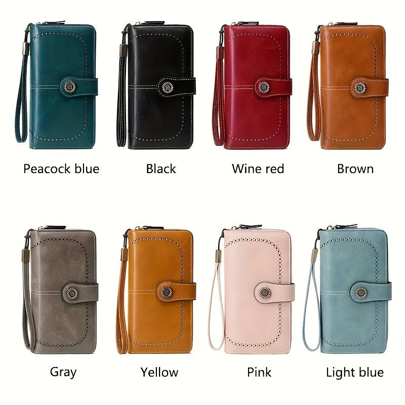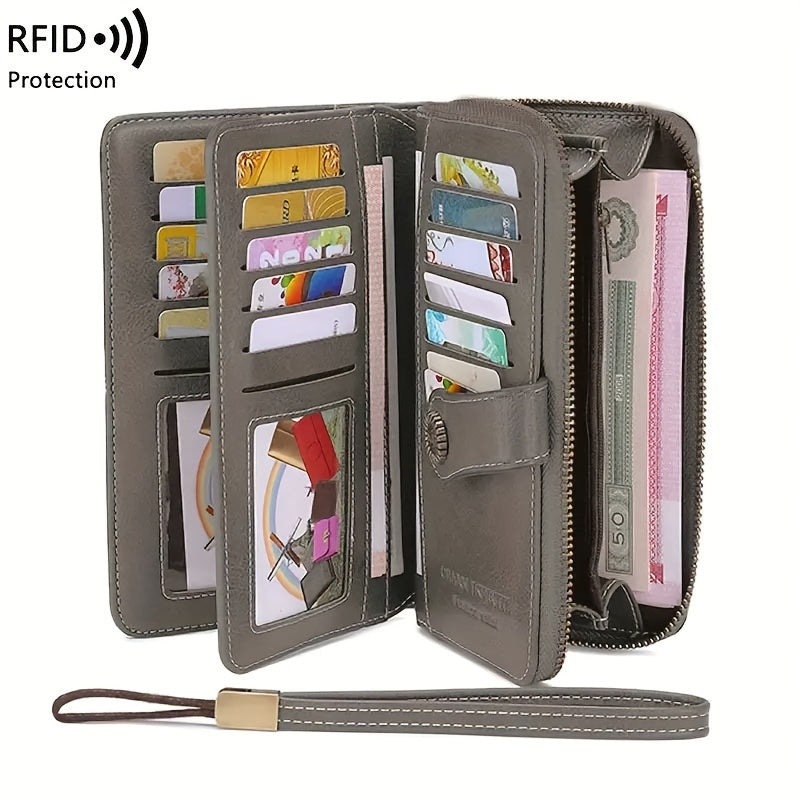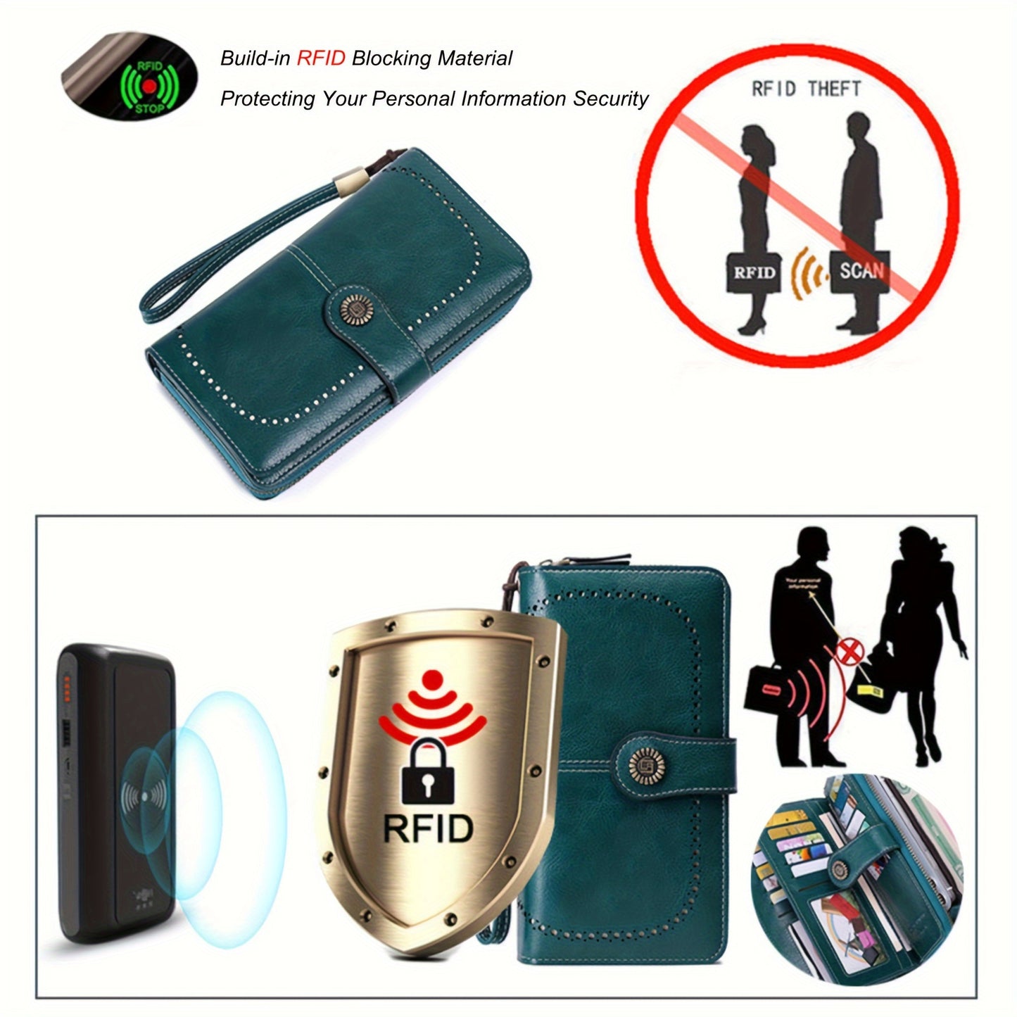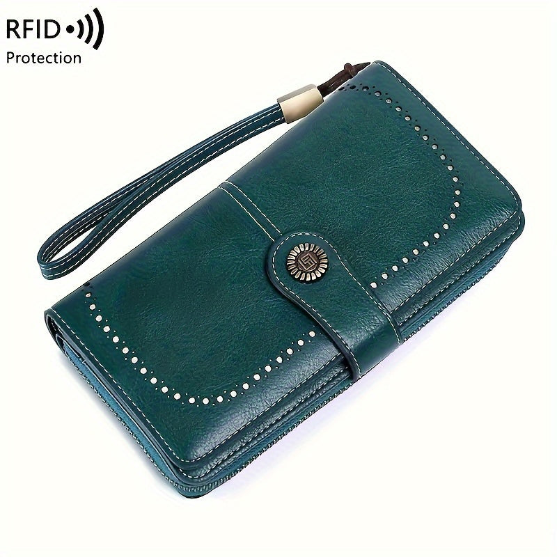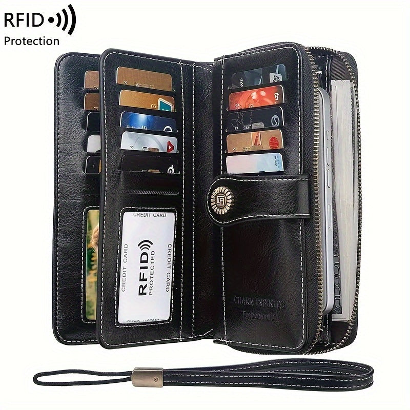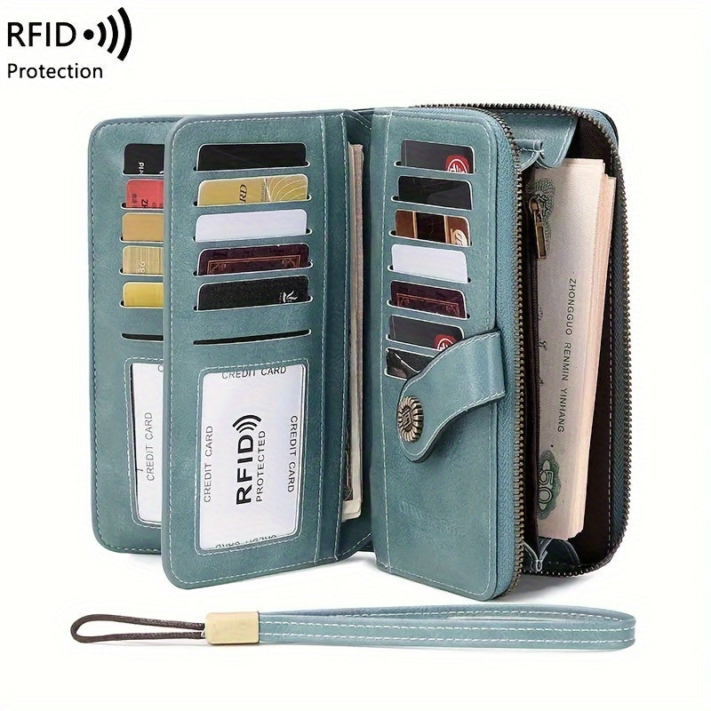 1 Pc RFID Blocking Retro Large Capacity Long Wallet PU Leather Solid Color Women's Purse Multi-Functional Zipper Wallet With Wrist Strap Passport Ticket Credit Card Holder Can Accommodate Large Screen Phone