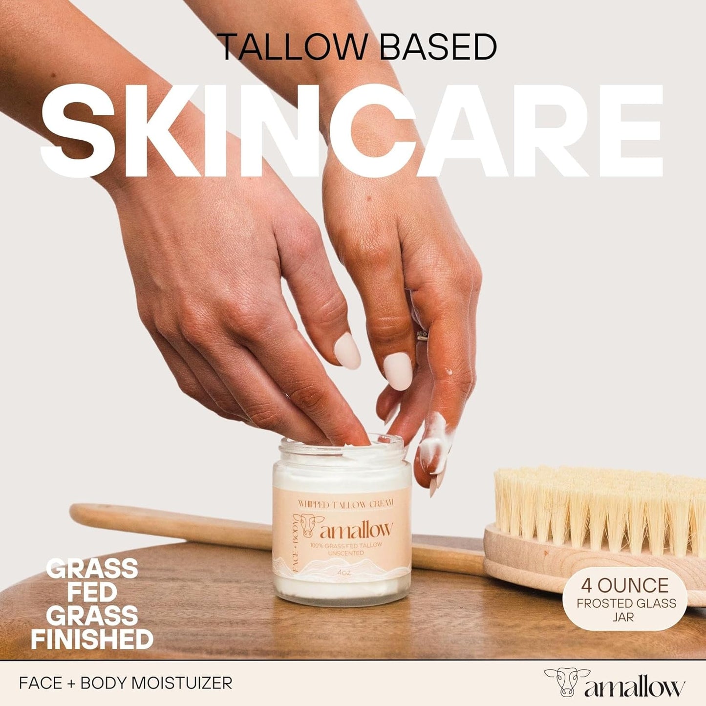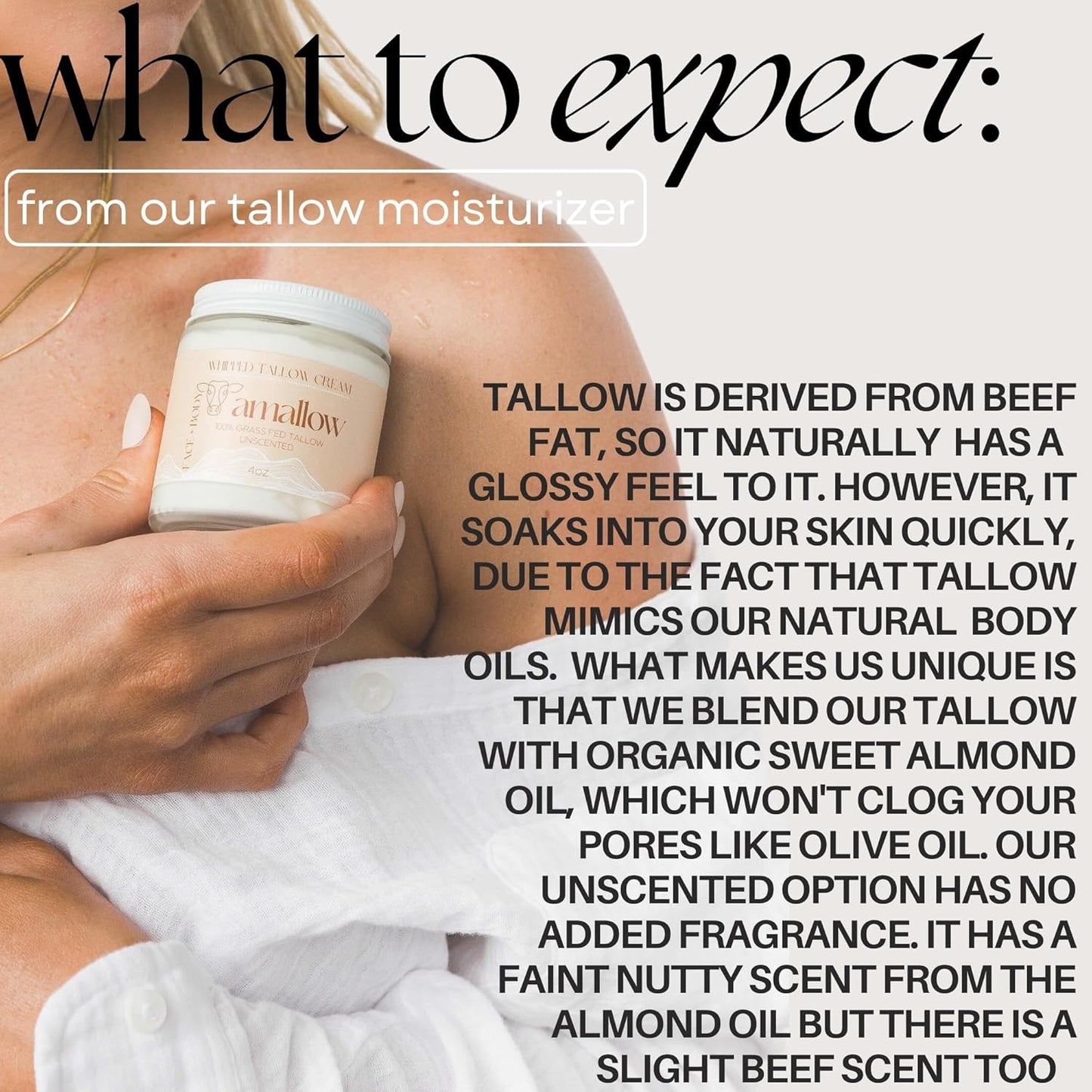 Active Ingredients: 100% Grass Fed Grass Finished Beef Tallow, Organic Cold Pressed Sweet Almond Oil