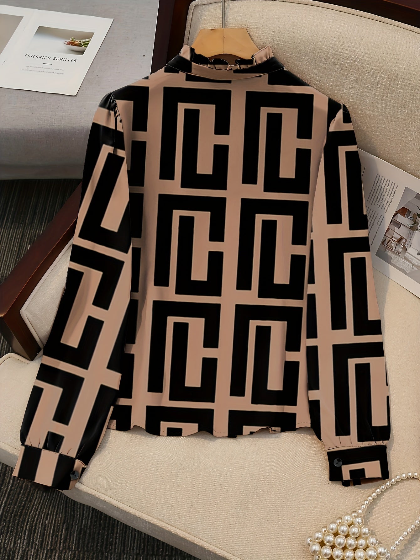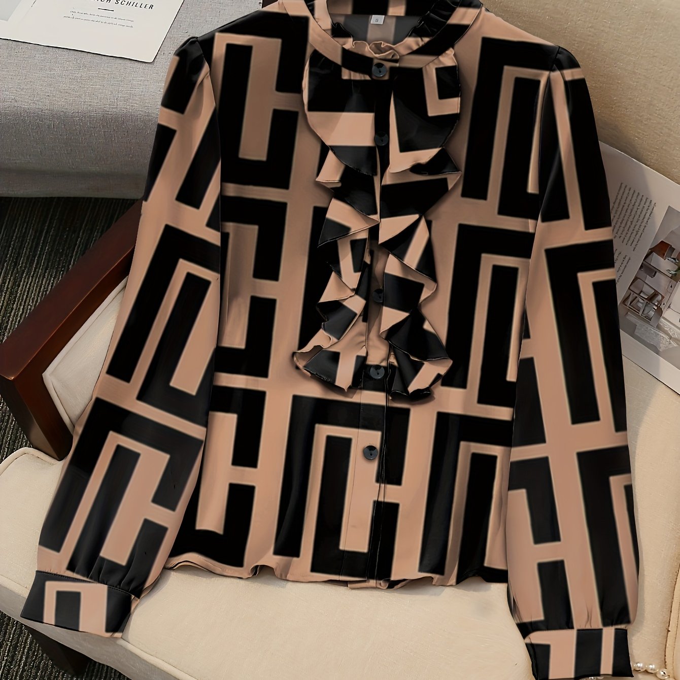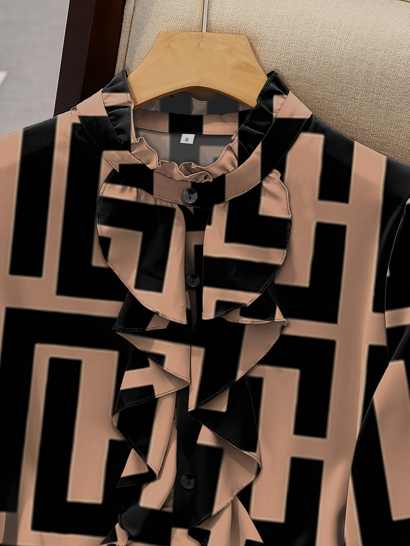100% Polyester Long Sleeve Elegant Geometric-Pattern Ruffle Stand Collar Blouse - Shirt for Women
