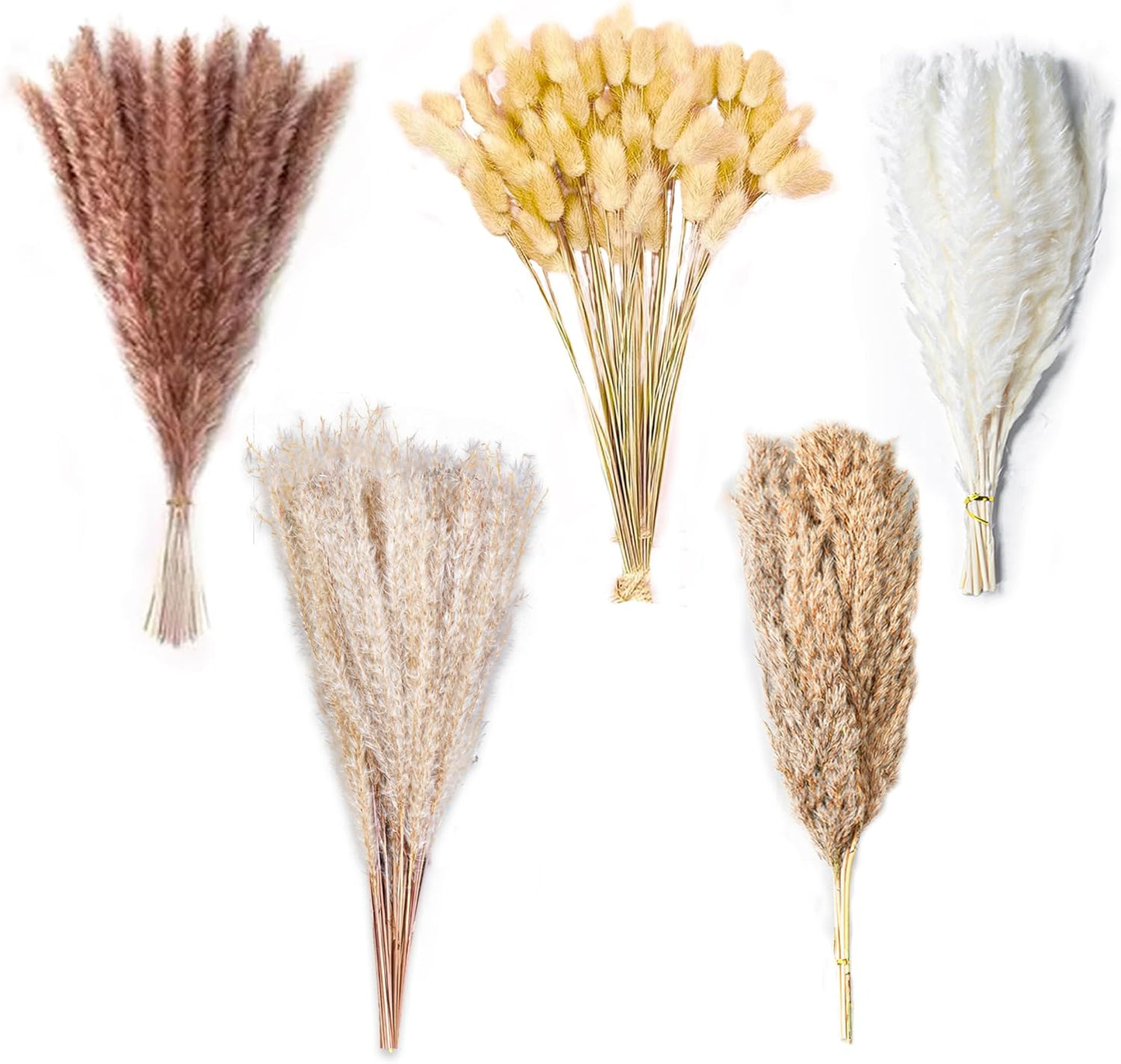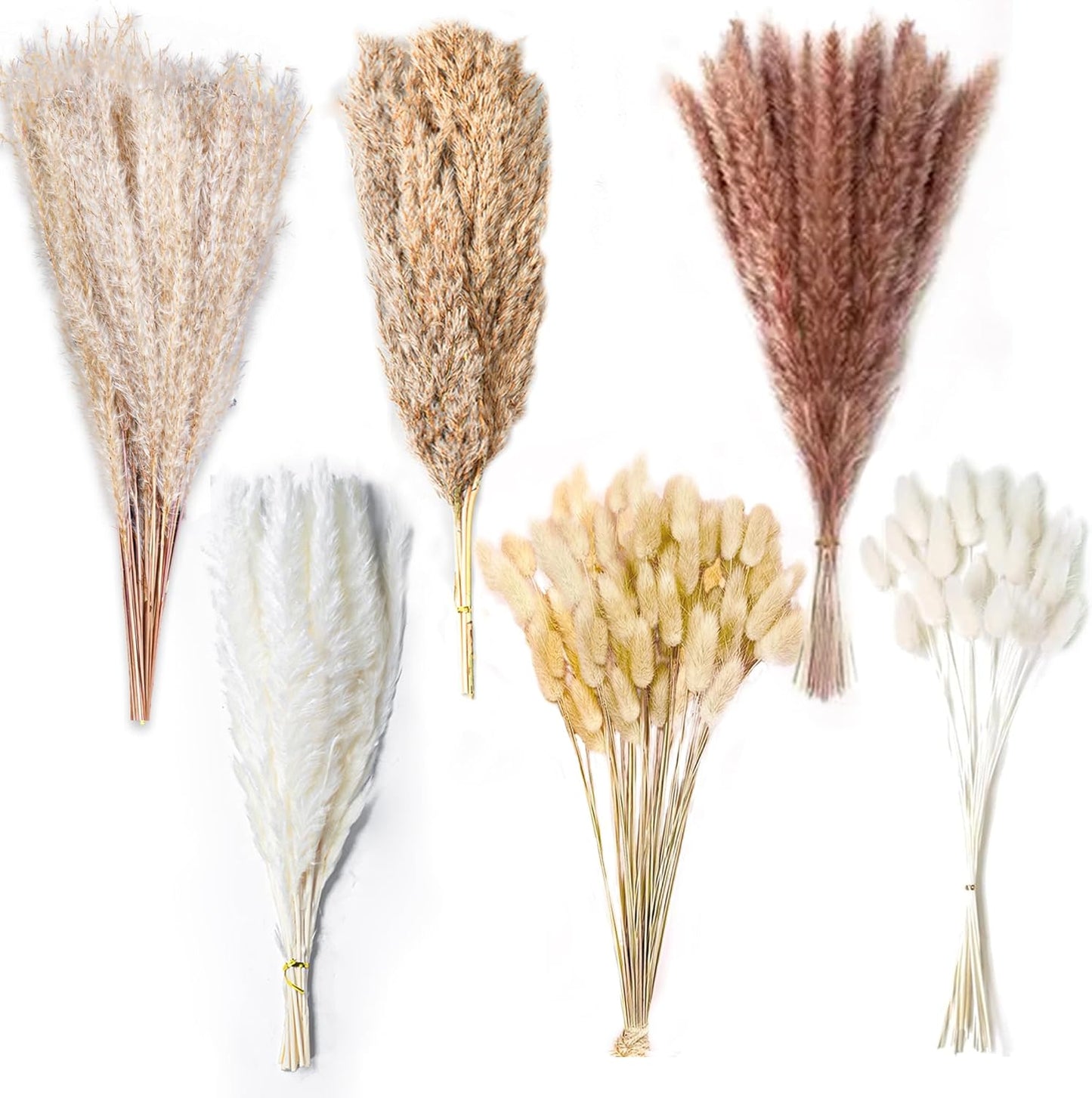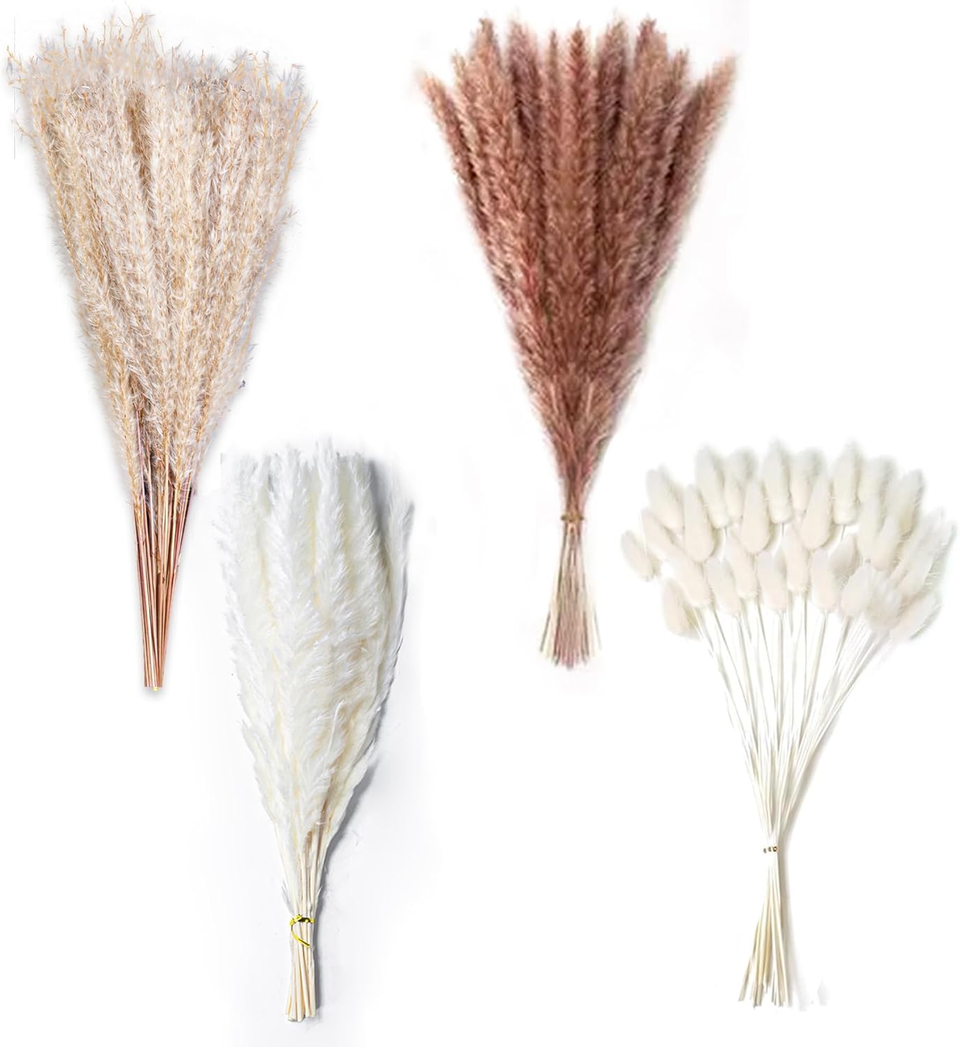 【MULTIPLE SCENES & QUANTITY】You will receive 100Pcs natural pampas grass, about 17.5 inches, including 15Pcs white dry pampas grass, 15Pcs brown dry pampas grass, 30Pcs reed grass, 32Pcs rabbit tail grass and 5Pcs gold ball,3Pcs Fluffy Pompas.