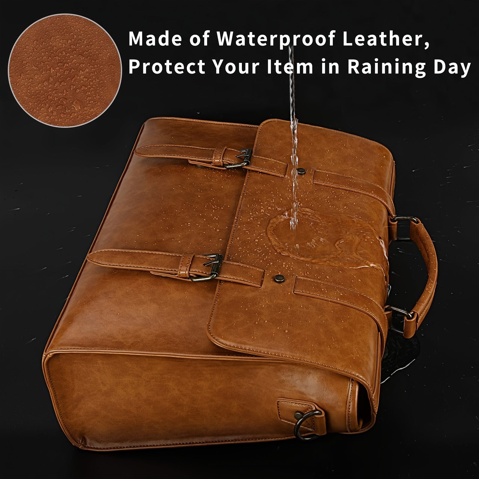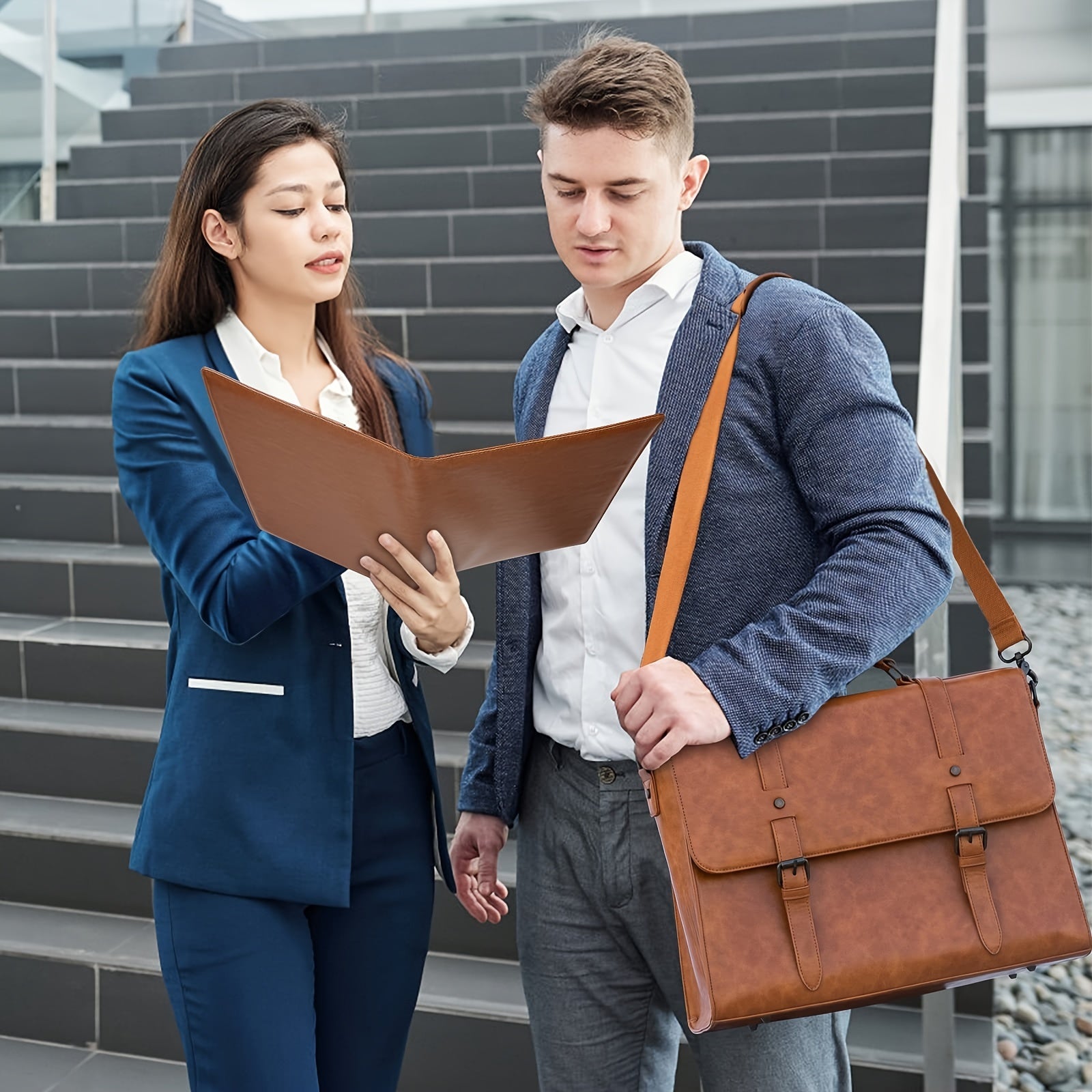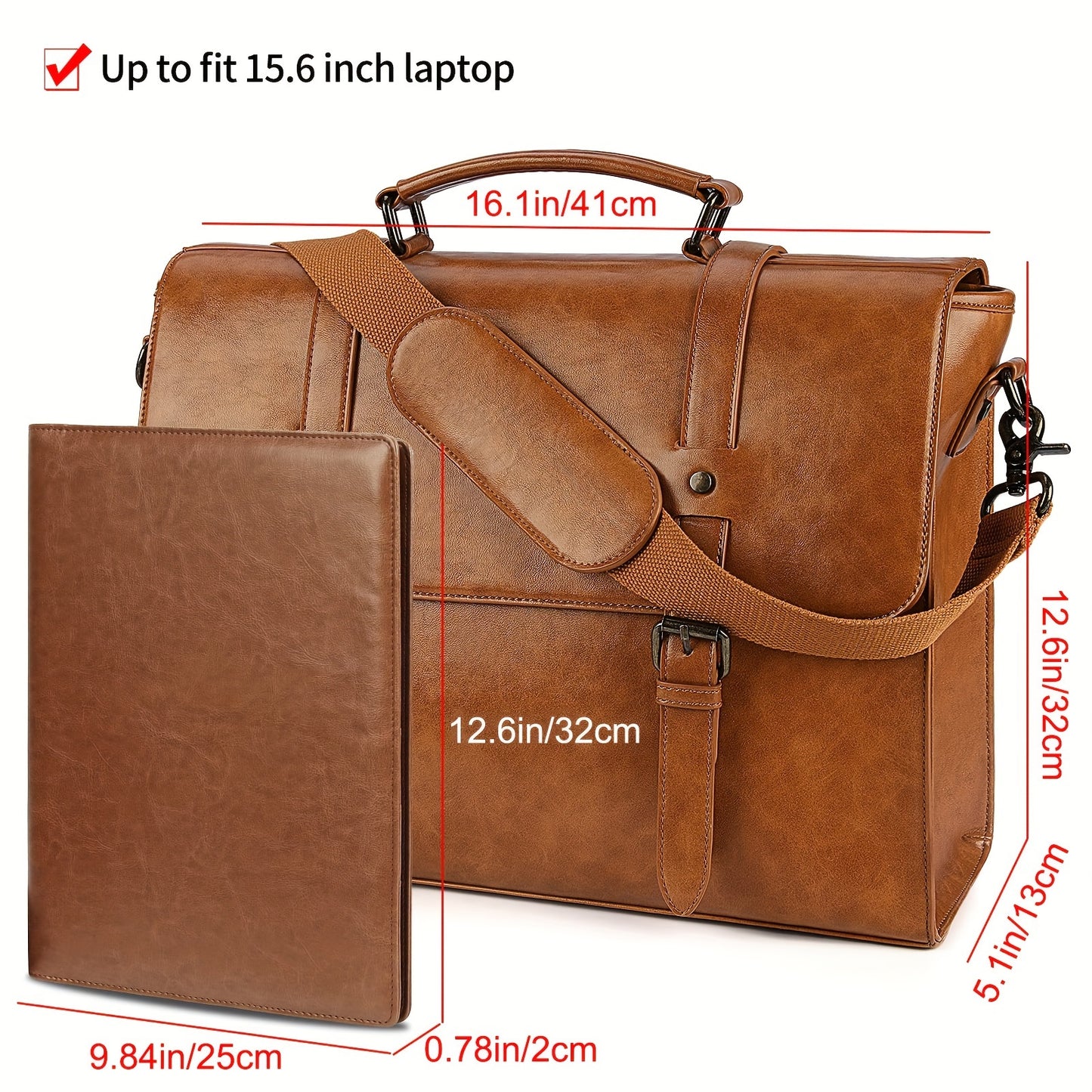 15.6 Inch Waterproof PU-Leather Vintage Laptop Briefcase, Large Crossbody Bag Shoulder Bag with Folder for Office College Computer, Brown