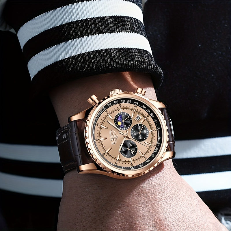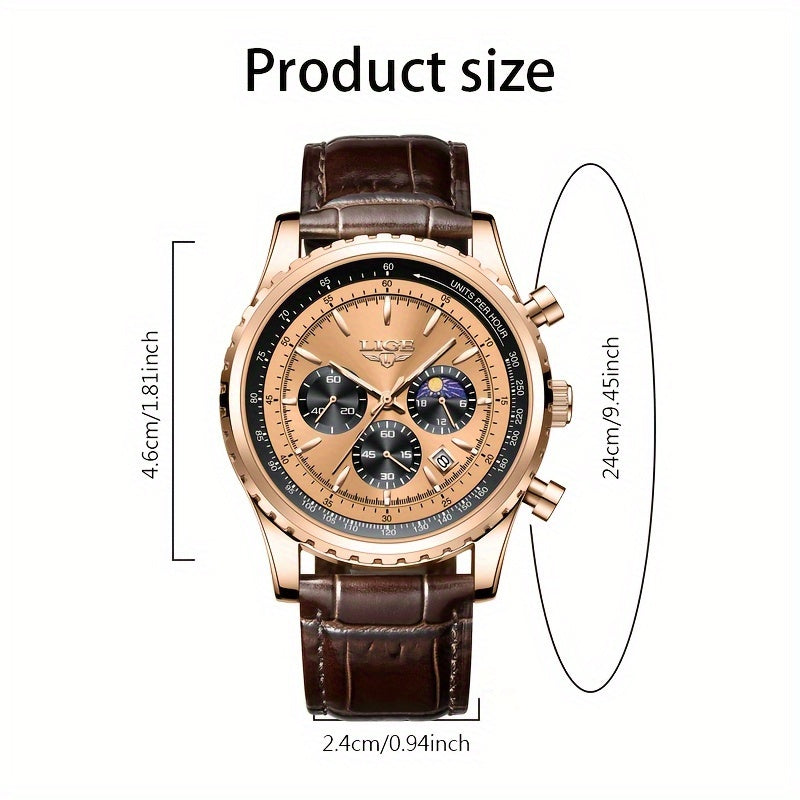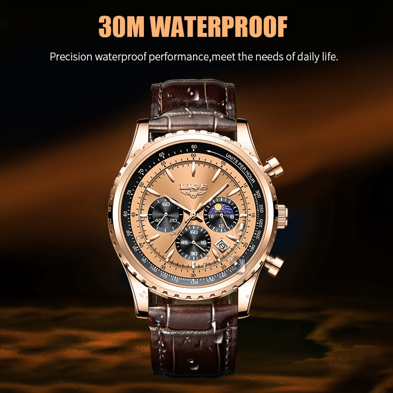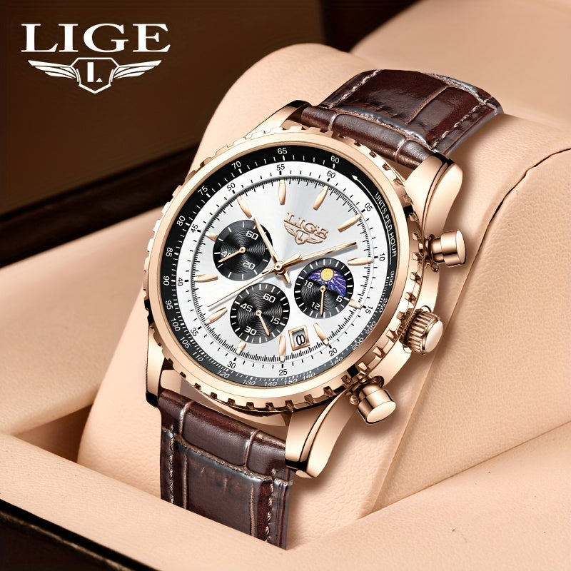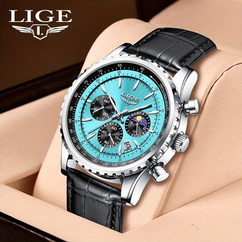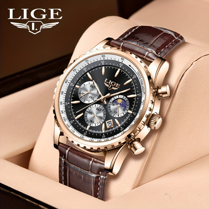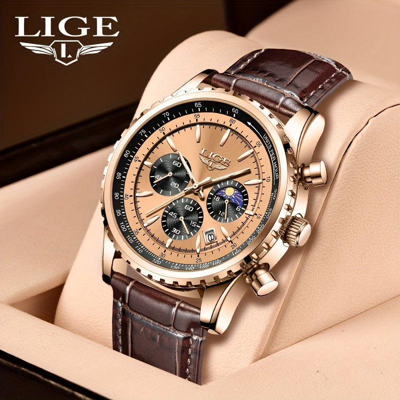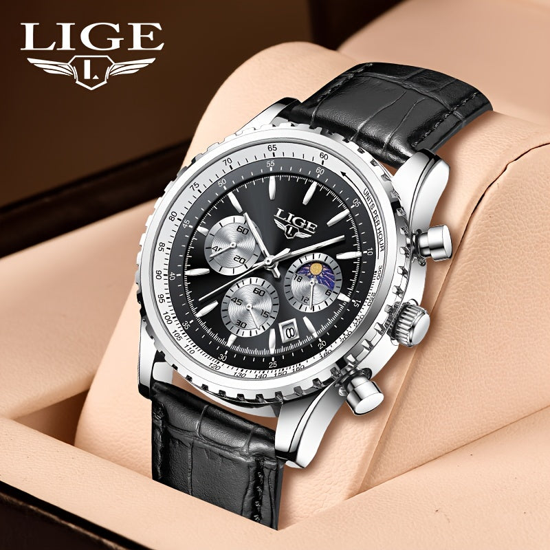 1pc LIGE Men's Luxury Quartz Watch - Glitter Embellished, Sports Alloy Case, Faux Leather Strap, Reliable Button Battery Powered Timepiece