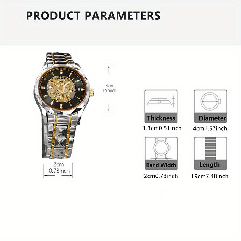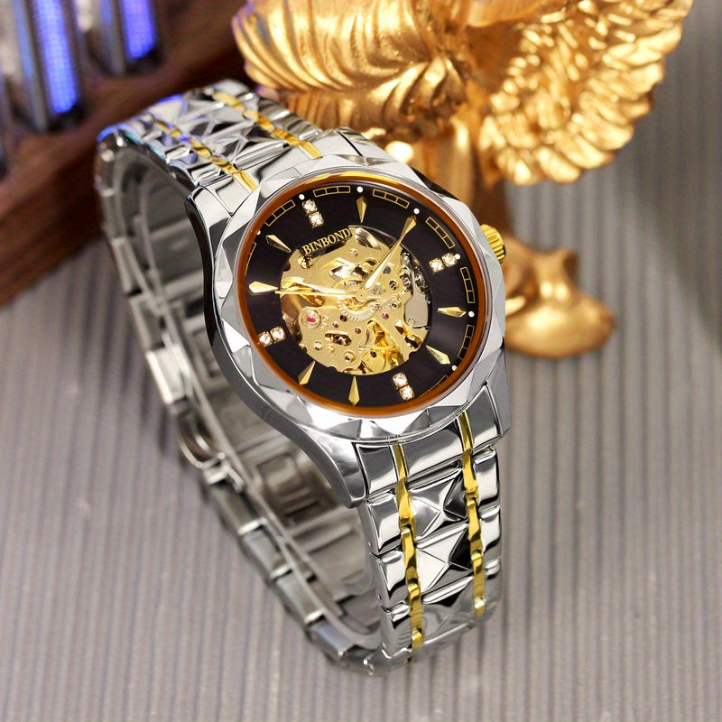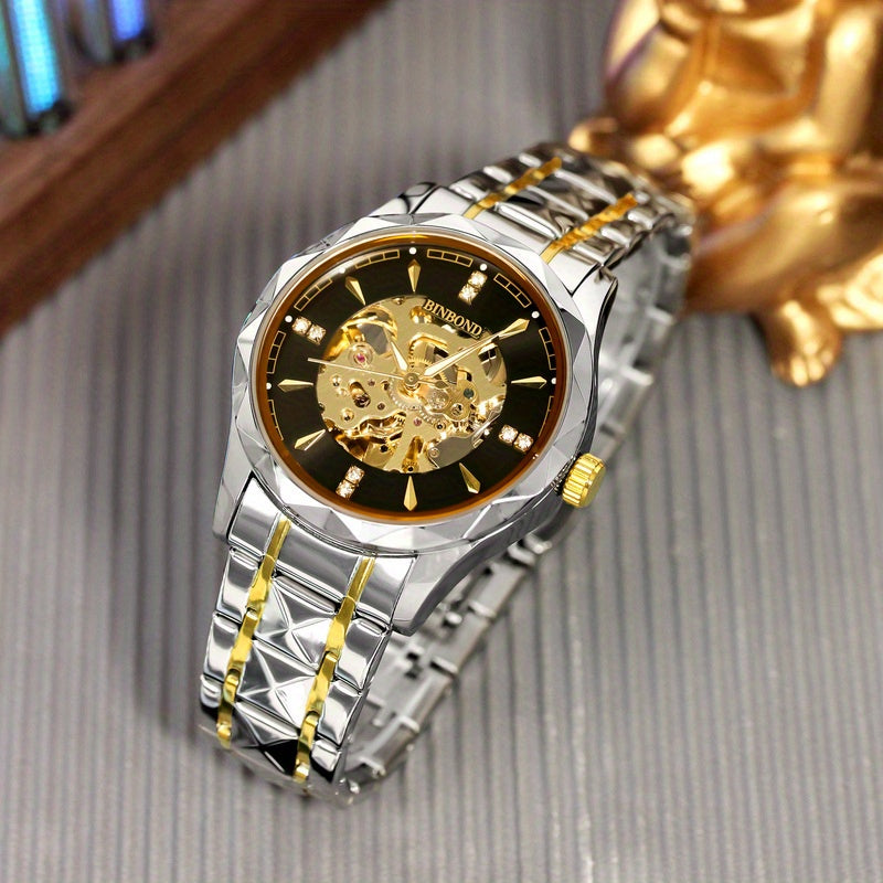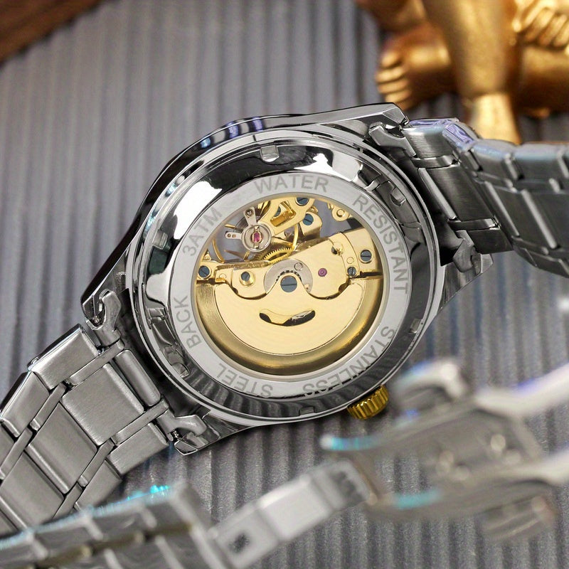 1pc Men's Automatic Mechanical Watch with Golden-Tone Roman Numerals & Black Dial, Silvery-Tone Steel Band, Casual Elegant Design for Casual Attire, Stylish Accessory, Versatile Wristwatch, Classic Design, Elegant Dial, Precision Engineering, Automatic Mo
