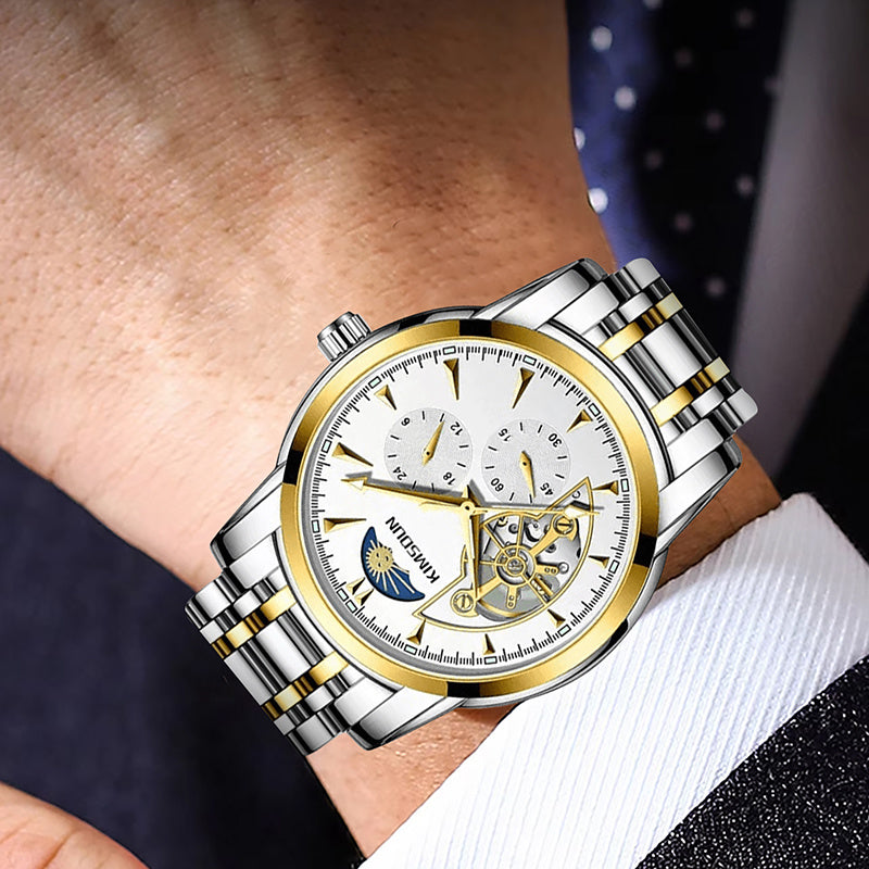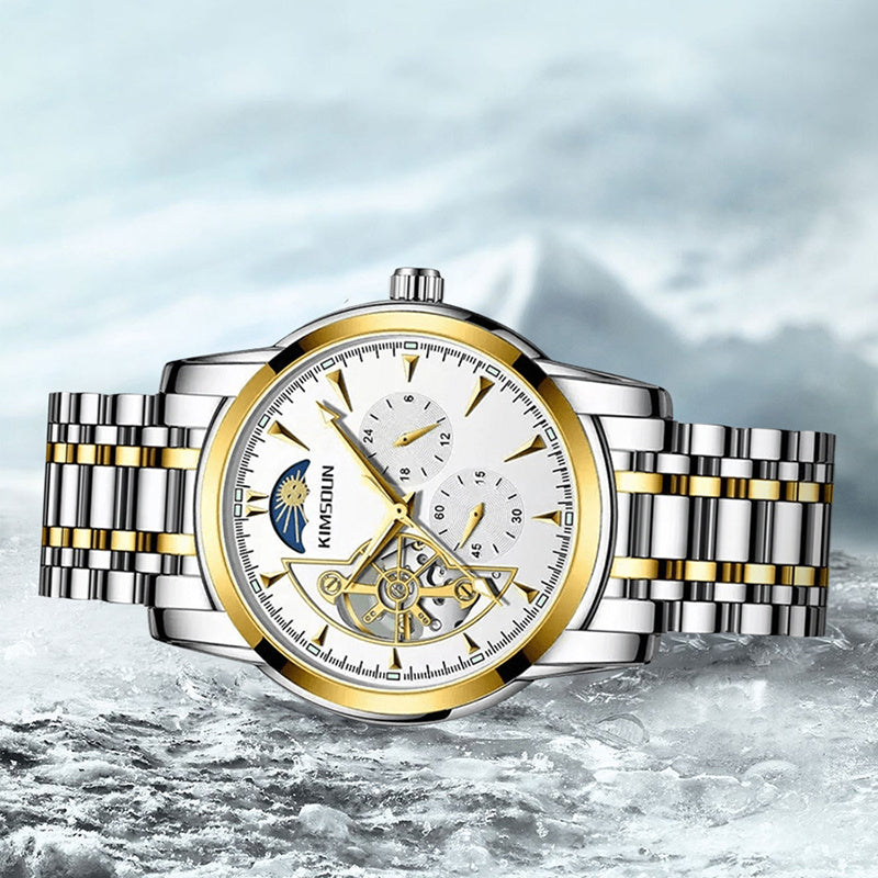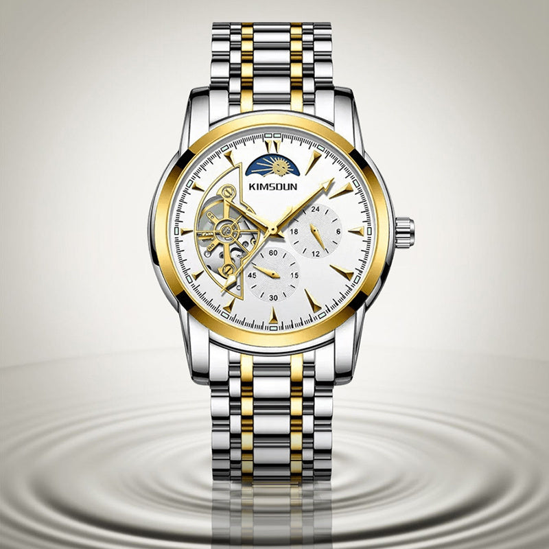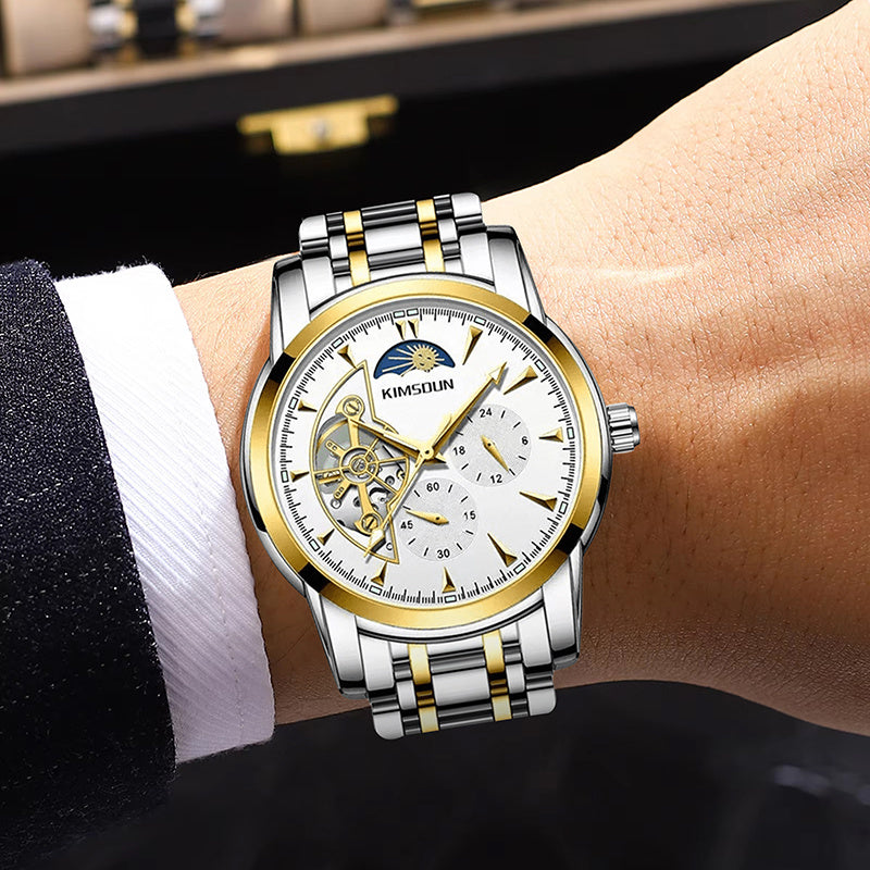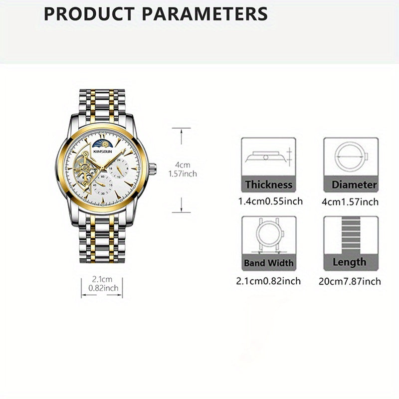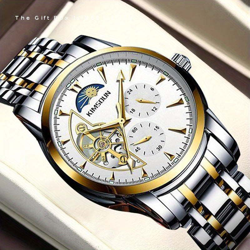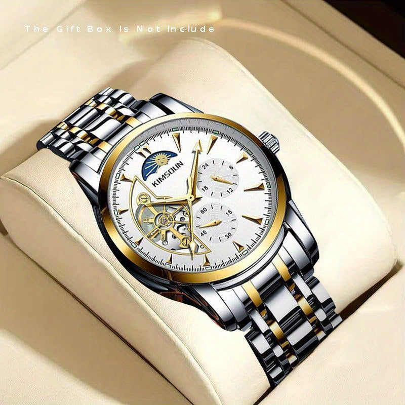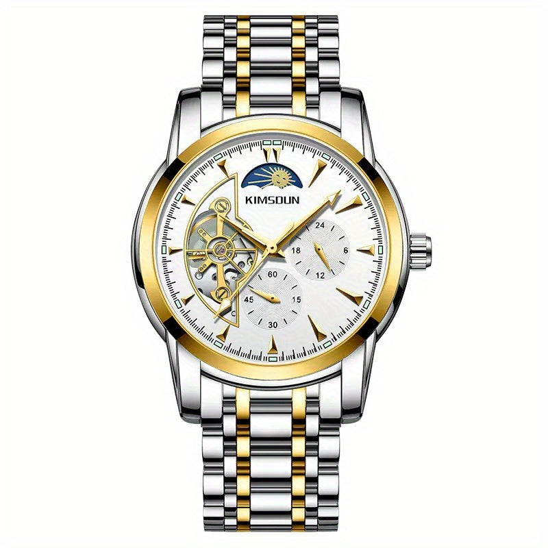 1pc Men'S Casual Style Automatic Mechanical Watch with Sun and Moon Stud Scale, White Steel Strap, Round Alloy Case, Pointer Display, Mechanical Movement, No Battery Required, Without Battery