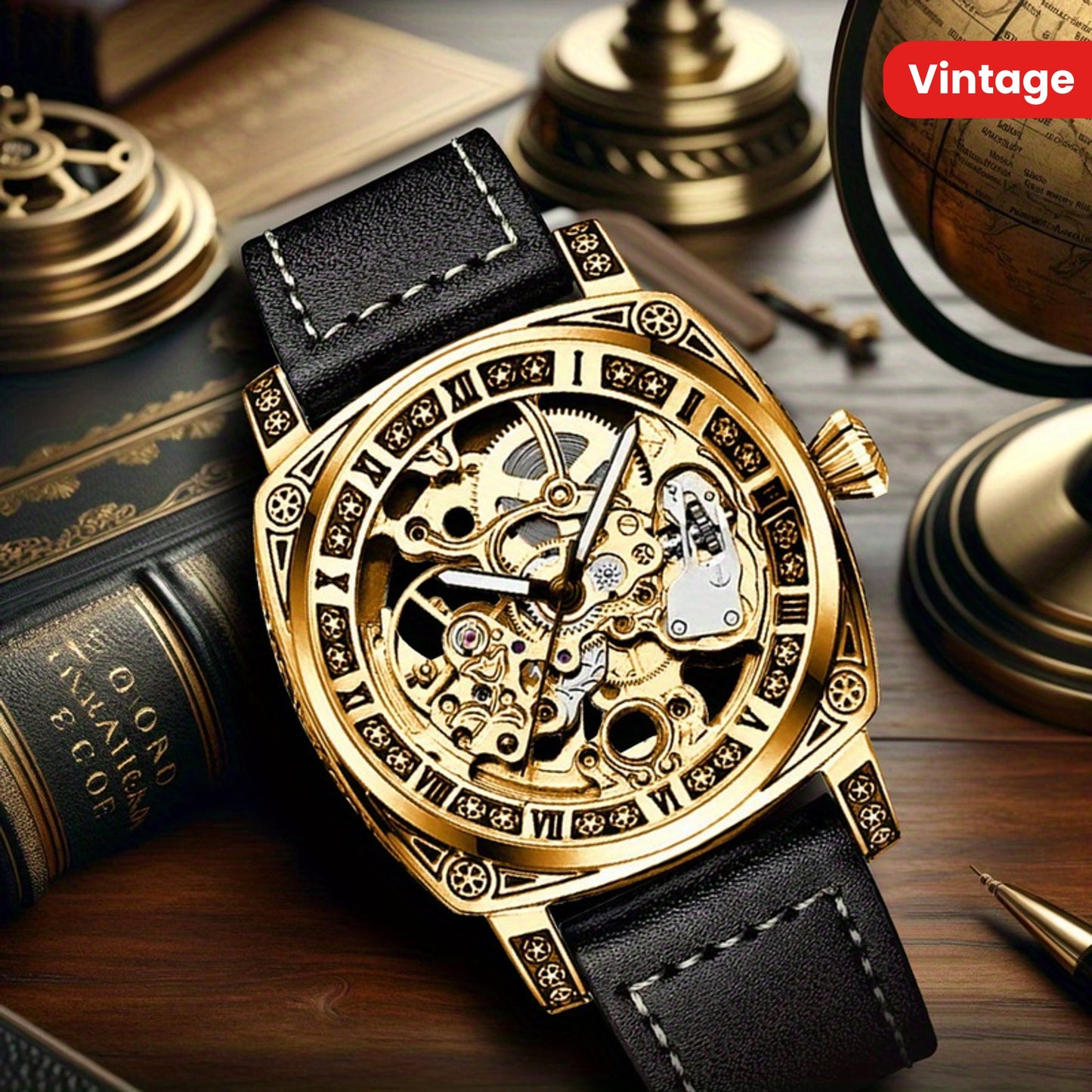 1pc Men's Elegant Golden-Tone Mechanical Watch with Luminous Hands, Black Faux Leather Strap - Vintage Style, 1181.1inch Water-Resistant, Automatic Self-Winding, Zinc Alloy Case, Display Watch|Elegant Timepiece|Intricate Mechanical Design
