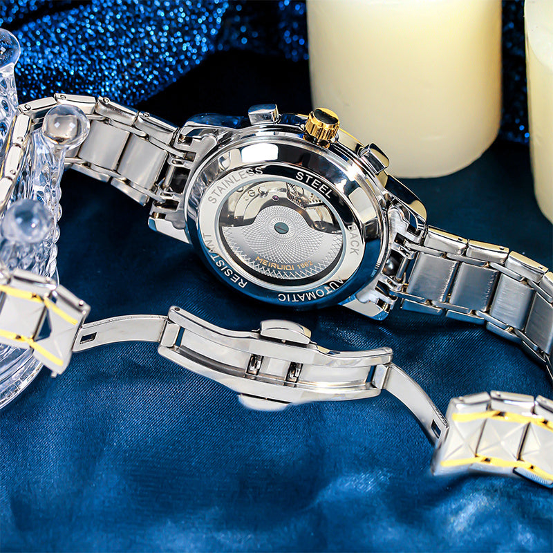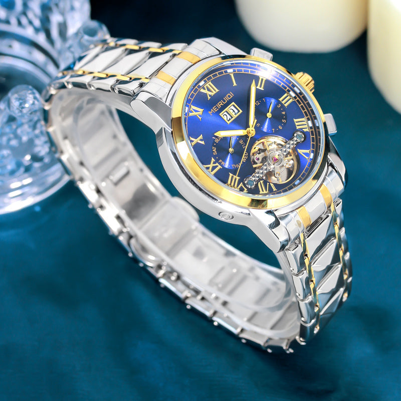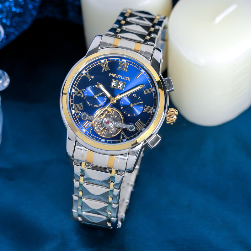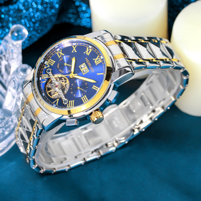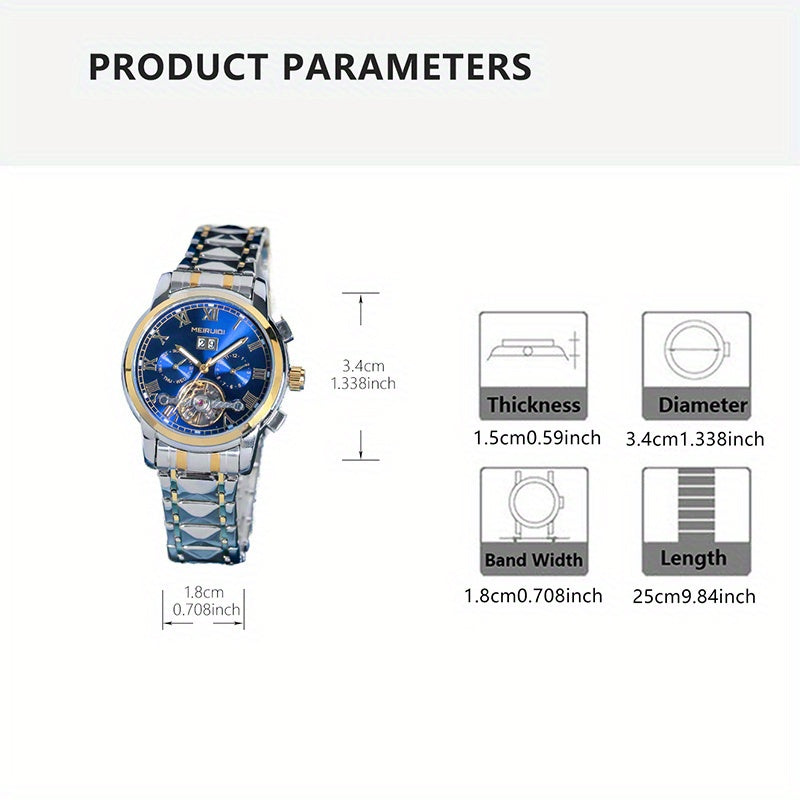 1pc Men'S Luxury Automatic Mechanical Watch - Blue Dial with Roman Numerals, Golden-Tone Steel Strap, Self-Winding Tourbillon Movement, No Battery Needed - Elegant Formal & Casual Watch for Everyday Special Occasions - Ideal Gift for Men, Vacation Timepie