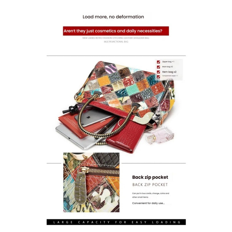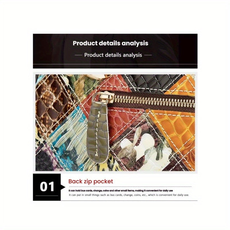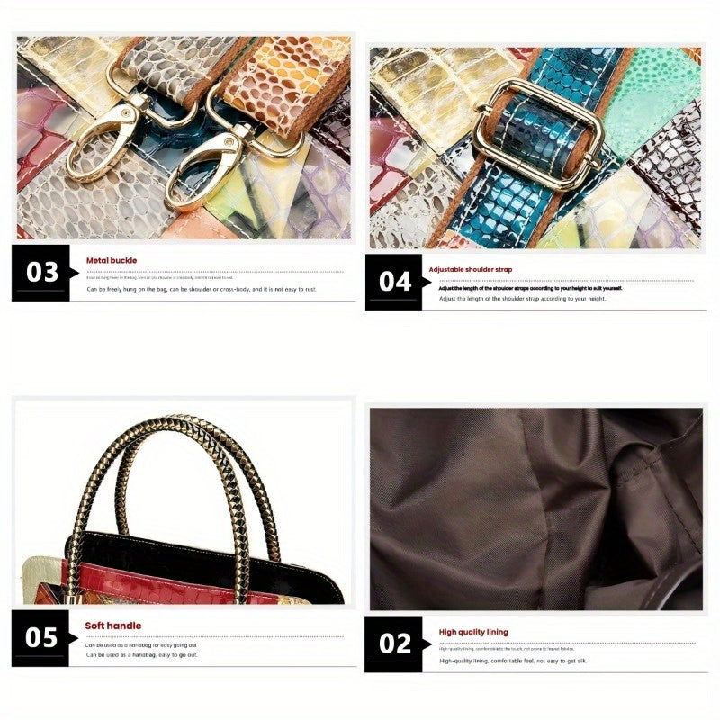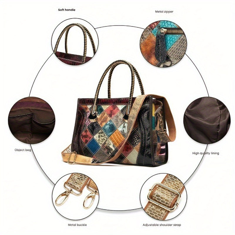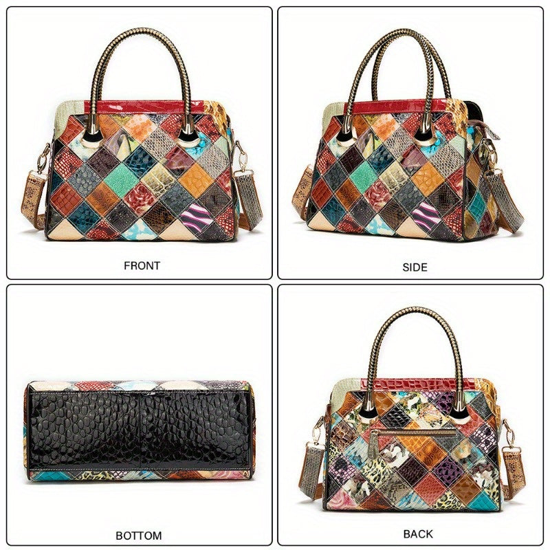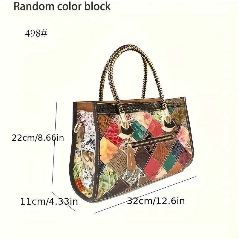 1pc New Women's Portable Color Block Patchwork Cowhide Handbag, Retro Splicing Design with Removable Shoulder Strap, Large Capacity, Imitation Crocodile & Snake Patterns, Geometric Pattern, Zipper Closure, Perfect for Daily Use & Stylish Outfits