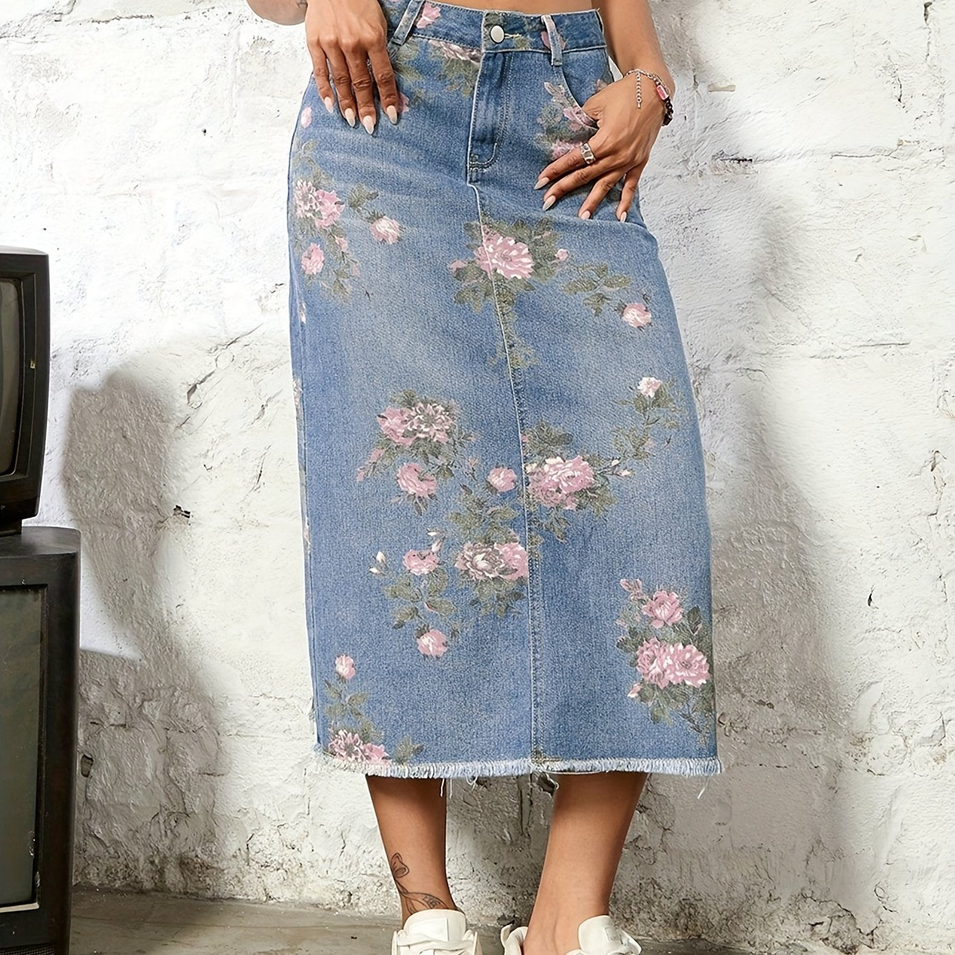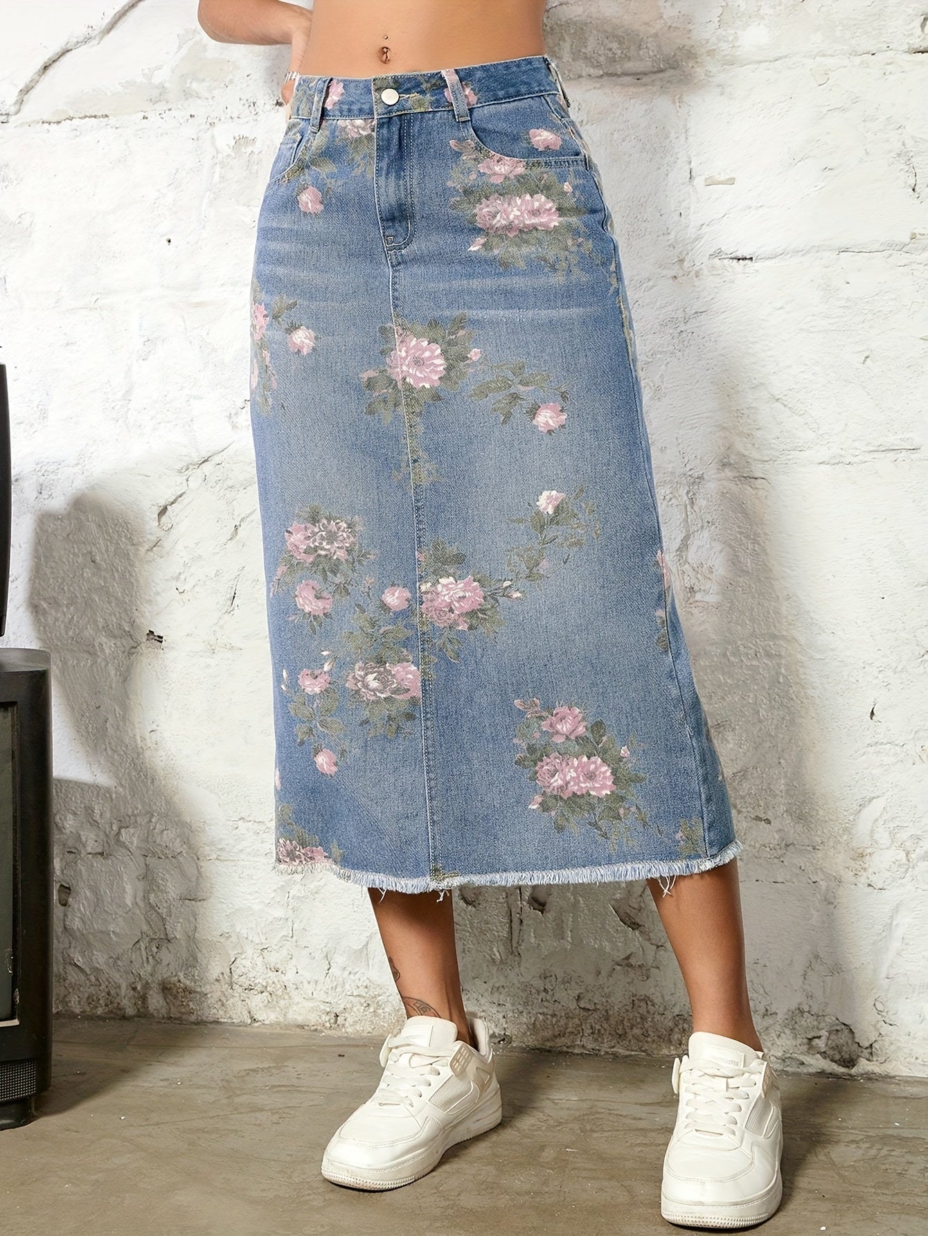 1pc Vintage High Waist Midi Denim Skirt with Floral Print and Back Split, Non-Stretch Polyester, Straight Cut, Woven Applique Detail for Spring/Summer/Fall