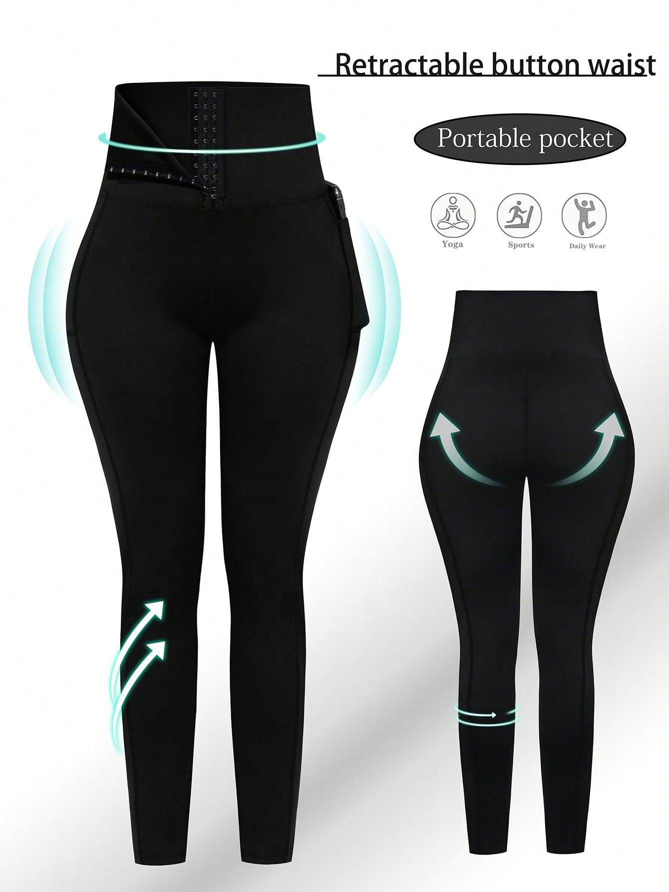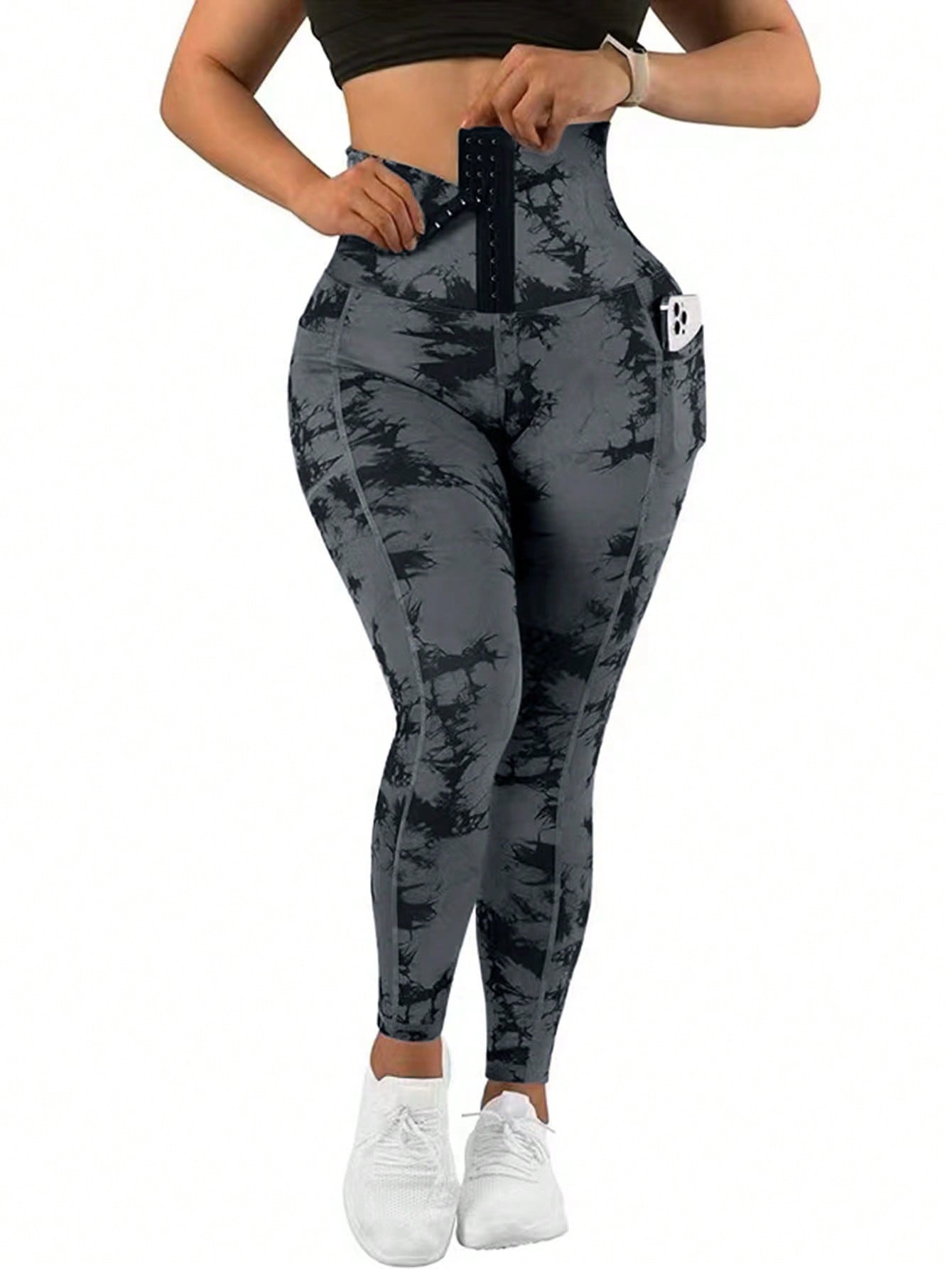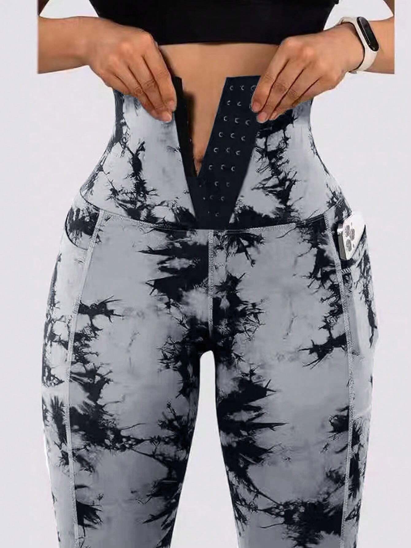 1pc Women High Waist Tie-Dye Random Print Pocket Buttoned Sports Yoga Pants, Outdoor Cycling Running Tennis Leggings, Tummy Control Shapewear